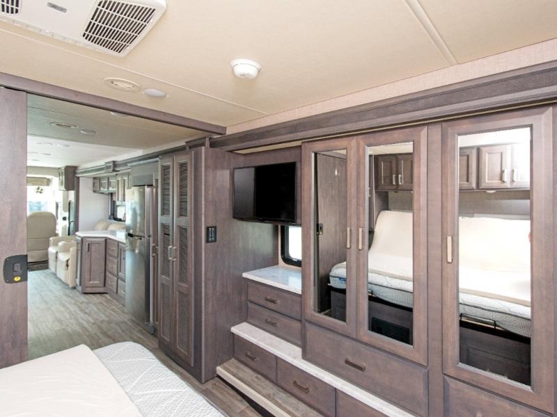 The Thor Miramar 35.2 combines luxury and convenience with a full-wall slide for expansive living space and a Tilt-A-View™ king bed for ultimate relaxation on the road.