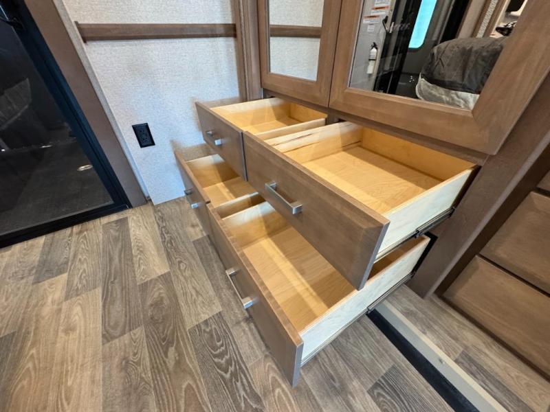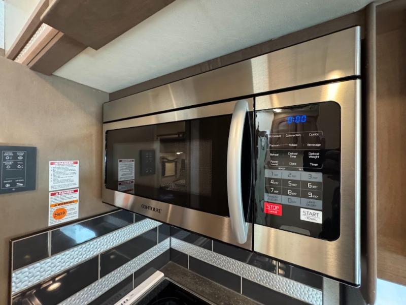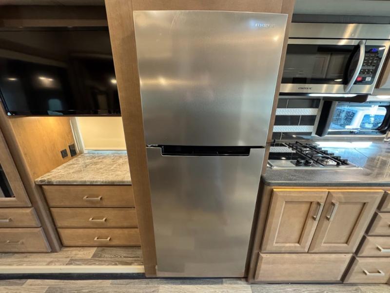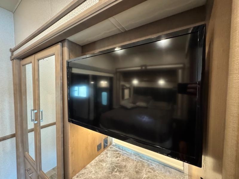 Load up the side-by-side and invite your friends along for the trip in this spacious toy hauler coach. During the day you can set up the patio deck that includes three seasons patio doors with a screen and privacy panels. You'll find the main living area cozy with its Dream dinette and sofa bed, plus there is a 40" LED TV here. The chef can prepare dinner on the two burner gas cooktop, or use the stainless steel convection microwave, and check out the residential refrigerator for all your perishables. The queen bed slide out in the private bedroom will provide a great night's rest, and you'll enjoy your own 32" LED and a wardrobe for your clothes. This model also includes a 40" LED exterior TV; that makes four TV's for all your entertainment needs!