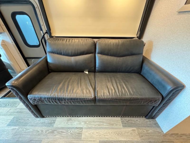 With any Outlaw Class A gas motorhome toy hauler you will appreciate the garage Drop-Down Zero-G ramp door with a snap-in patio system and a power awning. The remote fuel filling station with an auxiliary fuel tank, pump and a nozzle will allow you to keep your toys ready for adventure, and there is a Pet-Link multi-purpose tie-down if you've brought your furry friends along. Each model is constructed with Vacu-Bond laminated roof, walls and floor with block foam insulation, a full-body paint package with gel coated sidewalls, and a premium one-piece TPO roof for durability. The interior will have you feeling at home with leatherette furniture, solid surface kitchen countertops, satin finish cabinetry, plus a glass shower door for added luxury. All of your power needs will be met with an Onan RV QG 5500 gas generator, four auxiliary house batteries, plus a 100-watt solar charging system with a power controller. Choose an Outlaw Class A gas toy hauler coach and you'll never look back!