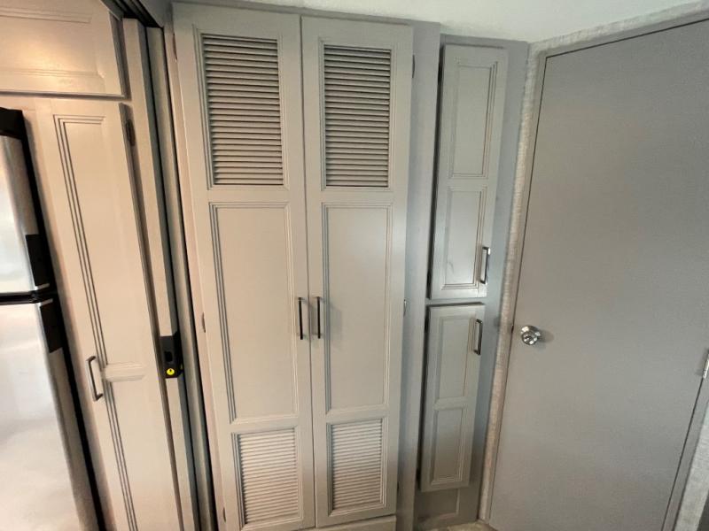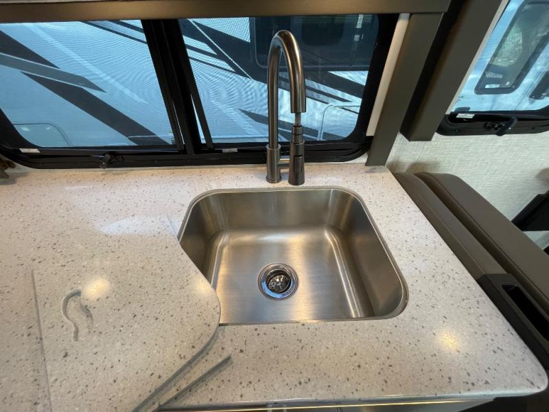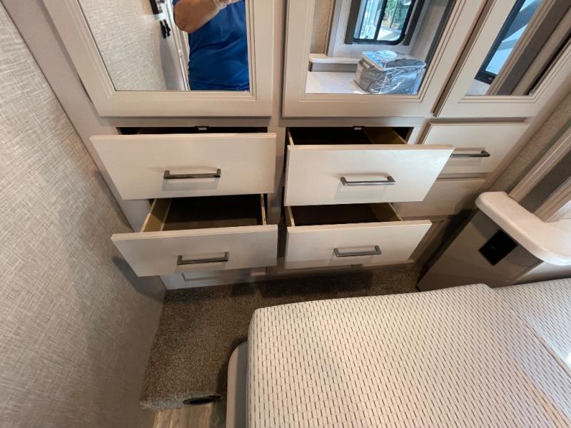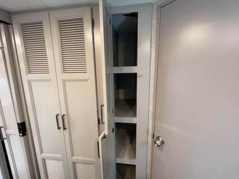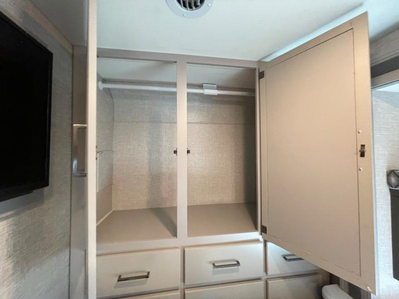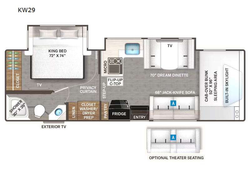 Whether you are looking for a private bedroom or a semi-private bedroom in your next coach, this Quantum gives you the choice. There is a privacy curtain to close off the king bed slide in back including the wardrobe and the 32" TV, or you can close the sliding door to create a private bedroom to include a full bathroom, linen storage and a closet that is prepped for a washer/dryer option. The mid-coach entry gets you inside quickly with easy access to the refrigerator or the jack-knife sofa, and the slide out in this area offers a 70" Dream dinette and an L-shaped counter with microwave overhead and a stainless steel sink plus flip-up countertop extension. The kids or your guests can sleep on the cab overhead bunk or any furniture once converted. The built-in skylight over the cab will be great for added light from the moon at night or sun during the day. And the exterior offers a 40" TV to enjoy while outdoors.