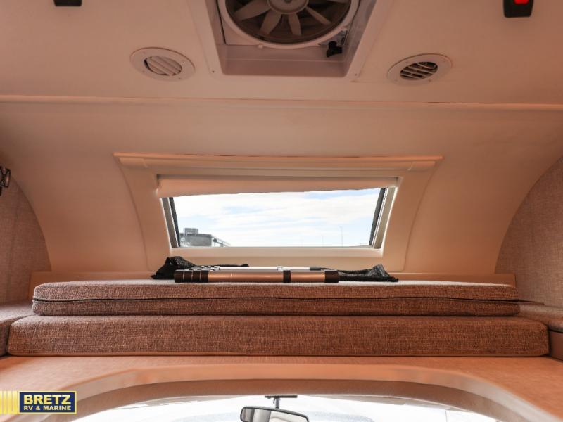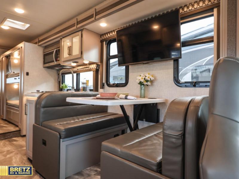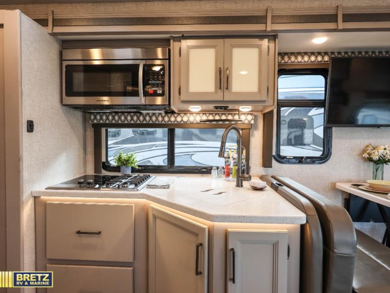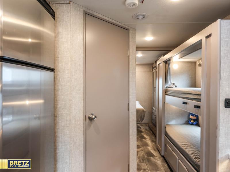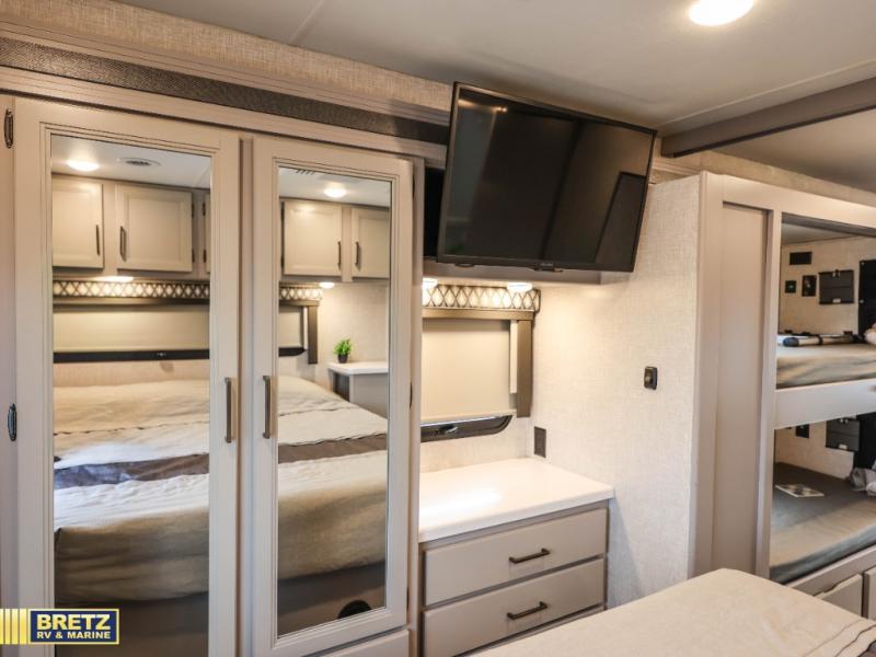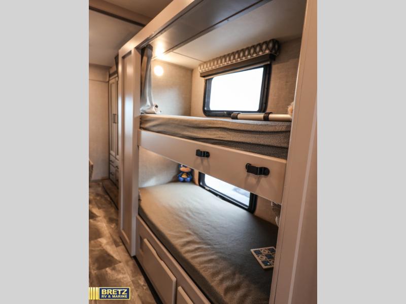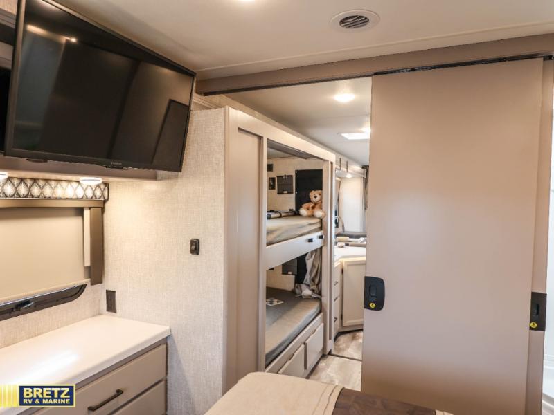 See the world on the open road with your family in this coach! Whether you travel while working, for enjoyment or both, the full-wall slide offers a spacious kitchen and living area as well as a rear bedroom. You can sleep on a queen bed and watch the 32" TV before falling asleep and the double entry bath allows easy access at night for you and the kiddos in the bunk beds in the hallway. The kitchen provides a refrigerator next to the pantry for convenience and a two-burner gas cooktop with a single induction cooktop, a convection microwave, plus a stainless steel sink. Everyone can dine at the Dream dinette, the jack-knife sofa or outside under the awning. There is more to enjoy such as the cab overhead bunk with a skylight, or enjoy watching the exterior 32" TV while enjoying the weather.