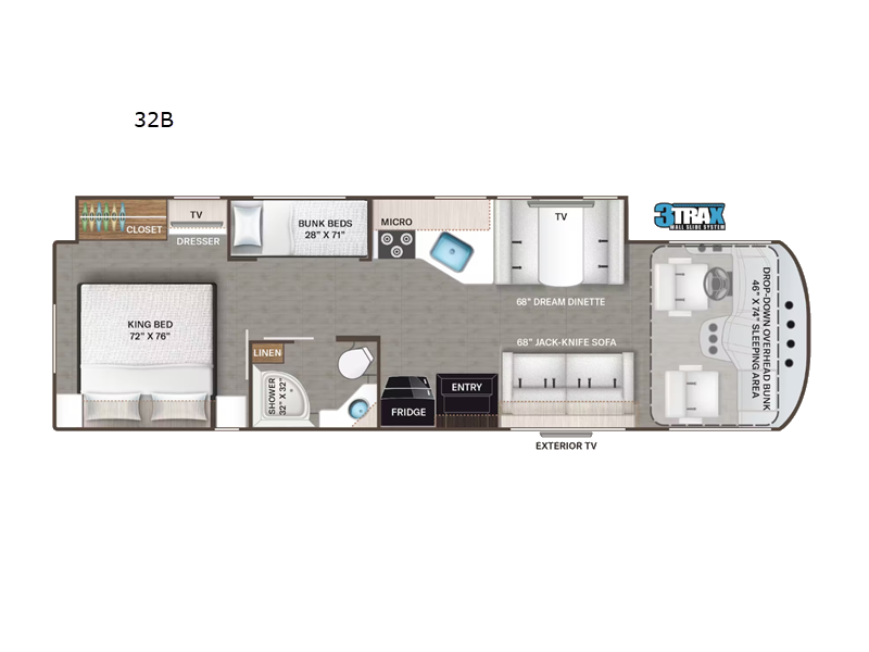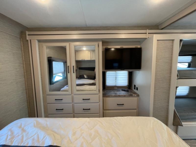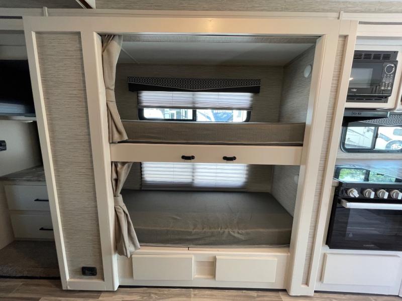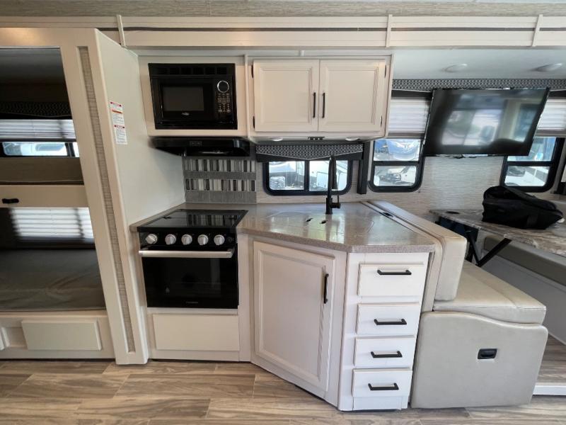 If you're looking for a coach with a larger sleeping capacity and added interior space, you've found it in this Resonate 32B! Once the full-wall slide is extended you can dine at the Dream Dinette or relax on the jack-knife sofa that sits directly across from the 39" LED TV. The little ones will love the drop-down overhead bunk and bunk beds, plus the full bath is right across the bunks for easy nighttime use. You will have the rear private bedroom all to yourselves with a king bed and your own 32" TV, and any other guests can sleep on the living area furniture. In the morning you can whip up a hearty breakfast on the three burner cooktop, or use the microwave oven for instant oatmeal if you're on the go. You can spend your day hiking or swimming, or you may just want to visit under the 19' power awning with LED lights and watch the game on the exterior TV!