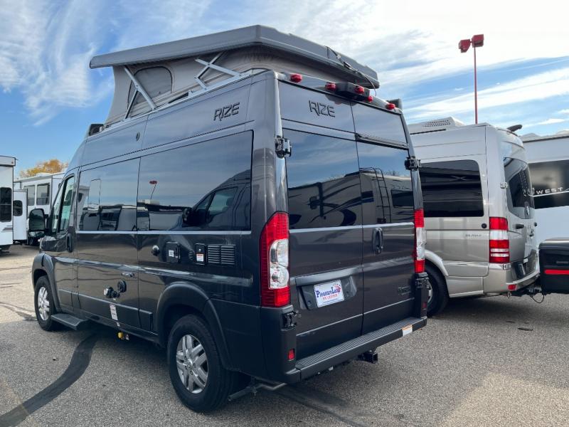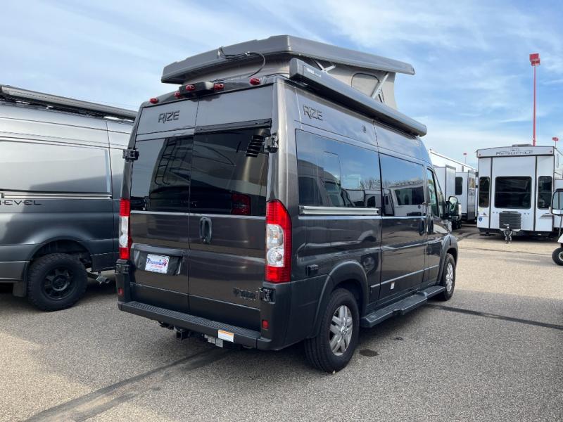 The Rize Class B gas motorhome by Thor Motor Coach allows you to experience the camping lifestyle in a compact RV packed with convenient features. There is a 3.6L Pentastar V6 engine and 276 HP to power your excursions, and the outdoor enthusiast will love the 190W solar panel and solar charge controller. Each model includes residential vinyl flooring, TechnoForm Euro-style upper cabinet doors, and premium window privacy shades. You'll find pressed countertops in the kitchen and a glass protective cover and task lighting above the cooktop to easily cook meals each day. The keyless entry system adds to the convenience found throughout these models, plus there is an exterior LP connection if you want to hook up your own grill and a rear water sprayer to wash off your hiking boots.
