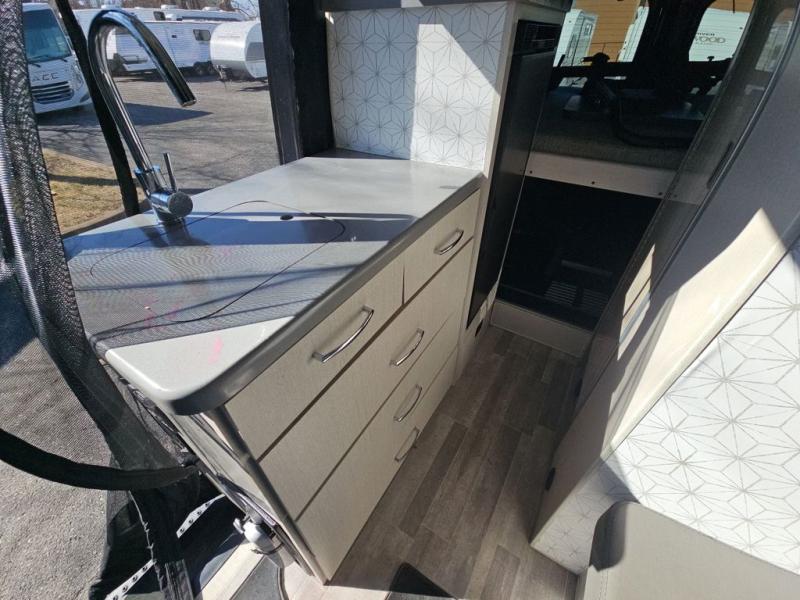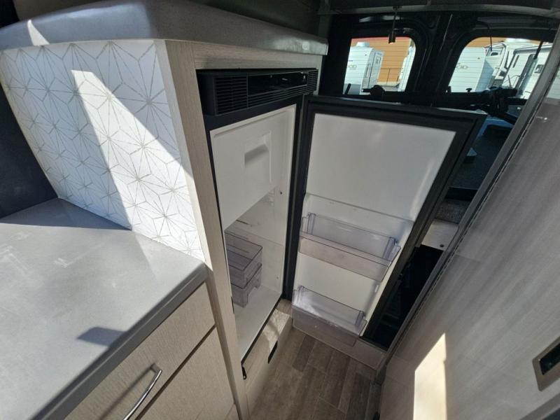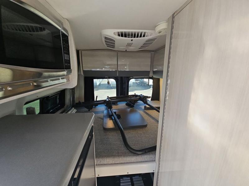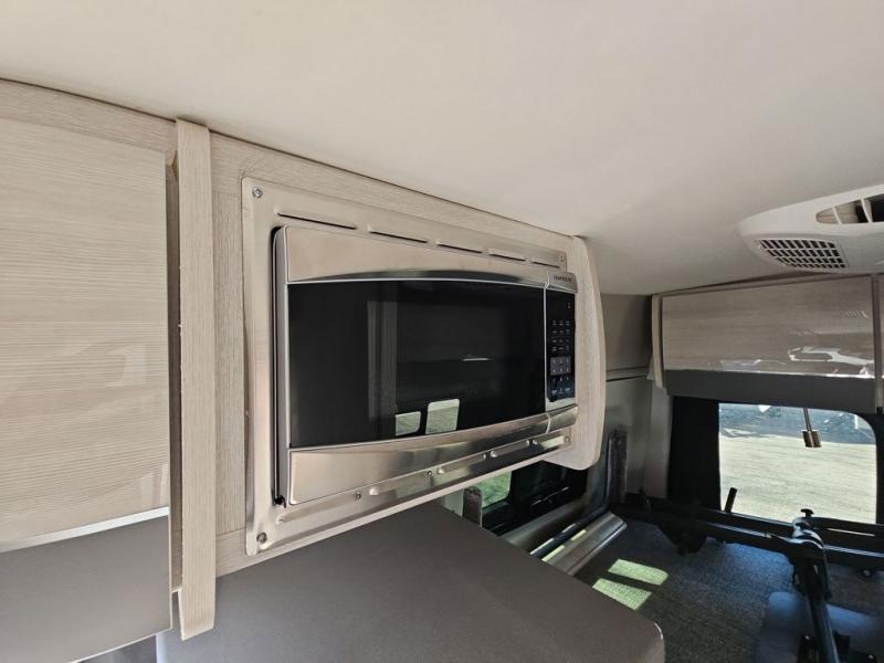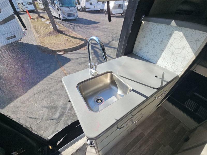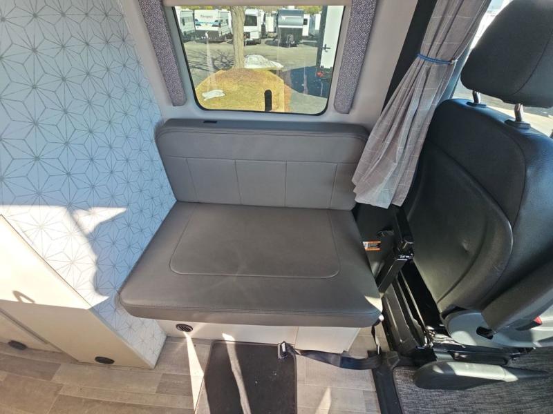 When you love to explore without sacrificing luxuries such as having your own 51" x 74" bed at night, this camper van will be perfect for two! The captain's chairs swivel to offer more seating space to utilize the removable table in front of the side seating, and to watch the 24" TV once at your destination. The kitchen includes a single door, electric refrigerator, a microwave oven, and solid surface countertops with a single bowl sink. For cooking, you will also find a dual burner cooktop (earlier 2023 product year models), or a portable one burner plug-in electric induction cooktop, please see dealer for details on in stock inventory. The fold-out exterior table allows you to dine outside under the power awning with integrated LED lighting. There are many more standard features and a few options to choose from, start exploring today! Please note: floorplan depicts later production year model with counter area to use portable one burner plug-in induction cooktop.