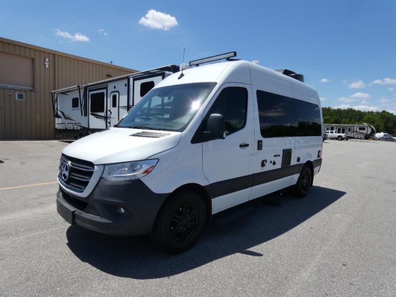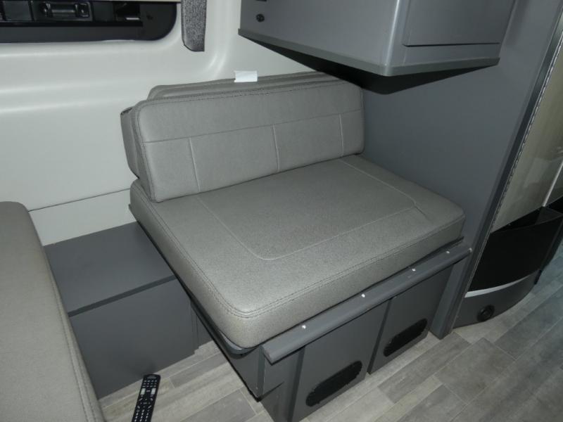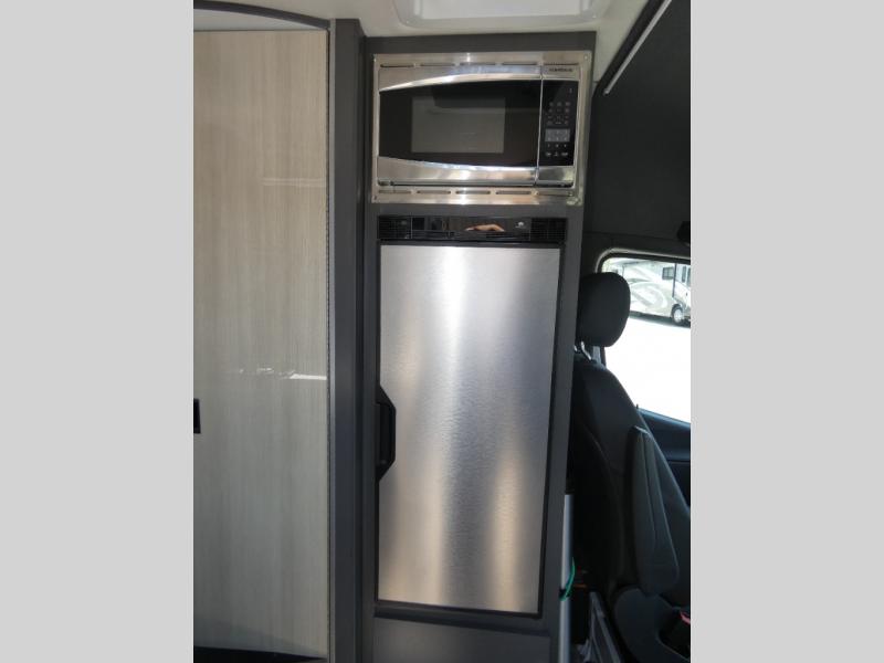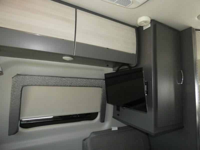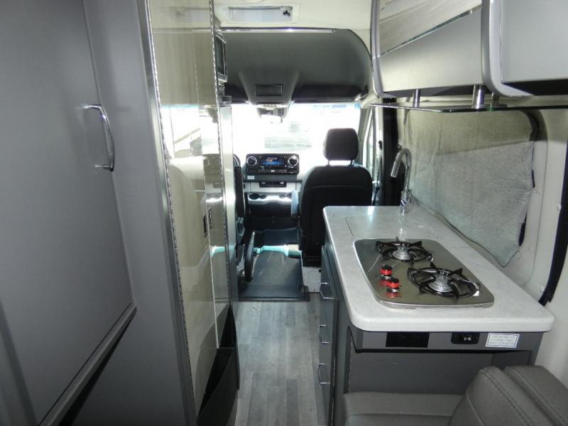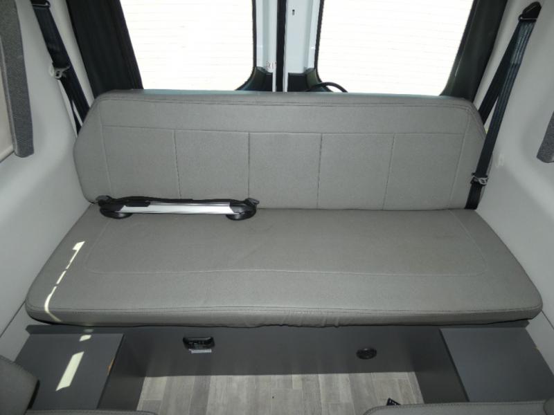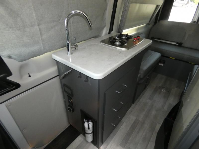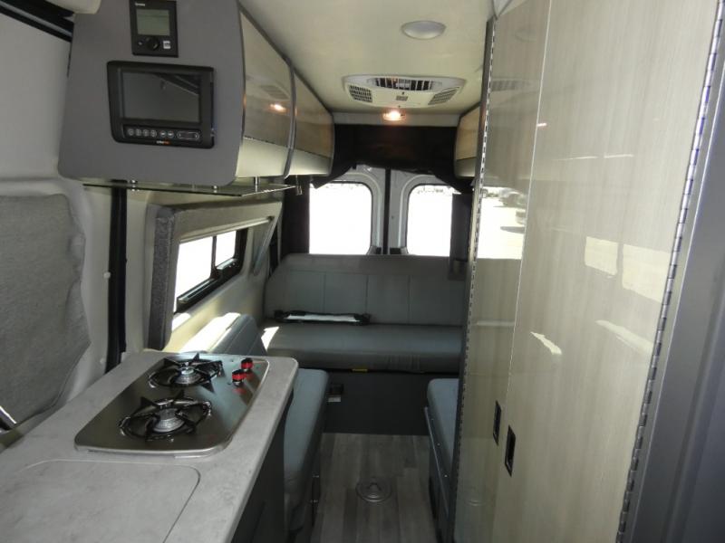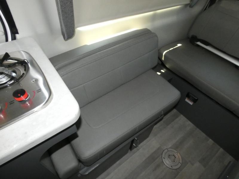 Calling all outdoor enthusiasts to explore the unknown sites in this camper van for two! The captain's chairs swivel for more seating space once at your destination, and the rear sofa folds out to offer a 70" x 72" sleeping space. You can watch the 24" TV before bedtime, and get cleaned up in the wet bath. The kitchen area features a single door, electric refrigerator, a microwave oven, plus a solid surface countertop and single bowl sink. For cooking, you will find either a dual burner cooktop (earlier 2023 model year), or a portable one burner plug-in electric 110V induction cooktop (please see dealer for inventory details). You can even enjoy dining outside using the fold-out exterior table. When traveling the rear sofa offers three sets of seatbelts for safety. There are many more standard features and a few options to choose from, start exploring today! Please note: floorplan depicts later production year model with counter space for the portable one burner plug-in induction cooktop.