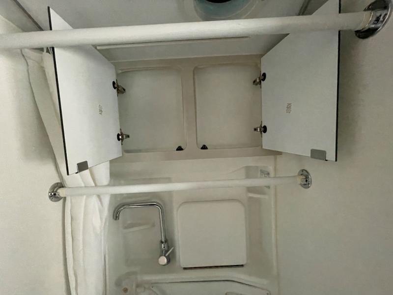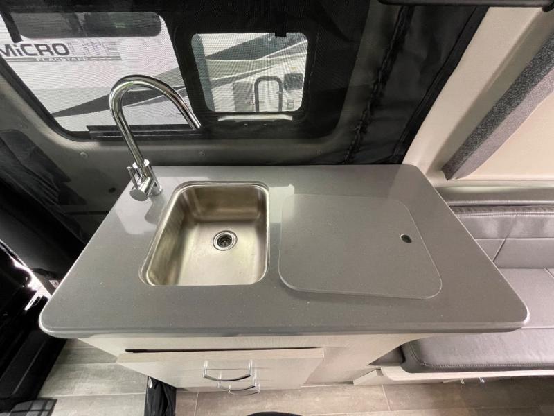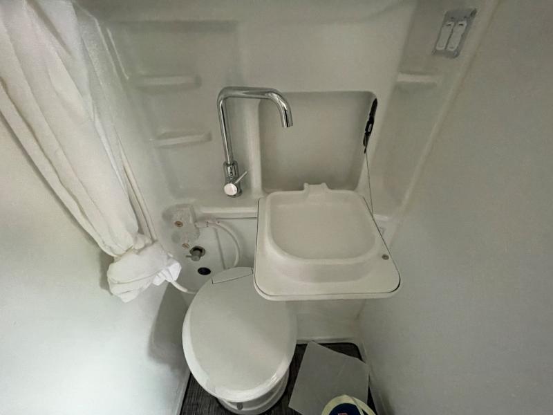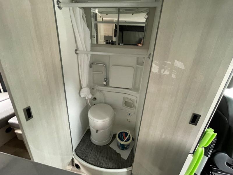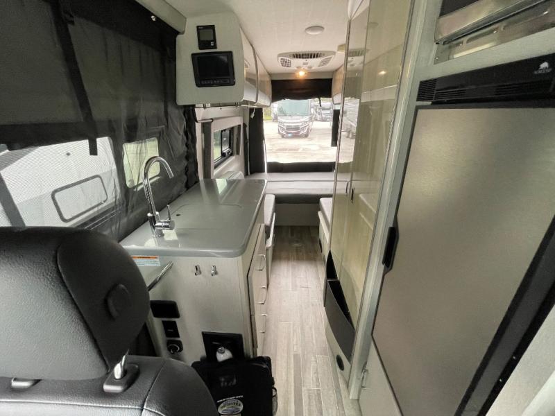 Calling all outdoor enthusiasts to explore the unknown sites in this camper van for two! The captain's chairs swivel for more seating space once at your destination, and the rear sofa folds out to offer a 70" x 72" sleeping space. You can watch the 24" TV before bedtime, and get cleaned up in the wet bath. The kitchen area features a single door, electric refrigerator, a microwave oven, plus a solid surface countertop and single bowl sink. For cooking, you will find either a dual burner cooktop (earlier 2023 model year), or a portable one burner plug-in electric 110V induction cooktop (please see dealer for inventory details). You can even enjoy dining outside using the fold-out exterior table. When traveling the rear sofa offers three sets of seatbelts for safety. There are many more standard features and a few options to choose from, start exploring today! Please note: floorplan depicts later production year model with counter space for the portable one burner plug-in induction cooktop.
