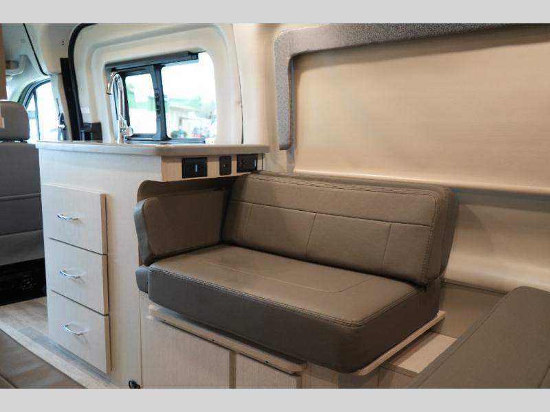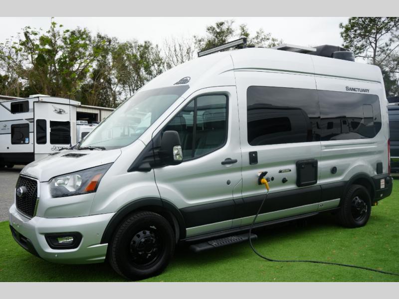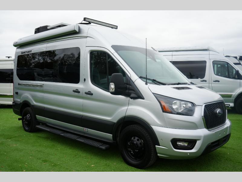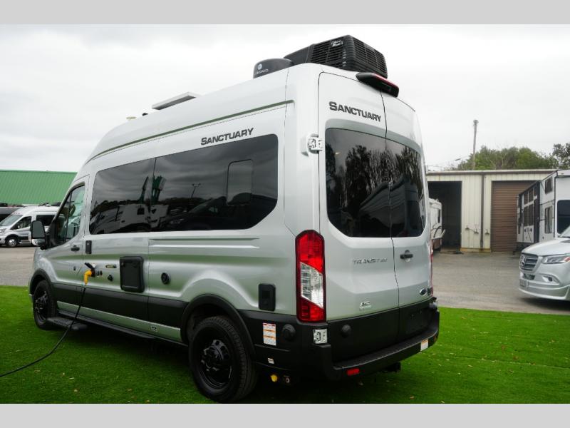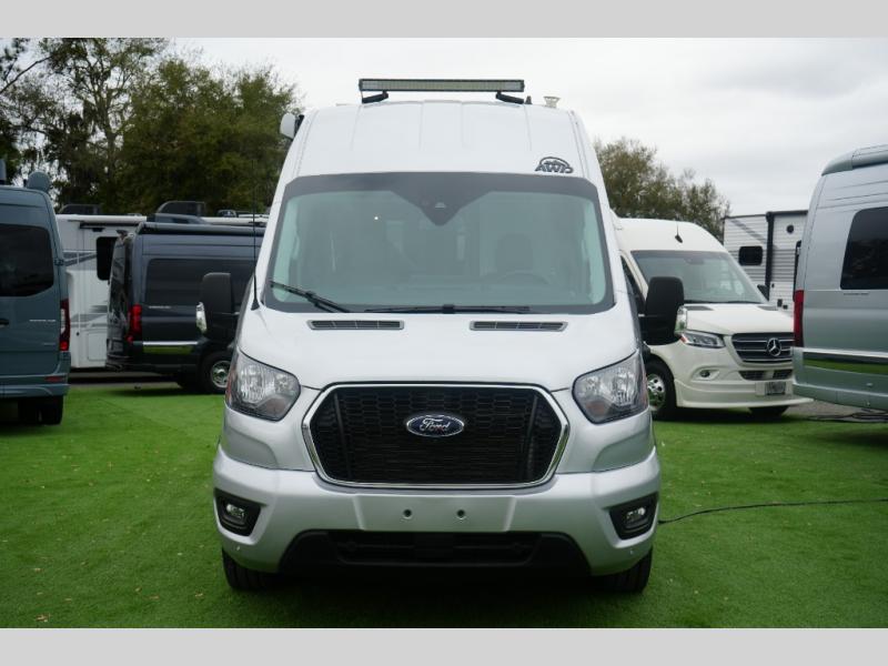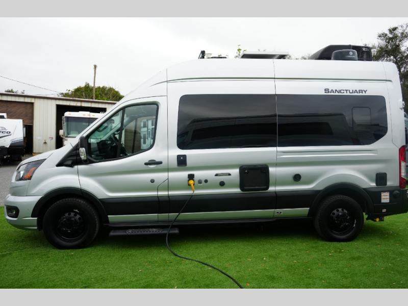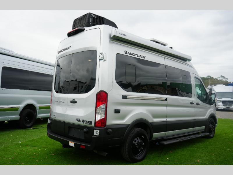 The Sanctuary Transit Class B gas motorhome by Thor Motor Coach starts with a Ford Transit all-wheel drive (AWD) chassis to tackle tougher terrain and travel more roads. After you've explored all day, you will love coming back to find large opening side windows to let fresh air in, along with lightweight cabinetry, vinyl flooring, and a solid surface countertop in the kitchen. The Rapid Camp+ multiplex wiring control system puts you in control of your camper van's functions, and the Re(Li)able Power Pack electrical system provides power to go off-grid when the adventure calls for it. You will also enjoy the Thule lateral arm power awning with integrated LED lighting, the Thule roof ladder, and the top mounted LED light bar with a cover for a sleek look at night. Choose the Sanctuary Transit camper van for all your outdoor excursions!