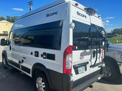 Make your travel dreams a reality when you step inside and get behind the wheel of this Scope Class B camper van. You can easily travel with your family and friends with seating for four including the driver and passenger seats which swivel, plus a bench seat behind the driver's side for two more. A flip-down table makes it easy to enjoy a snack on the go. Easily travel to tailgates or school events and have everything you need accessible, as well as for those overnight road trips where you can stop and relax at anytime, and stay for as long as you like. The two burner cooktop and microwave oven makes cooking easy, and the bathroom with cassette toilet and sink is a convenience that you are sure to appreciate. You will find plenty of storage for your things with several overhead cabinets, pull-out drawers, as well as flip-open storage beneath the cushions in back where you can arrange them to create sleeping for two. With an optional pop-top roof you can create sleeping for two more.