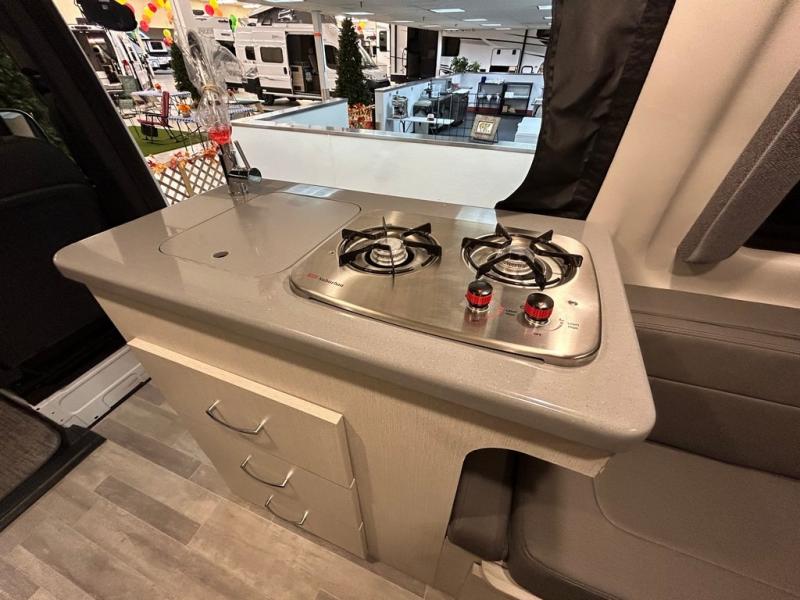 Nothing is more tranquil than this Tranquility Class B diesel motorhome! Enjoy the freedom to create delicious meals while on the road with the two-burner gas cooktop and a microwave oven, and keep your leftovers and favorite foods chilled in the single-door electric refrigerator. There is an electric fold-out sleeping area with a removable table, plus a 24" TV to keep you entertained. This model also includes a wet bath with a cassette toilet, a power bath vent, plus a shower with a deluxe curtain.