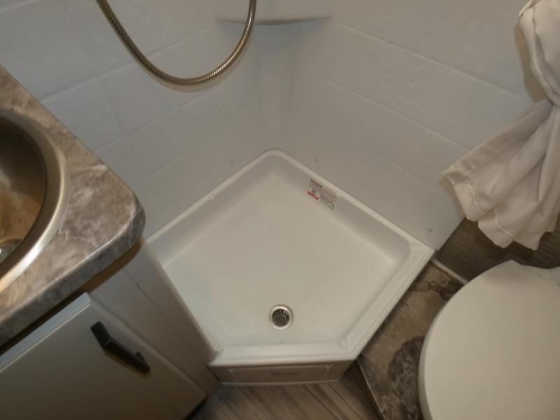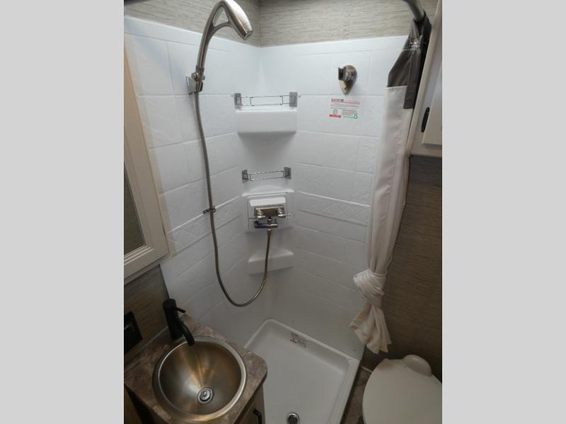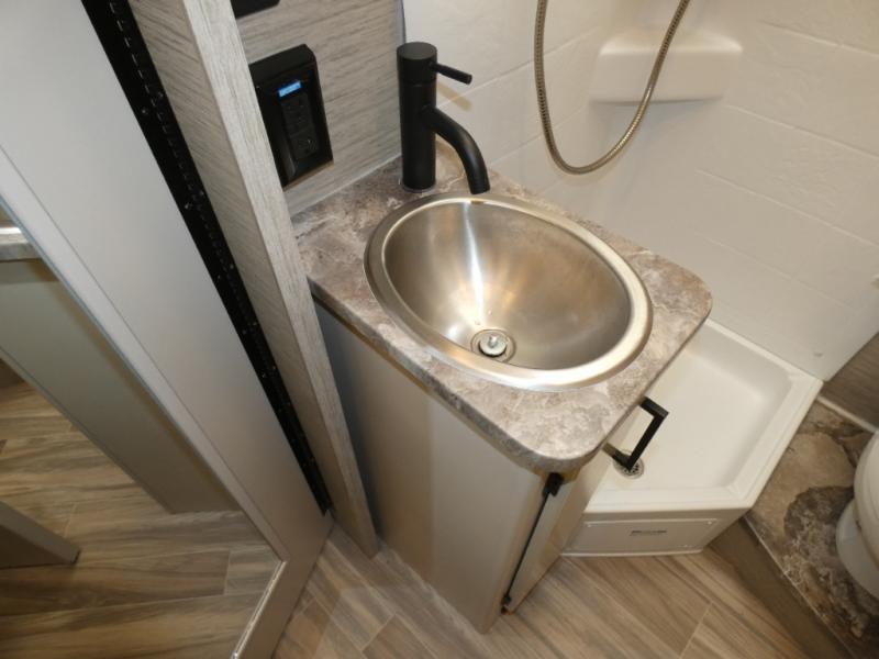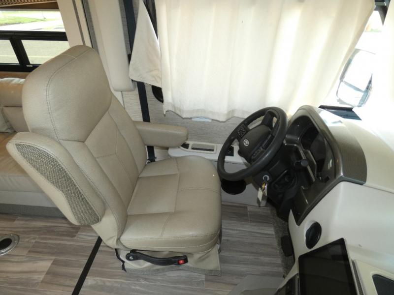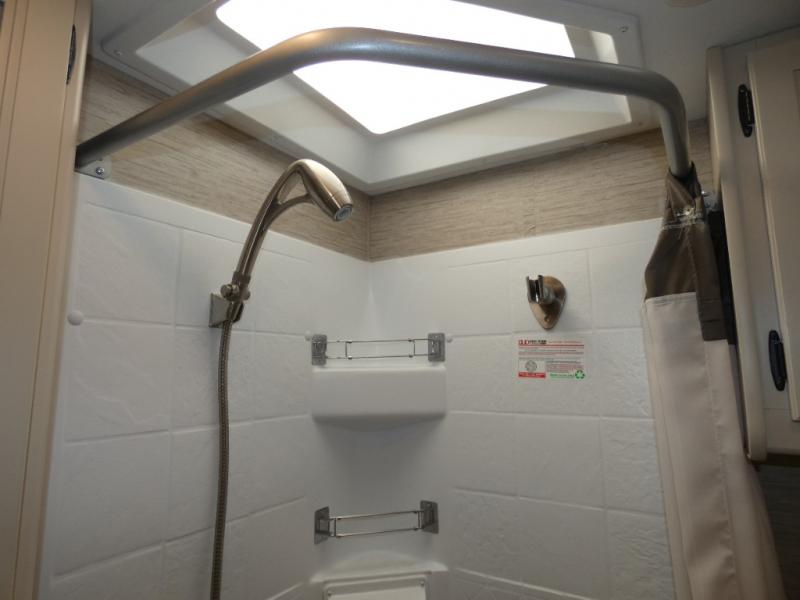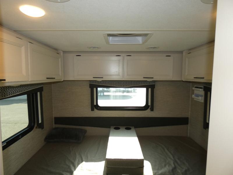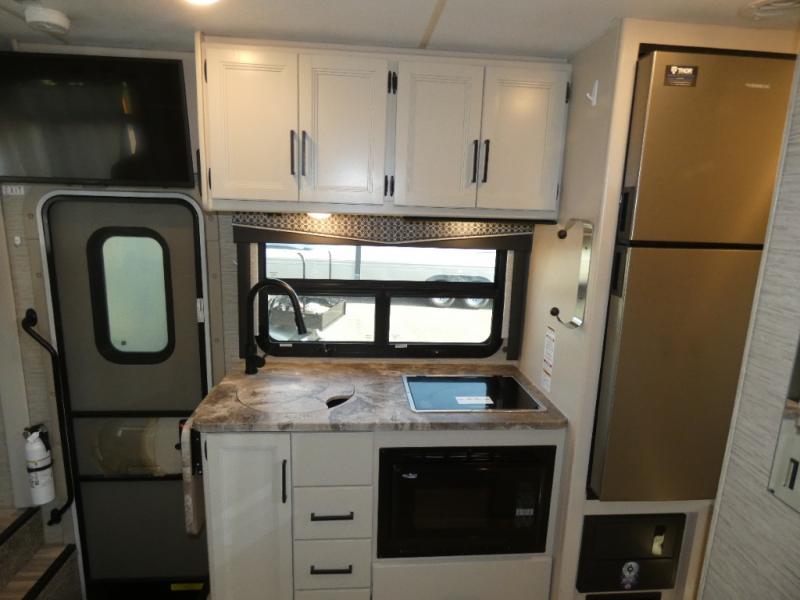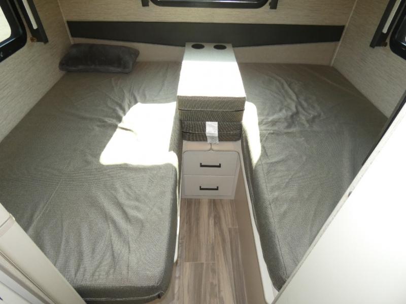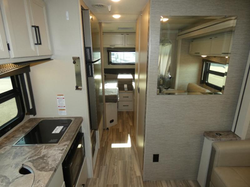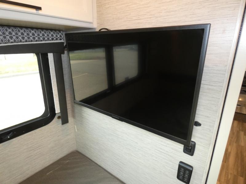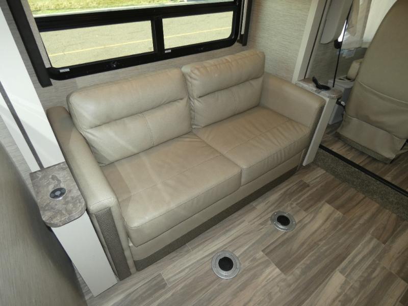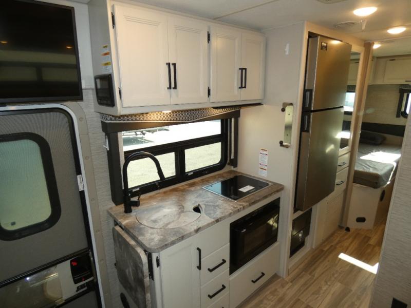 The front cab of this Vegas Class A gas motorhome is excellently appointed with a stow-away coffee table, reclining/swivel leatherette captain's chairs, a living area speaker tied to the dash radio, and a 10" touchscreen dash radio with Bluetooth, Android Auto, and Apple CarPlay! A single slide holds the 68" sofa bed so that it isn't in your way as you walk back to the semi-private bedroom. The kitchen offers you a two burner cooktop to sauté veggies, and there are two TVs to provide you with all the entertainment you could need.