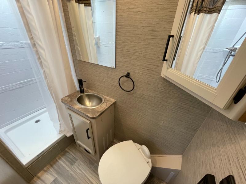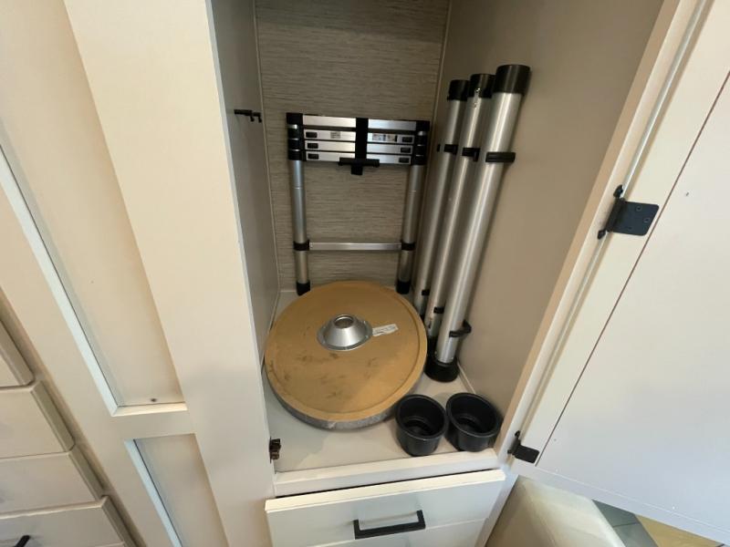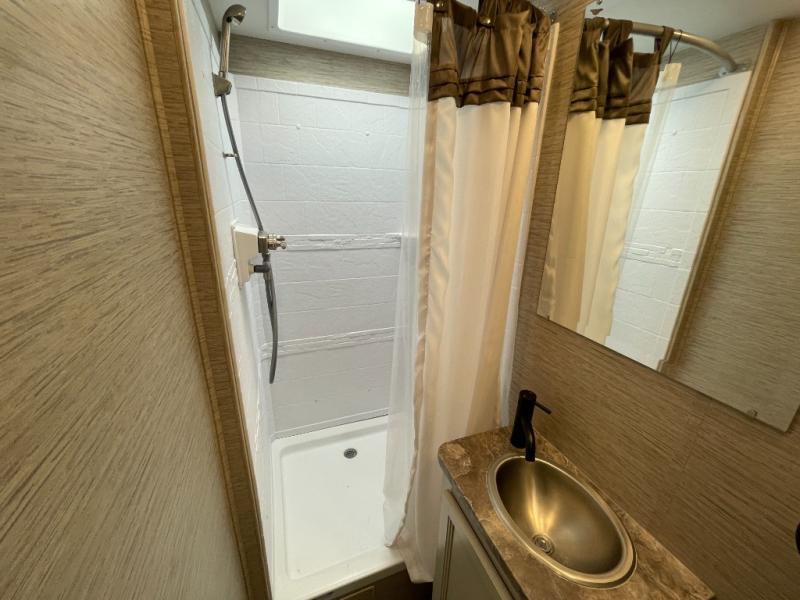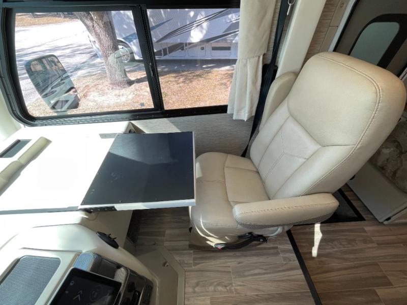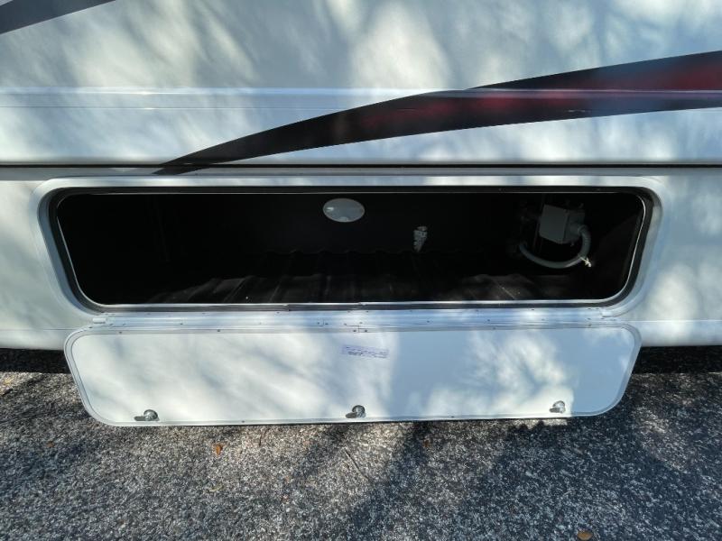 You will have everything you need for a comfortable trip in this motorhome! After a long day of traveling, you can head to the rear corner bathroom to clean up in the 30" x 26" shower then lay down on the side hinged frame fold-up 54" x 80" queen bed. There are two spacious closets to store your clothes, one of which is next to the 67" sofa with removable pedestal table slide. There is also a drop down overhead 38" x 73" bunk over cab that can be used for extra sleeping or storage space. You can store all of your traveling essentials in the exterior mega storage area and have easy access with the rear door access. Keep your electronics charged and ready to go with the wireless phone charger with USB plug and enjoy privacy at night with the window privacy roller shades!