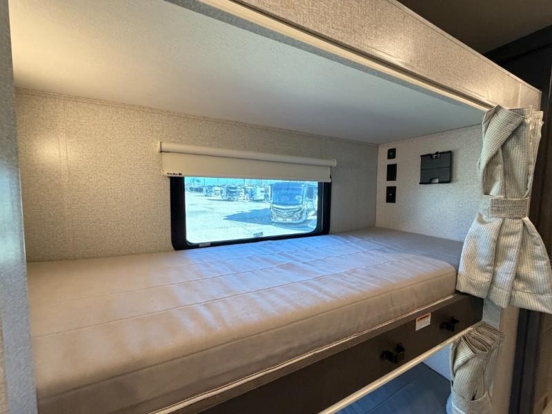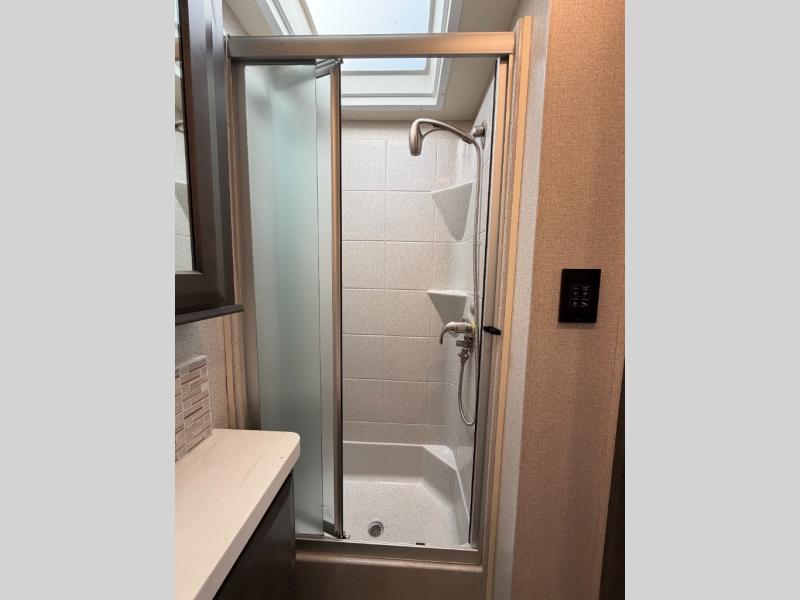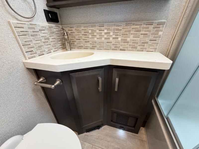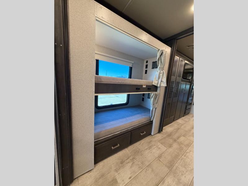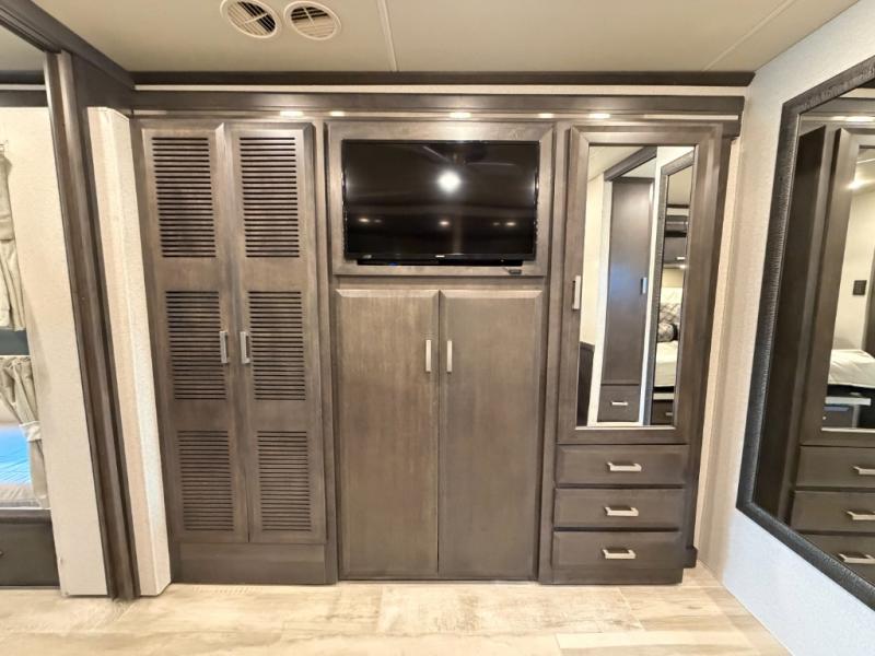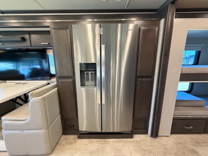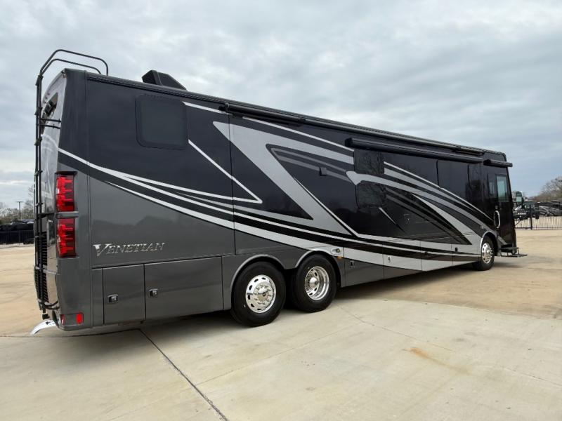 This Venetian Class A diesel motorhome has a high amount of luxury with two full bathrooms! One of those bathrooms is even included back in a master suite for you to enjoy, and this bathroom contains a dual-sink vanity to help you both get ready with ease. You'll have quite a lot of sleeping space too with the inclining king bed, 27" x 74" bunk beds, 80" sofa, 90" Dream Dinette, and 48" x 74" drop-down bunk above the cab. On top of that, you have the storage space and entertainment needed for all of those people with the two linen closets, a bedroom closet and dresser, two kitchen pantries, a residential refrigerator, and four LED HDTVs.