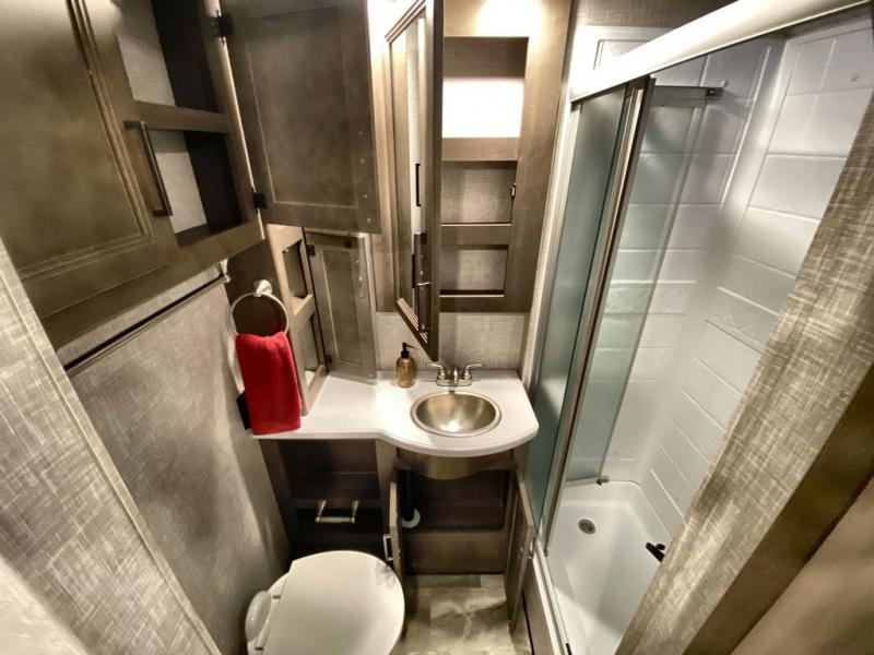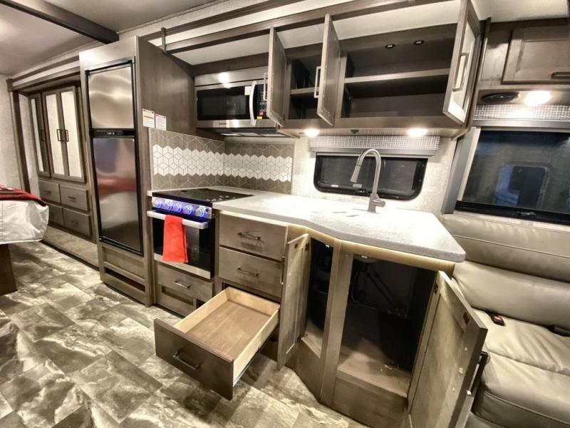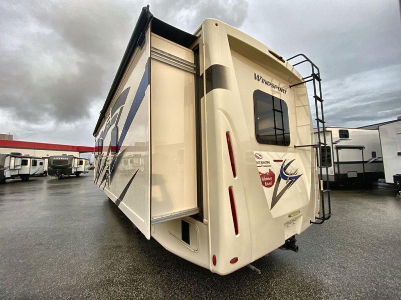 This Windsport Class A gas motorhome is going to be an amazing way to vacation! You will be living in luxury back in the private bedroom because of the king bed and 32" LED TV, and you have exceptional convenience with the exterior 32" TV and exterior kitchen when relaxing outside. Now you can have a movie night out under the stars with the snacks being prepared right there with you. Back inside, you'll appreciate having a 68" jack-knife sofa to relax on, a three-burner stove to cook on, and a coffee table between the cab seats to set your drinks on. The bathroom contains a 24" x 36" shower with a skylight to help you stay fresh, and there is a glass door included in the shower.