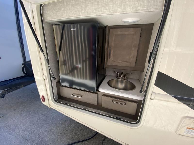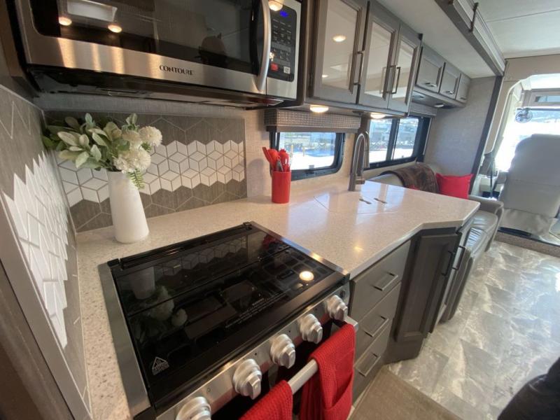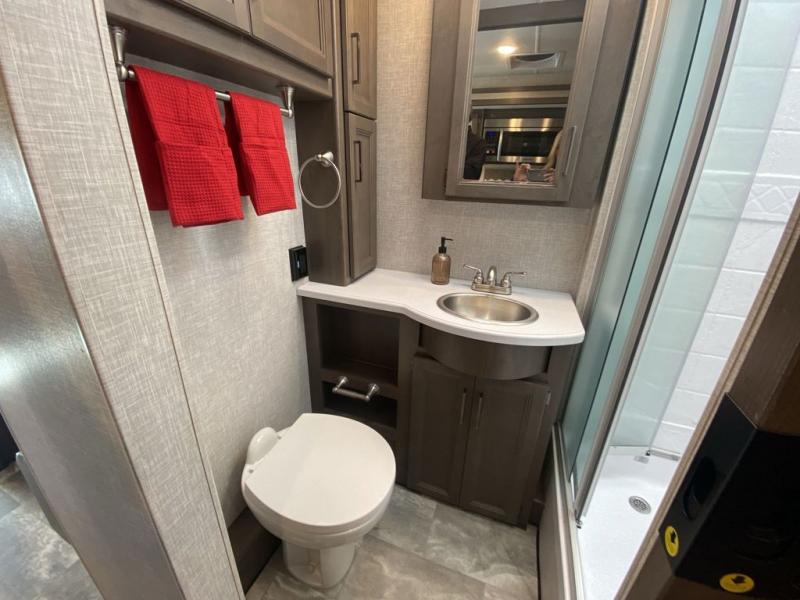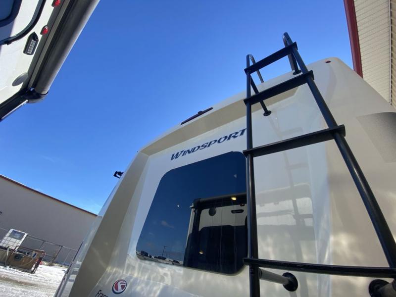 This Windsport Class A gas motorhome is going to be an amazing way to vacation! You will be living in luxury back in the private bedroom because of the king bed and 32" LED TV, and you have exceptional convenience with the exterior 32" TV and exterior kitchen when relaxing outside. Now you can have a movie night out under the stars with the snacks being prepared right there with you. Back inside, you'll appreciate having a 68" jack-knife sofa to relax on, a three-burner stove to cook on, and a coffee table between the cab seats to set your drinks on. The bathroom contains a 24" x 36" shower with a skylight to help you stay fresh, and there is a glass door included in the shower.