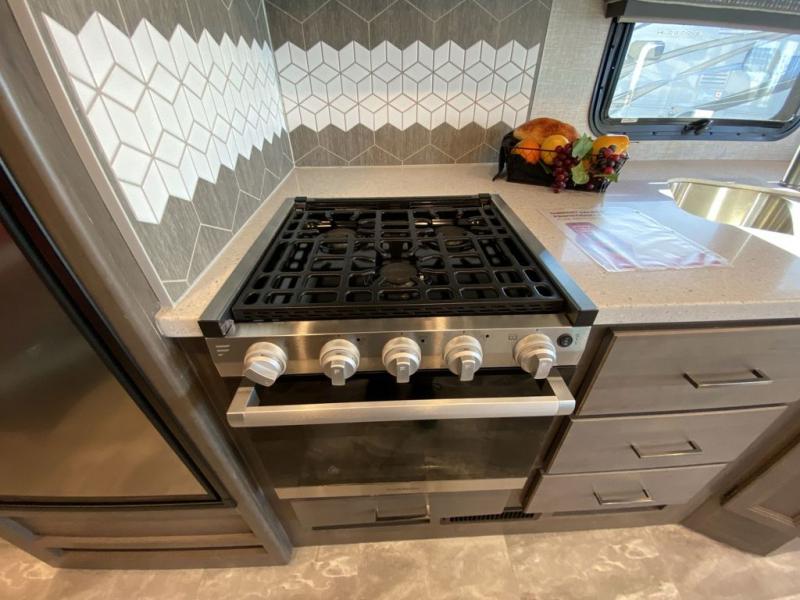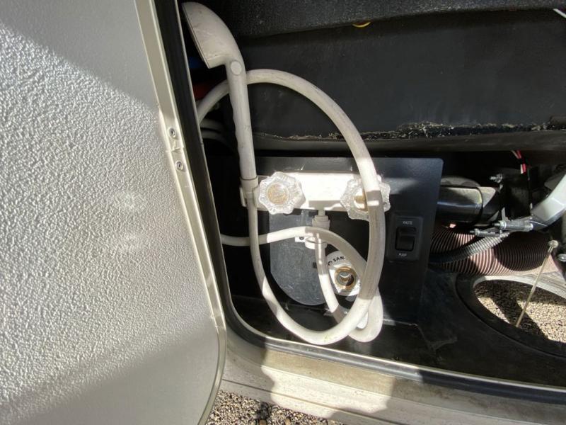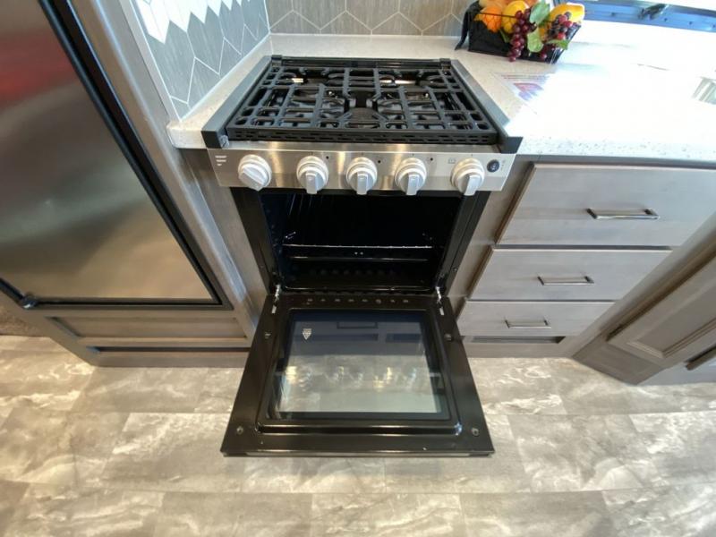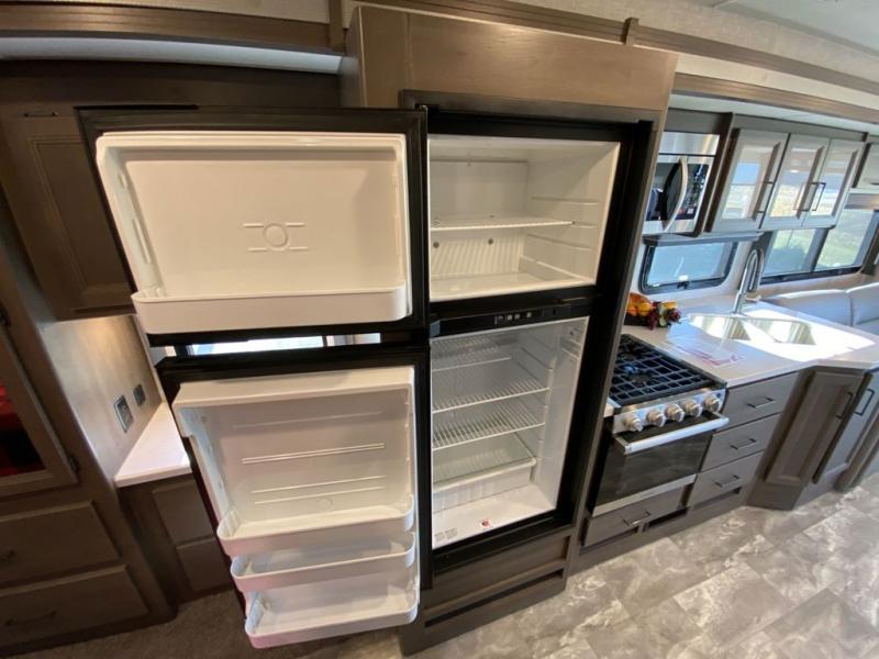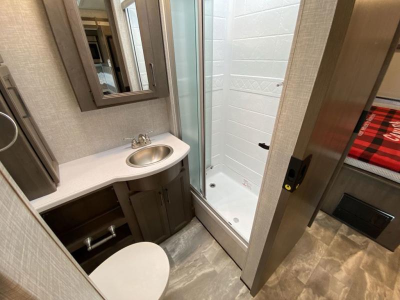 This Windsport Class A gas motorhome is going to be an amazing way to vacation! You will be living in luxury back in the private bedroom because of the king bed and 32" LED TV, and you have exceptional convenience with the exterior 32" TV and exterior kitchen when relaxing outside. Now you can have a movie night out under the stars with the snacks being prepared right there with you. Back inside, you'll appreciate having a 68" jack-knife sofa to relax on, a three-burner stove to cook on, and a coffee table between the cab seats to set your drinks on. The bathroom contains a 24" x 36" shower with a skylight to help you stay fresh, and there is a glass door included in the shower.