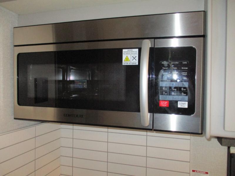 Prepare meals like a pro in the fully-equipped kitchen featuring a residential refrigerator, solid-surface countertops, convection microwave, and a 2-burner gas cooktop with a single induction burner.