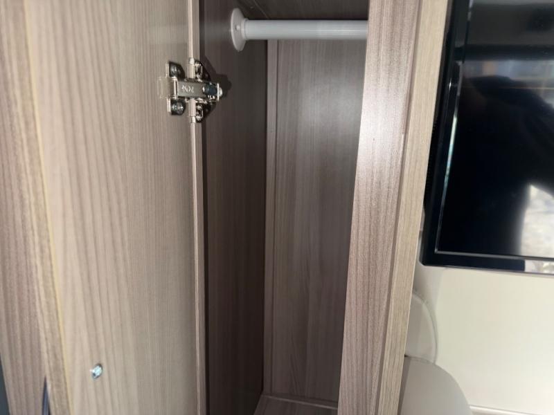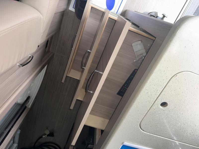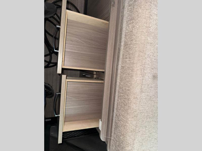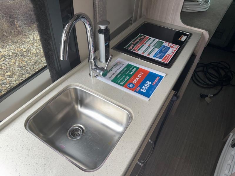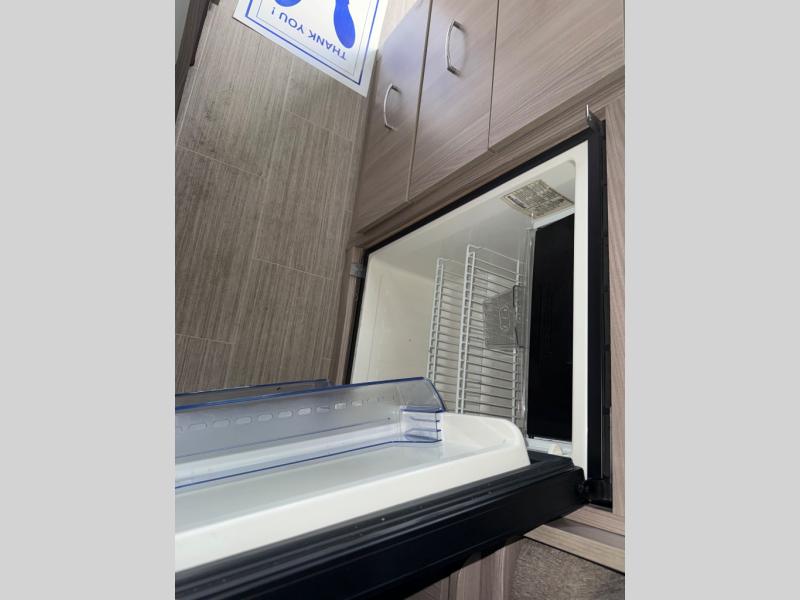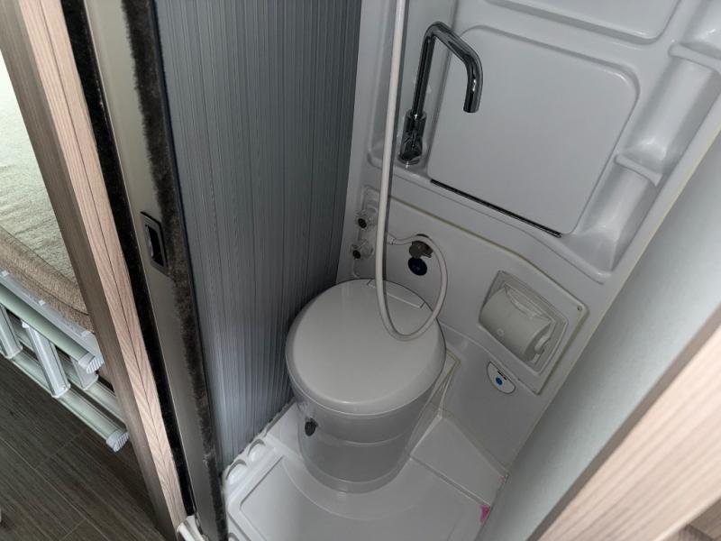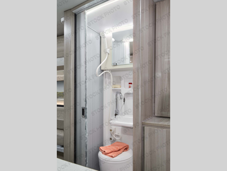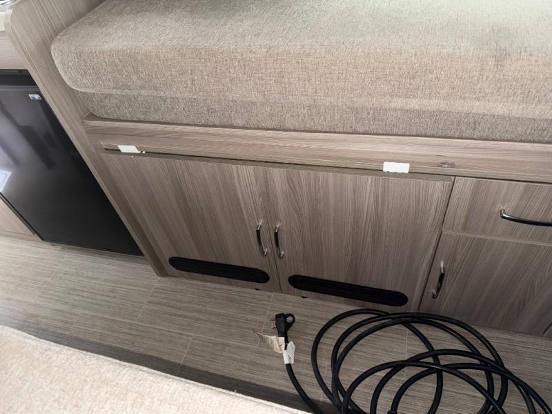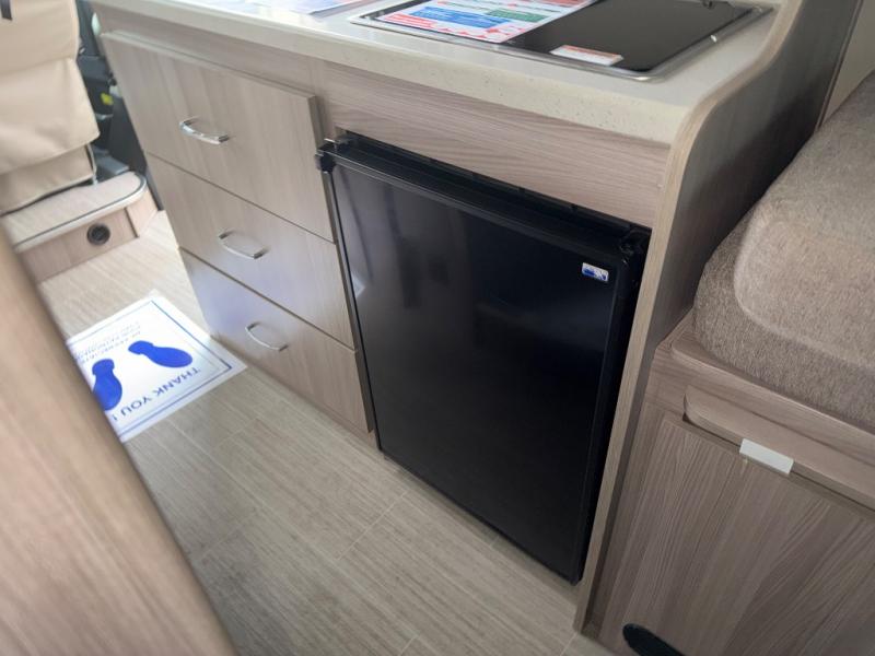 Start traveling the right way with this motorhome! It features a rear 72" x 66" pull out bed with under bed storage for extra blankets or other necessities, plus there are large opening side windows at the head and foot of the bed to let in more natural lighting and fresh air. Freshen up each morning in the manual enclosed wet bath with a cassette toilet and a closet next to it to store your towels. Once you have prepared your best home cooked meal with the gas two burner cooktop, you can head to the collapsible dinette table to enjoy them there comfortably and then watch your favorite movie on the 24" TV!