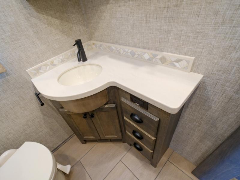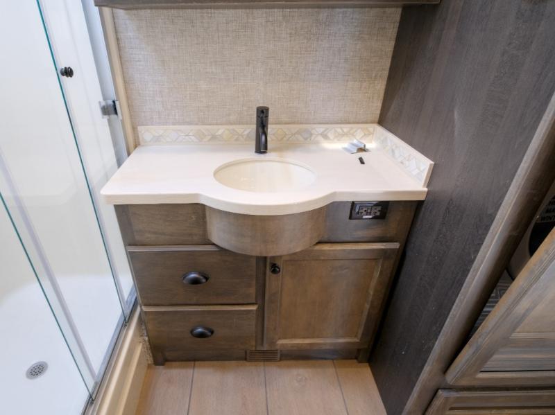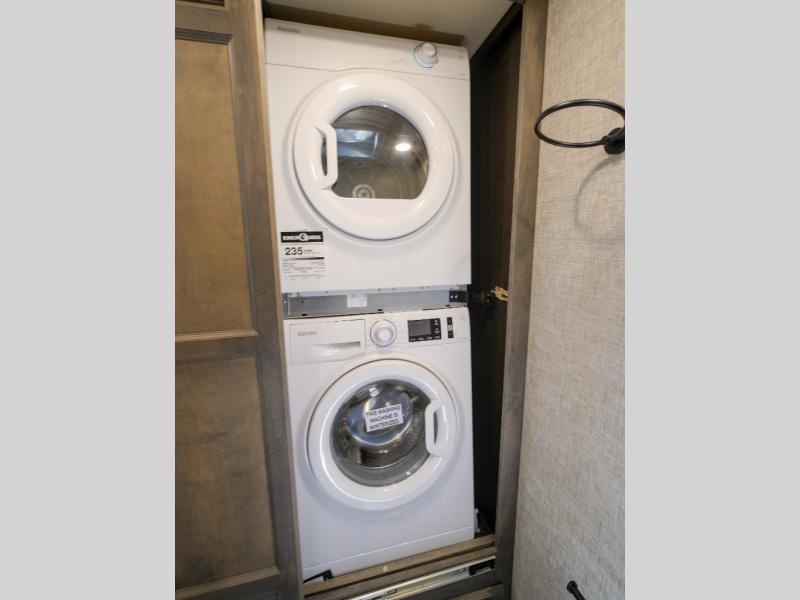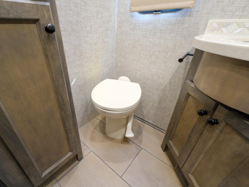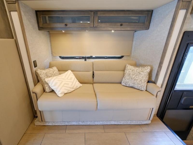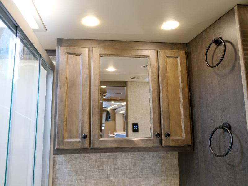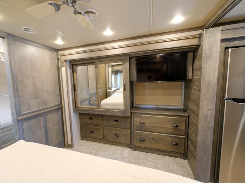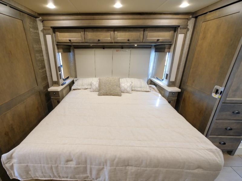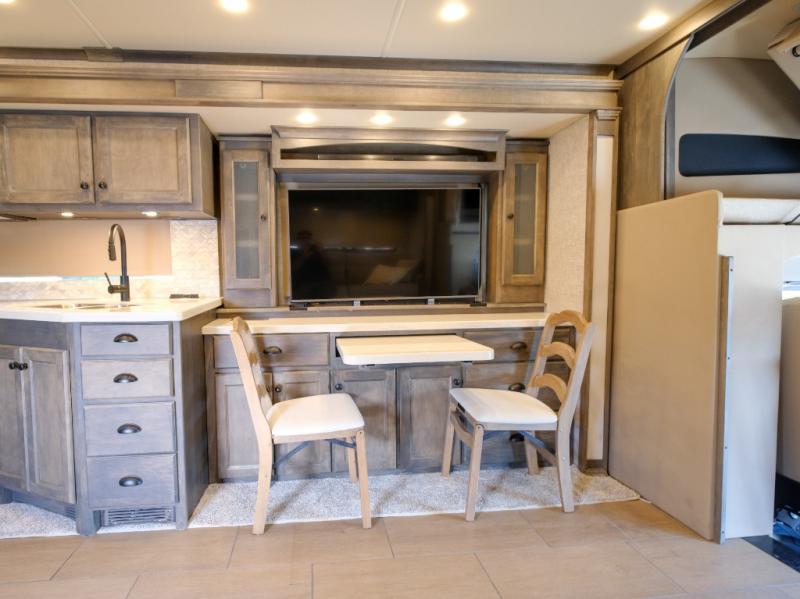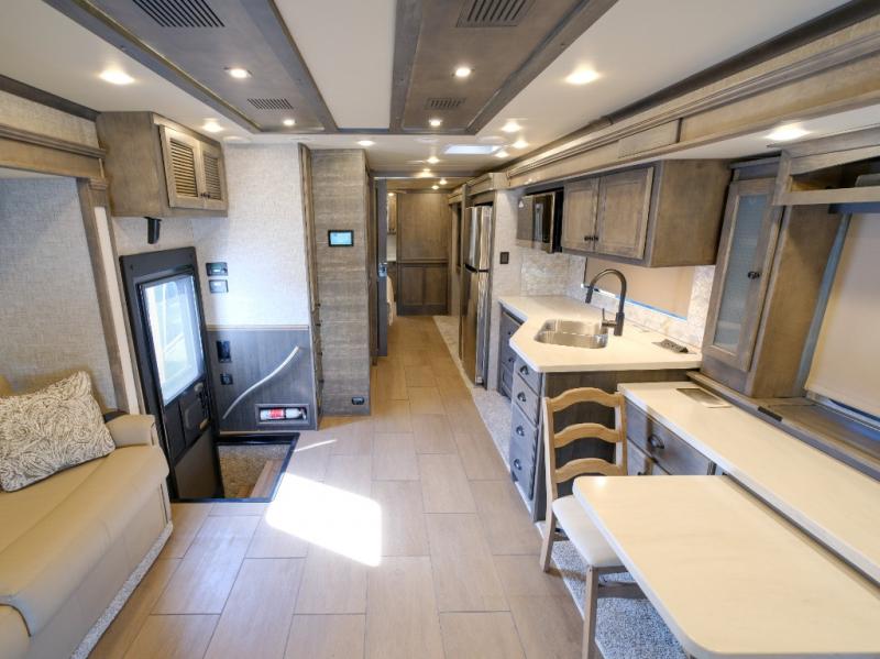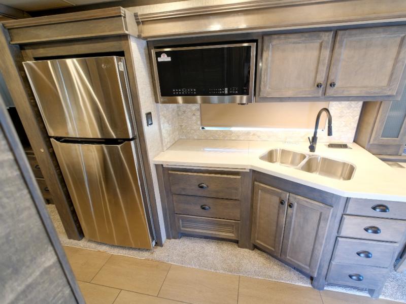 You're going to love the amount of space you having in this coach thanks to the full-wall slide and two additional slides. There is a bath and a half that is sure to come in handy when traveling with friends and family, plus sleeping space for six. The master bedroom will feel just like home with its king bed, wardrobe with drawers below, plus a flat panel TV! And your guests can sleep on the sofa bed, and the overhead bunk. This model includes a full kitchen with a three burner cooktop, a convection microwave, a counter extension, plus a stainless steel residential refrigerator for all your perishables.