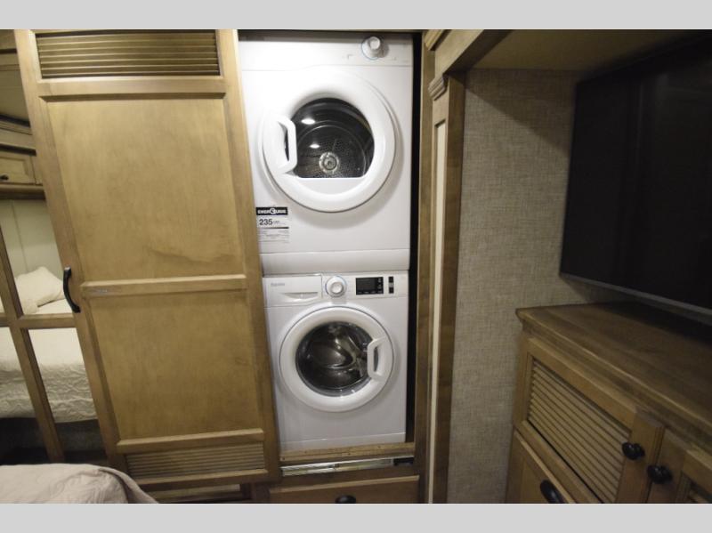 Stacked washer and dryer, king bed, bunk beds, a sofa bed, booth dinette, overhead cab bunk