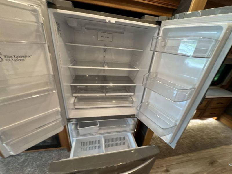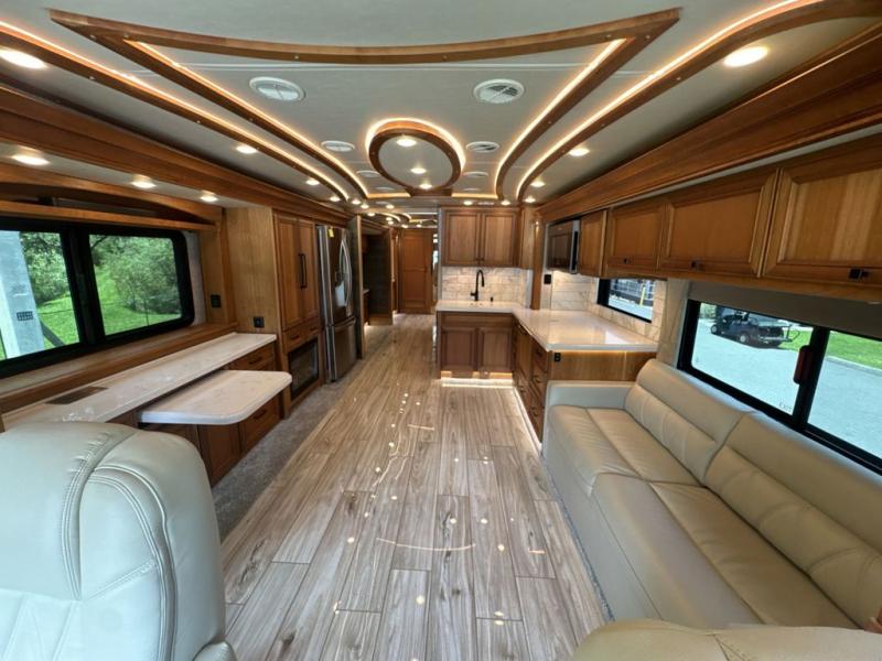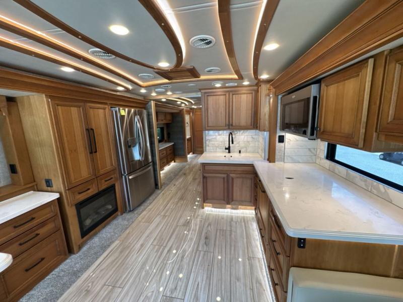 The Journey just got sweeter in this triple slide out coach that can sleep four each night. You are sure to get a great night's rest on the slide out king bed, plus you have the option to choose the optional power smart king bed for more convenience. Your guests can sleep on the sofa bed in the main living area, and everyone can take turns cleaning up in the full rear bath before breakfast. You'll find a large wardrobe here, an optional stacked washer and dryer, plus dual bath sinks so you both can brush at the same time. The kitchen is packed with everything you need to prepare a hearty breakfast, including a two burner induction cooktop, a convection microwave, and a counter-depth residential refrigerator for milk, eggs, and more!
