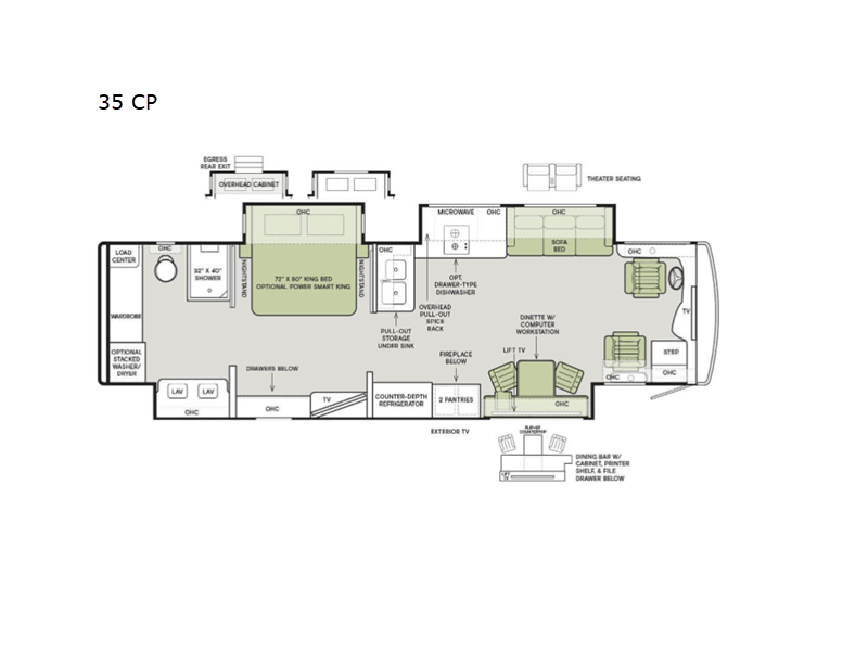 | TV Info | Cab Flat Panel TV, LR Lift TV, BR TV, Ext Flat Panel TV |