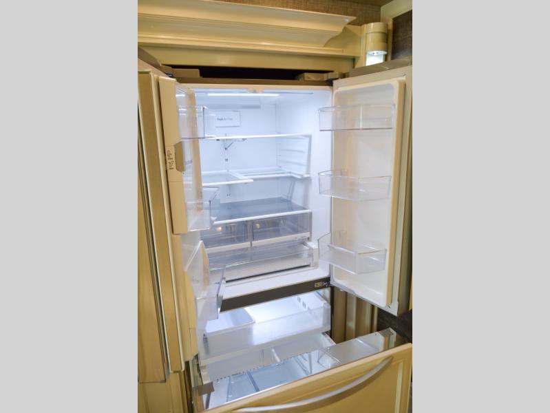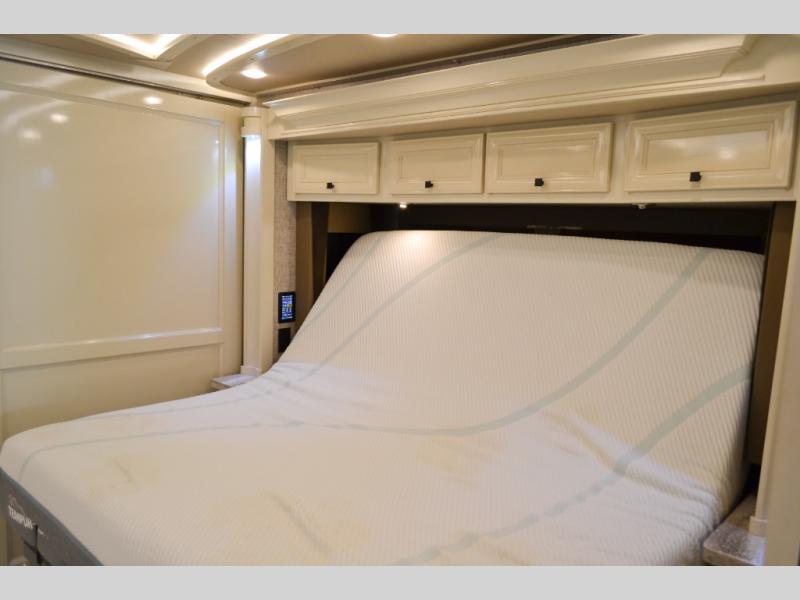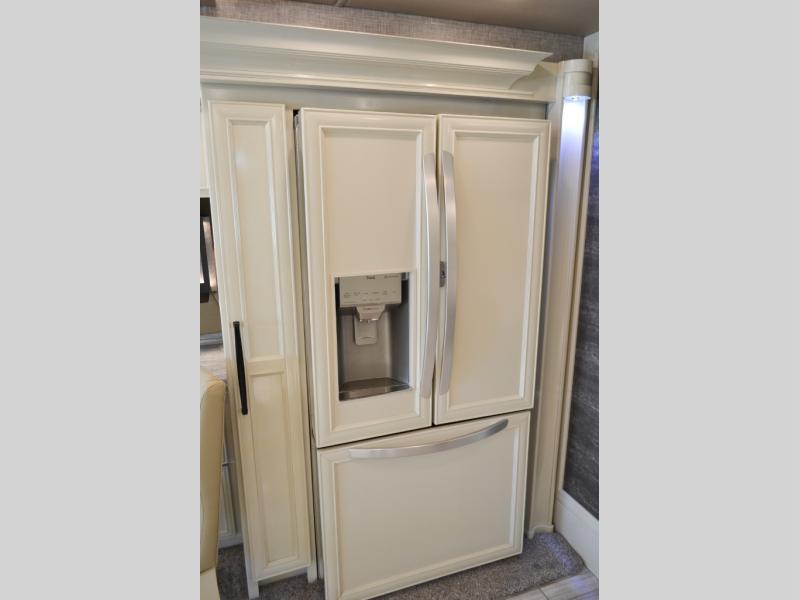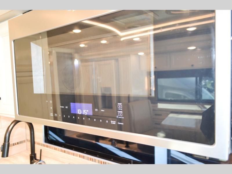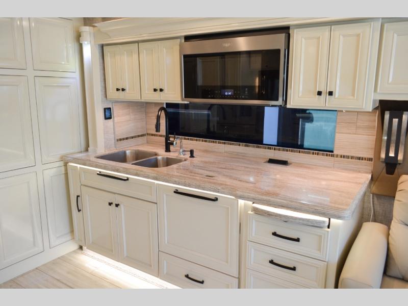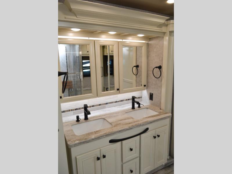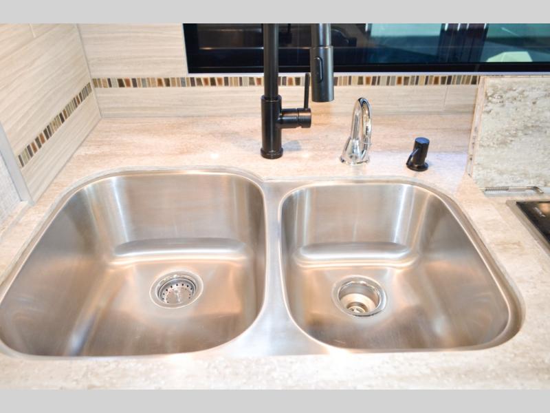 Now you can travel with more friends and family in this coach that includes a bath and a half, and additional sleeping space thanks to the two sofa beds. The master bedroom includes a king bed, a flat-panel TV, plus dual nightstands for your belongings. Dual bath sinks in the full rear bath allow two people to freshen up at once, and you can add the optional washer and dryer to make wash day a breeze. And check out the kitchen with its residential refrigerator, pantry, stainless steel convection microwave, and optional drawer-type dishwasher!