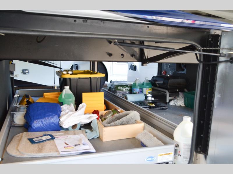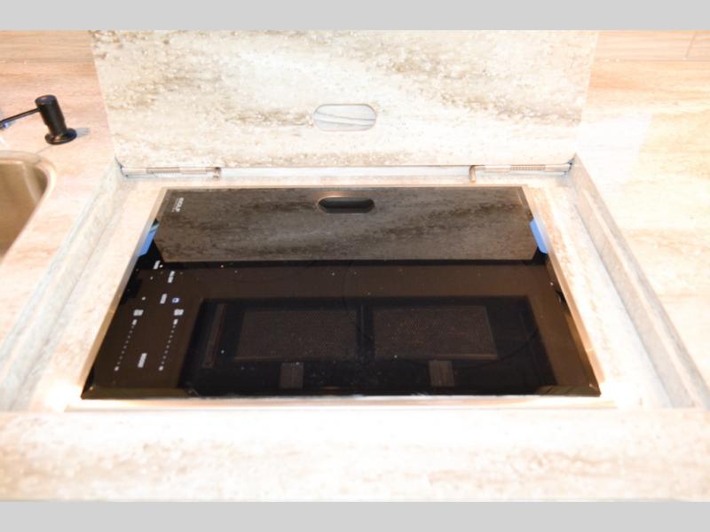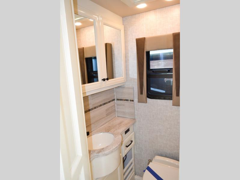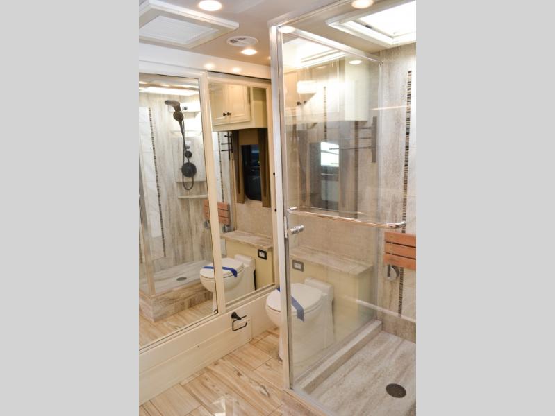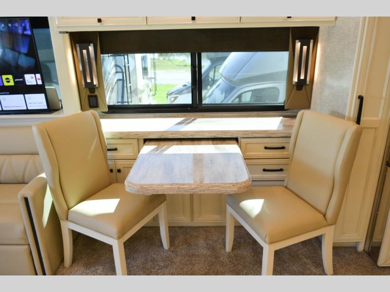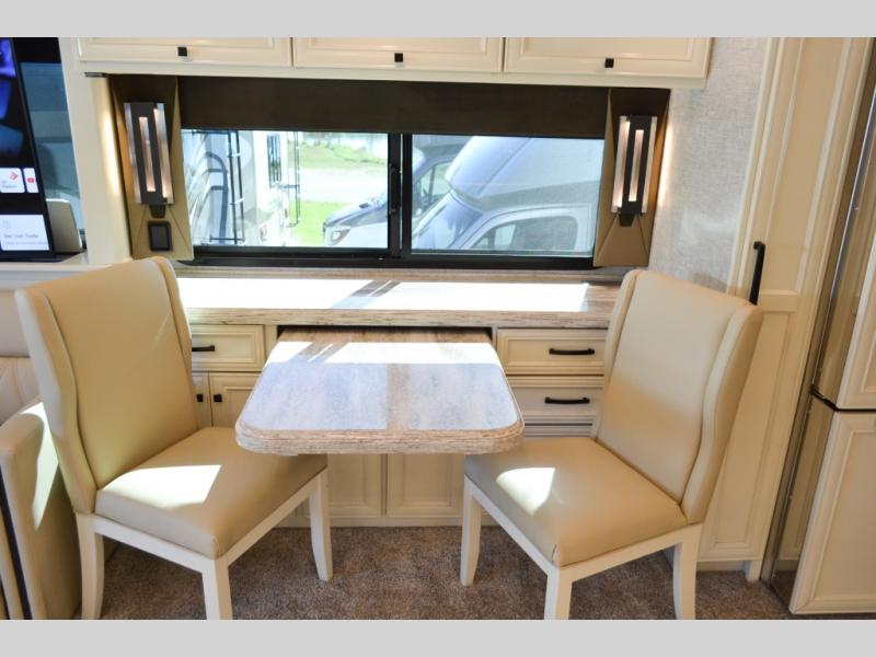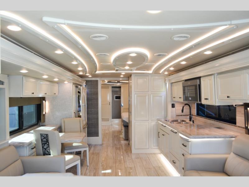 Now you can travel with more friends and family in this coach that includes a bath and a half, and additional sleeping space thanks to the two sofa beds. The master bedroom includes a king bed, a flat-panel TV, plus dual nightstands for your belongings. Dual bath sinks in the full rear bath allow two people to freshen up at once, and you can add the optional washer and dryer to make wash day a breeze. And check out the kitchen with its residential refrigerator, pantry, stainless steel convection microwave, and optional drawer-type dishwasher!