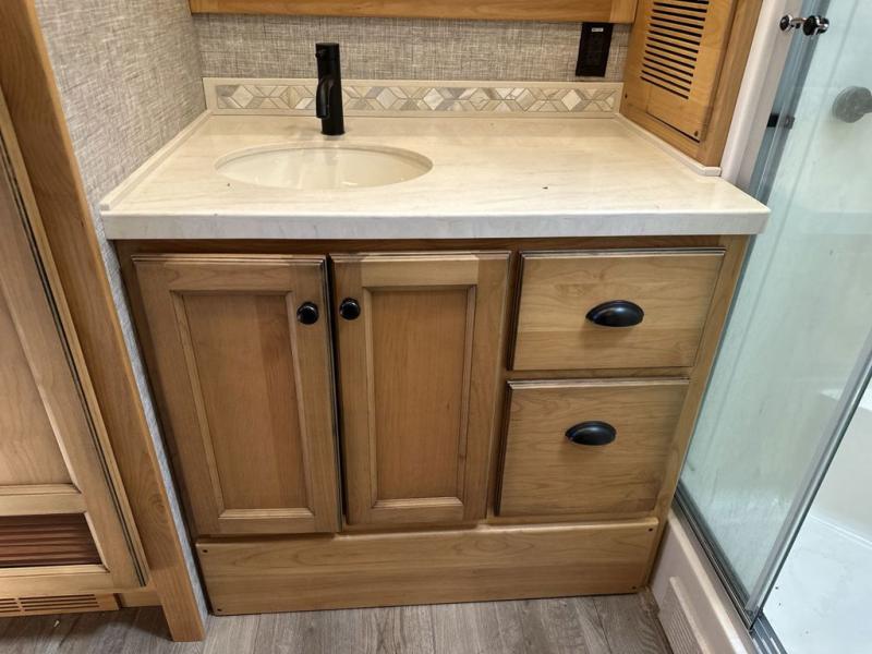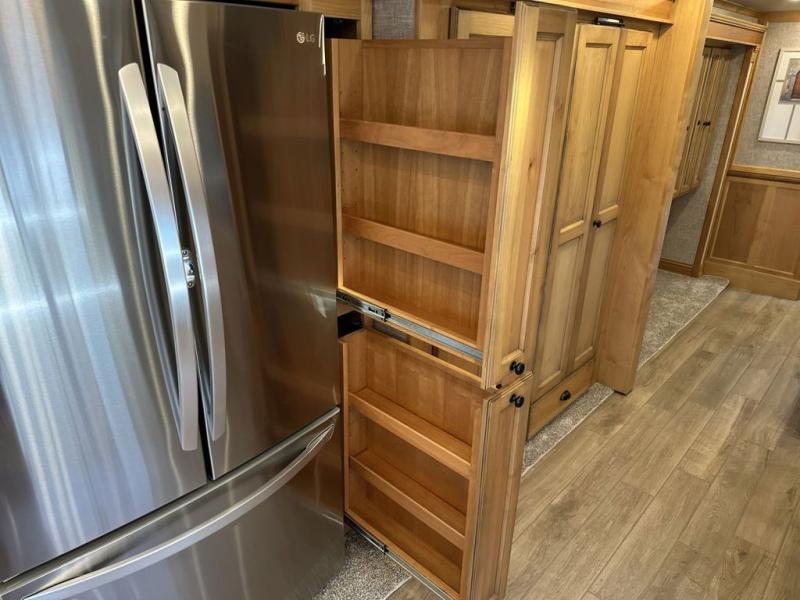 Don't be surprised if you never want to leave this Allegro RED 360 Class A diesel motorhome! You have an excellent amount of sleeping space with the king bed slide, Ultraleather air coil sofa, booth dinette, and bunk beds, but if you would like to have even more sleeping space, you can also add the optional drop-down bunk above the cab. The other thing you have quite a lot of is entertainment. There are three flat-panel TVs, a centralized entertainment center with Blu-Ray player, and a sound bar sound system with the living area TV. The kitchen has all of the tools needed to prepare delicious meals while you're out and about, and you will be able to store all of those meal ingredients in the pantry and residential refrigerator. Another feature that makes this coach comfortable is the full and half bathroom. The half bath is located out in the main living area for all, and the full bathroom rests inside the master suite in the back.