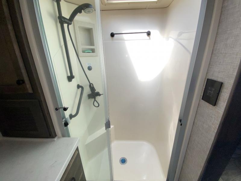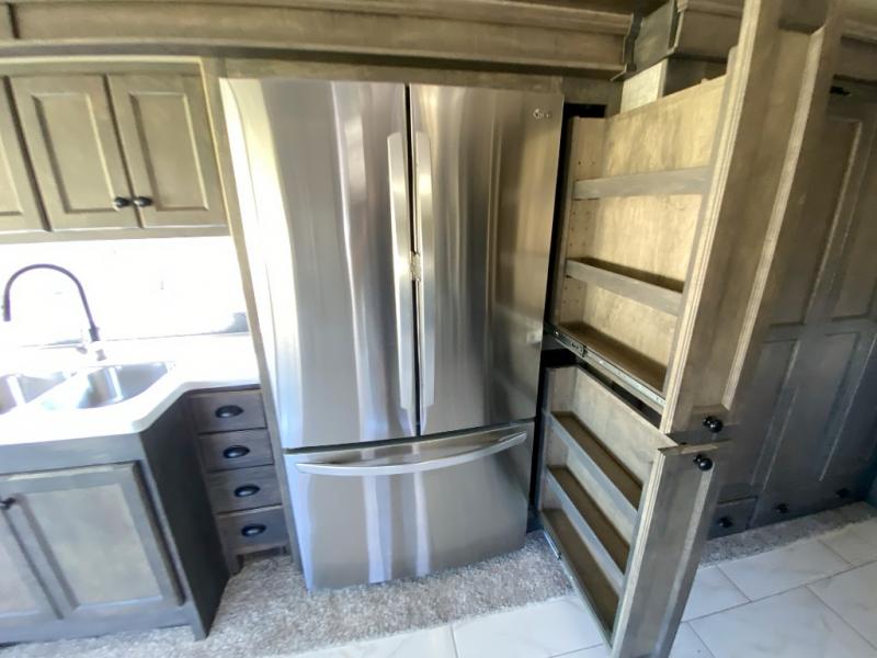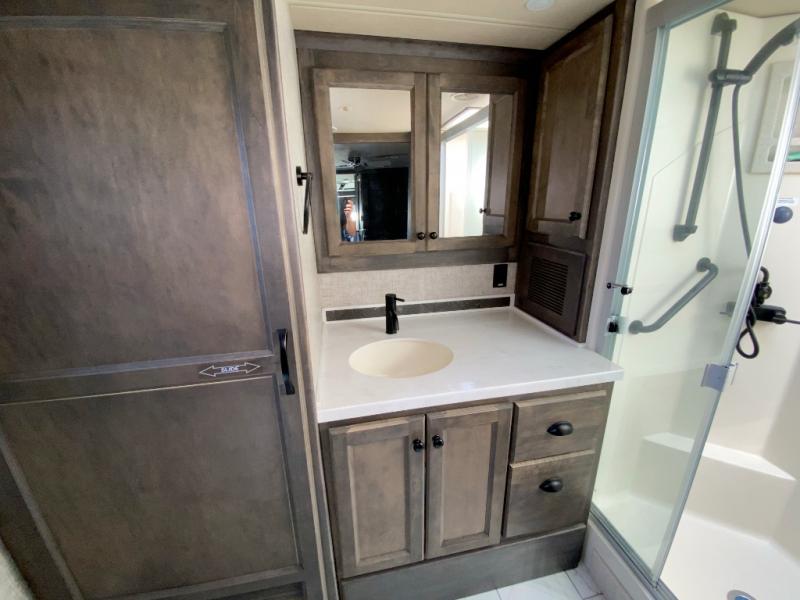 Don't be surprised if you never want to leave this Allegro RED 360 Class A diesel motorhome! You have an excellent amount of sleeping space with the king bed slide, Ultraleather air coil sofa, booth dinette, and bunk beds, but if you would like to have even more sleeping space, you can also add the optional drop-down bunk above the cab. The other thing you have quite a lot of is entertainment. There are three flat-panel TVs, a centralized entertainment center with Blu-Ray player, and a sound bar sound system with the living area TV. The kitchen has all of the tools needed to prepare delicious meals while you're out and about, and you will be able to store all of those meal ingredients in the pantry and residential refrigerator. Another feature that makes this coach comfortable is the full and half bathroom. The half bath is located out in the main living area for all, and the full bathroom rests inside the master suite in the back.
