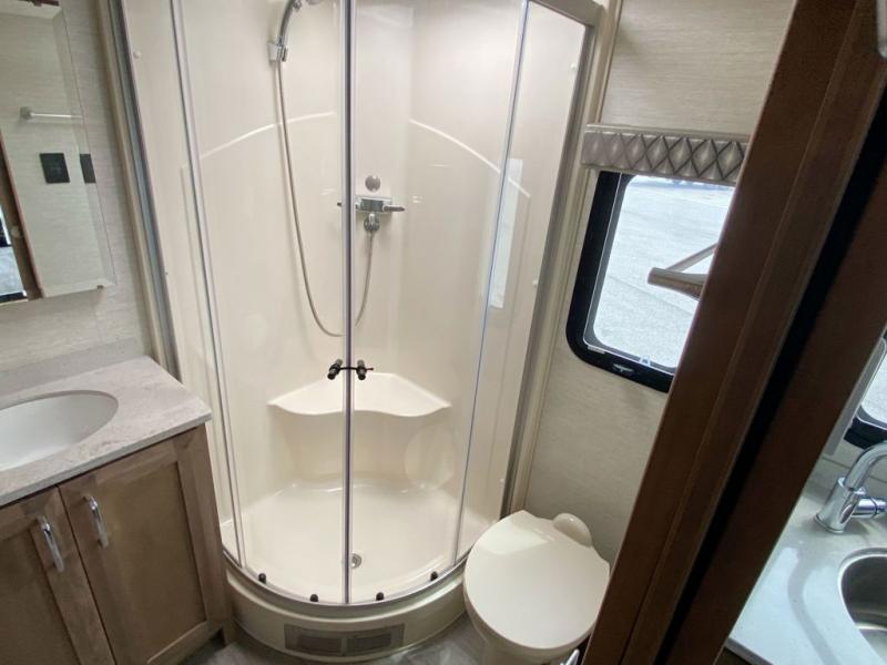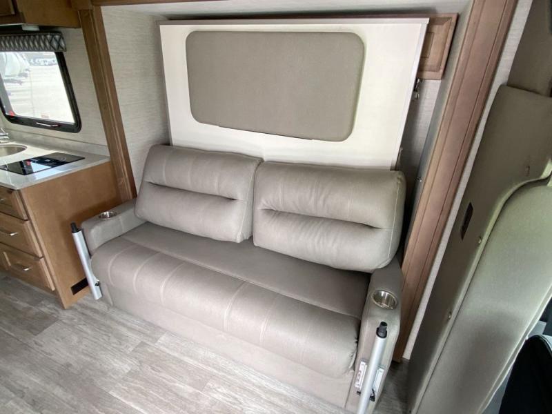 The Tiffin Motorhomes Midas Class C gas motorhome is your golden ticket to greater adventures! The exterior has a Girard® powered patio awning with LED lights that you can use while you're outside lounging. The exterior has also been outfitted with rear mud guards and flush-style tinted windows with tip-out feature, and the outside shower is going to be useful when it's a scorching afternoon in July and you want to cool down or wash off hiking gear. The lockable handles on compartment doors will keep your things secure, and the cargo bay features motion sensor lights for convenience. There's prep for satellite as well as a park cable hook-up so you have choices for entertainment. Inside, you'll find handcrafted cabinetry, a solid surface galley countertop, soft-closing drawer slides, privacy shades, and many more comforts.