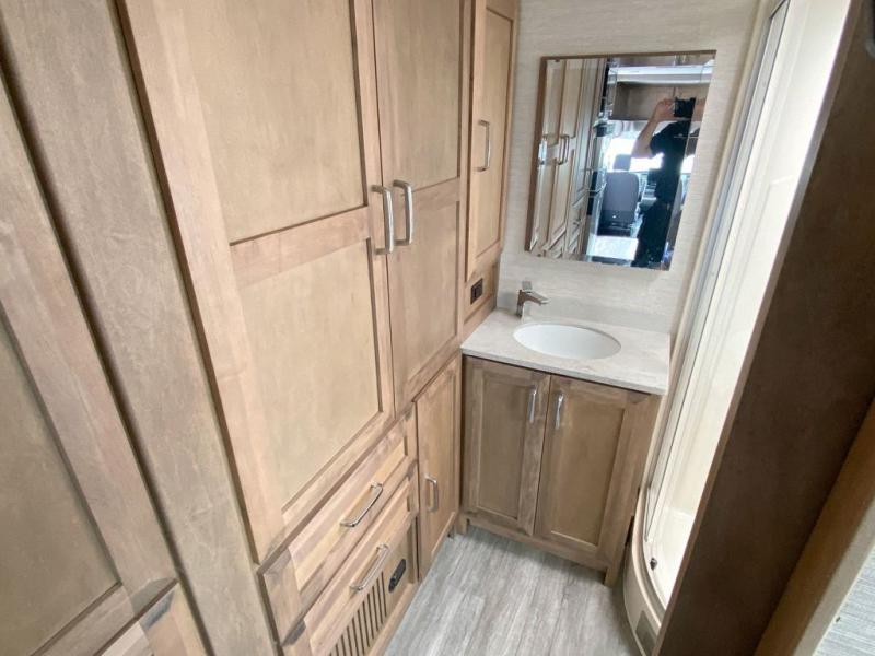 This Midas Class C gas motorhome has a private bedroom in the back with two 32" x 76" twin beds which can convert to an 86" x 76" king bed for ultimate flexibility. The bedroom is also outfitted with a wardrobe, nightstand, and flat-panel TV. You will even find more storage under the beds! The kitchen allows you to prepare that pasta dish you love, and the pantry can store your snacks. Prep meals on the solid-surface countertops and enjoy the high-class look of the handcrafted cabinetry. There is a second TV located just above the front cab seats.