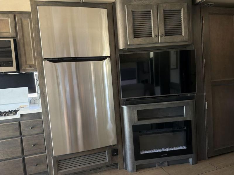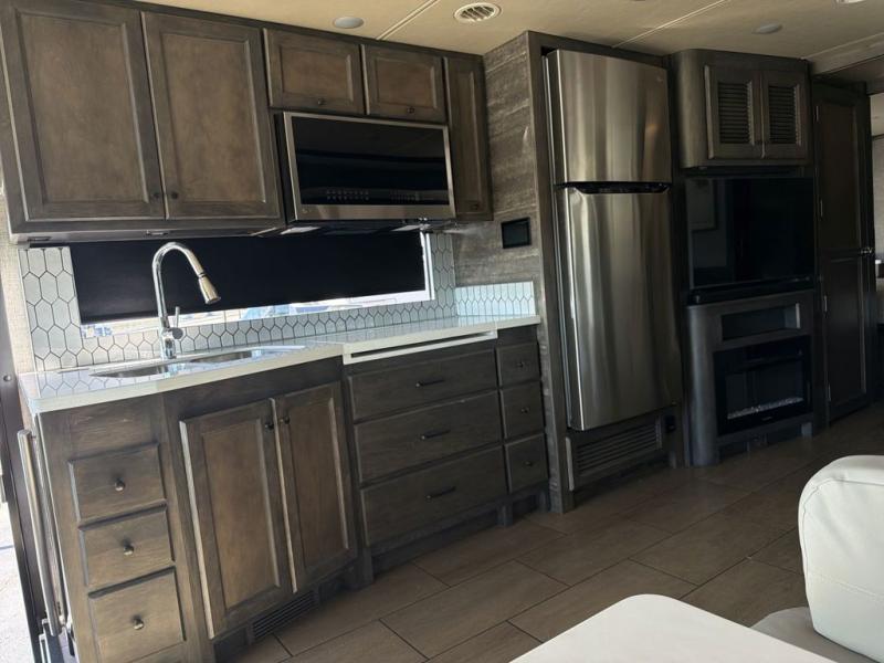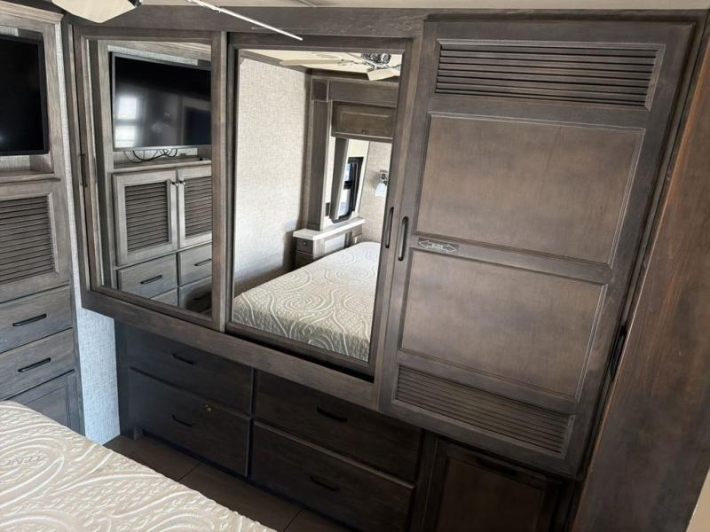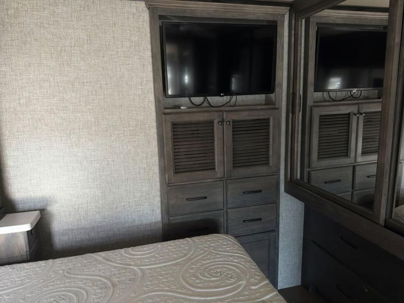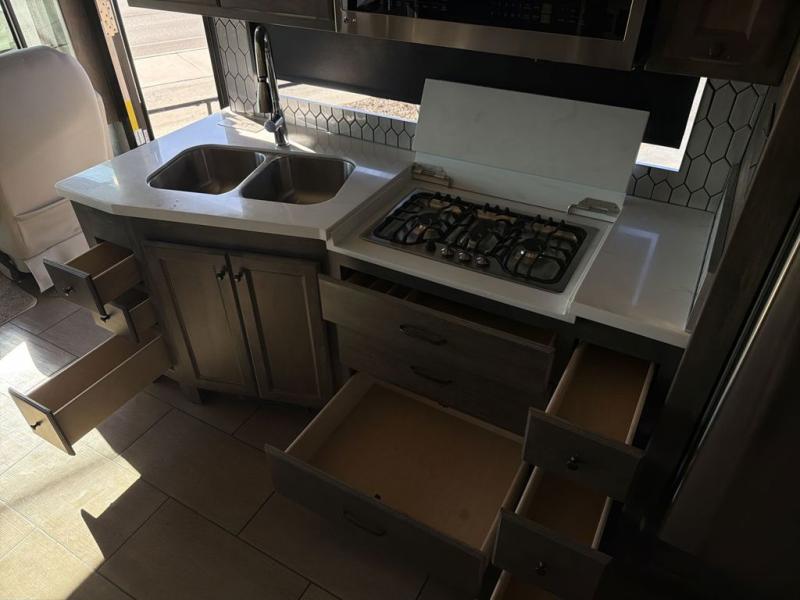 You will feel right at home in this motorhome! It features a rear private bedroom with a king bed slide that has an egress window behind it, a single cabinet with a flat panel TV, bank of drawers below it, and a wardrobe with drawers below, plus an area prepped to add an optional washer and dryer. Just outside the bedroom is the separated bathroom where one person can freshen up in the shower while another uses the private toilet and lav sink. After you have prepared a delicious meal with the three burner cooktop, you can enjoy it at the booth dinette and play a card game or relax on the ultraleather flip and fold sofa bed. The sofa bed can be switched out for an optional ultraleather air coil sofa bed, and the booth dinette can be switched out for an optional dinette with computer work station. You can also choose to add an optional drop-down front bunk for more guests to tag along!