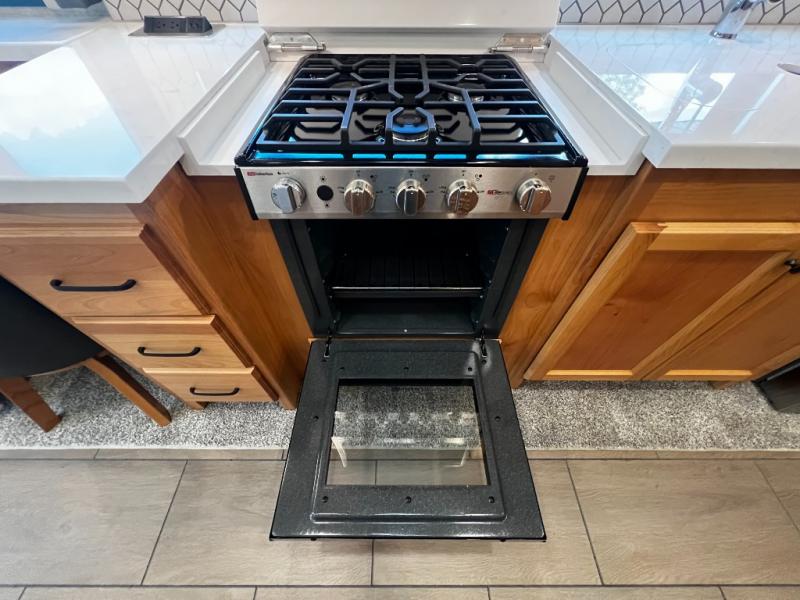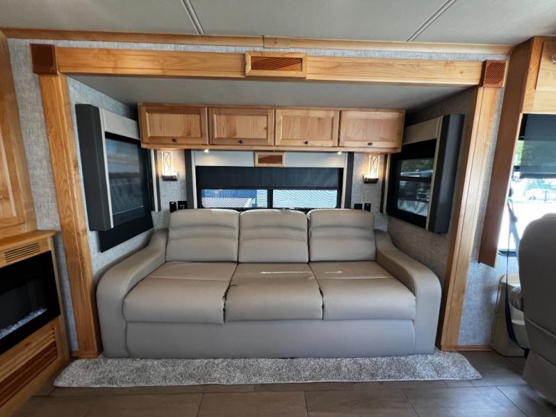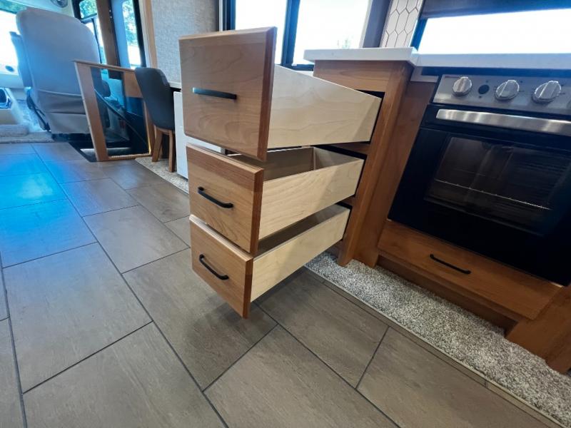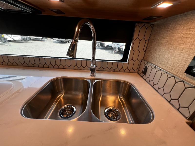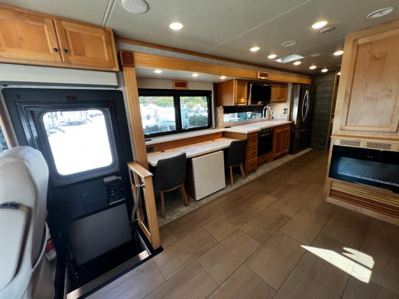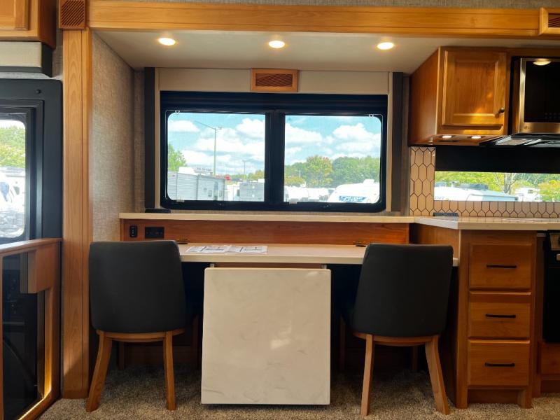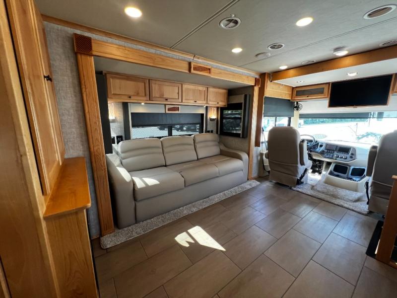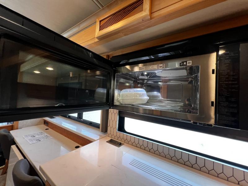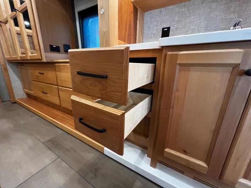 Step inside to a spacious living area with handcrafted cabinetry, UltraLeather furniture, and thoughtful touches like a panoramic kitchen window that invites the outdoors in.