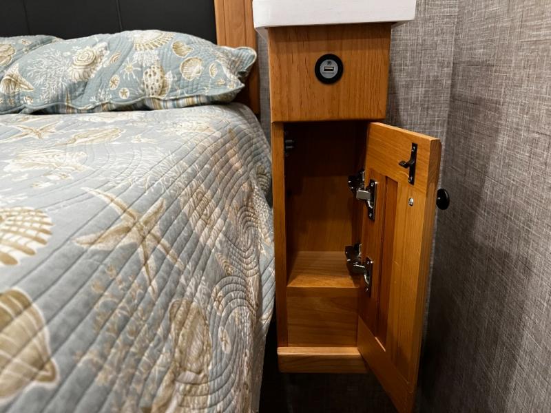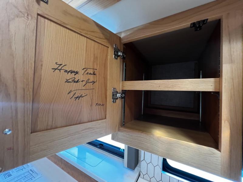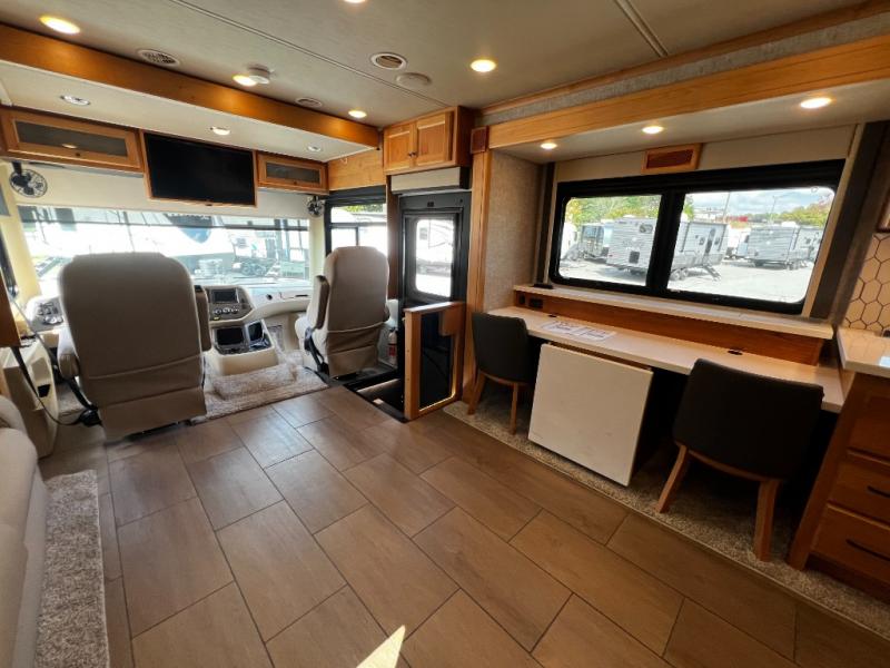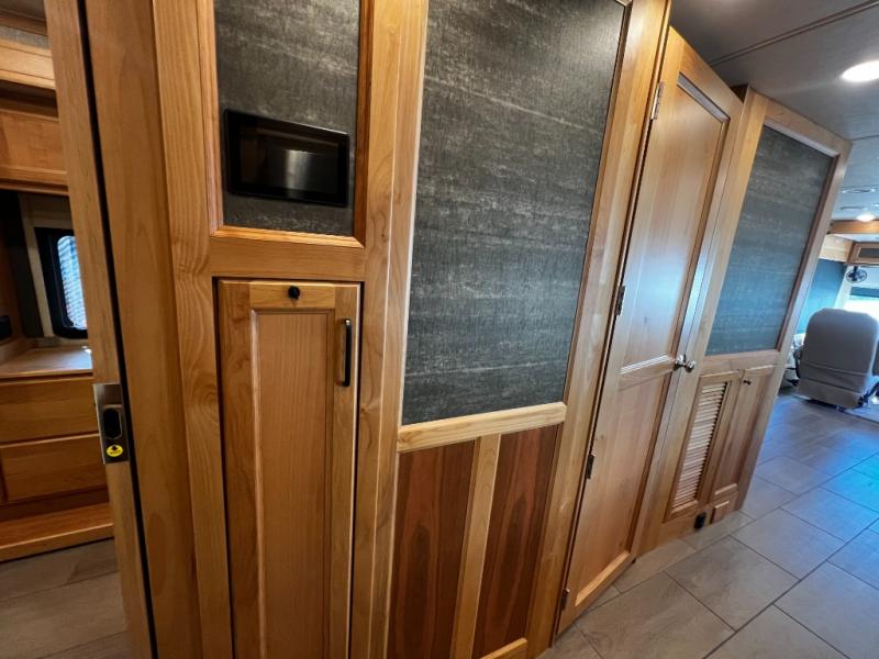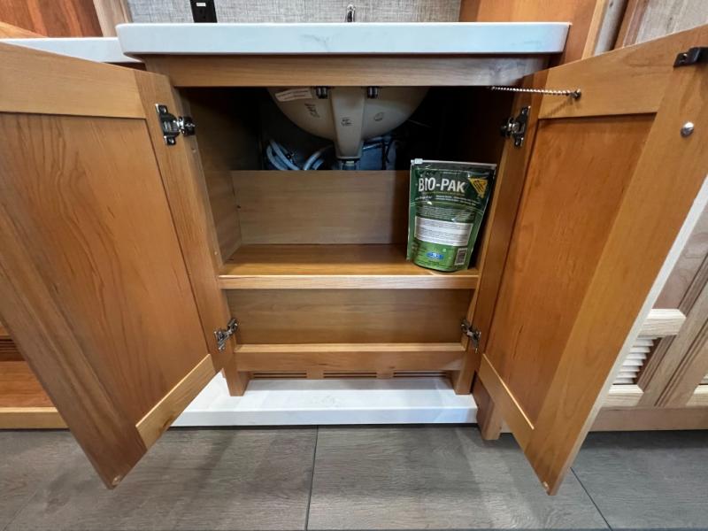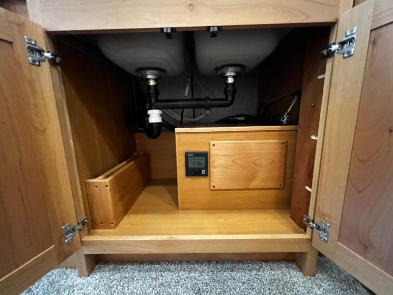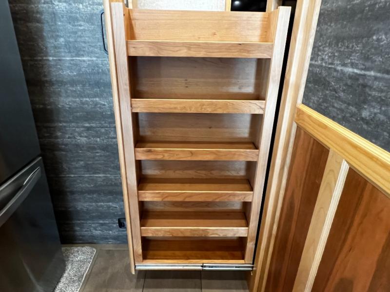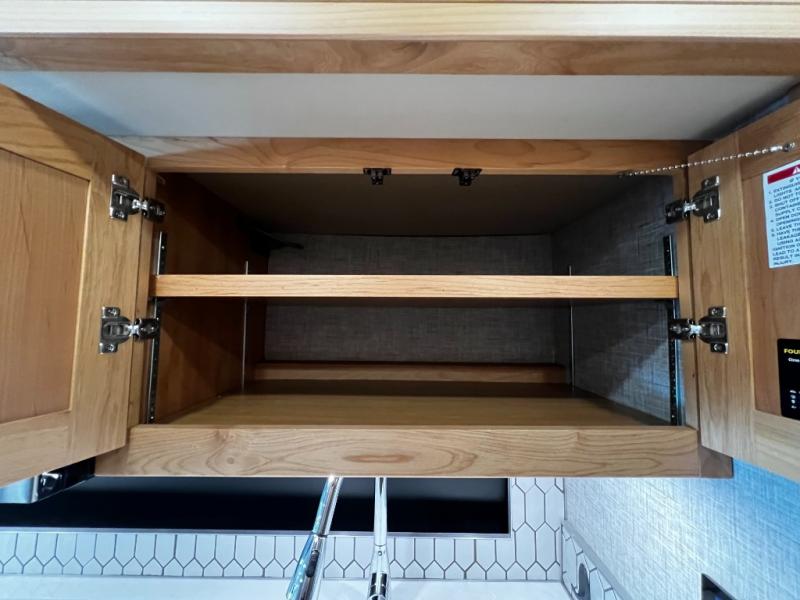 Step inside to a spacious living area with handcrafted cabinetry, UltraLeather furniture, and thoughtful touches like a panoramic kitchen window that invites the outdoors in.