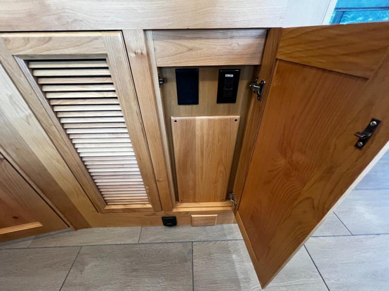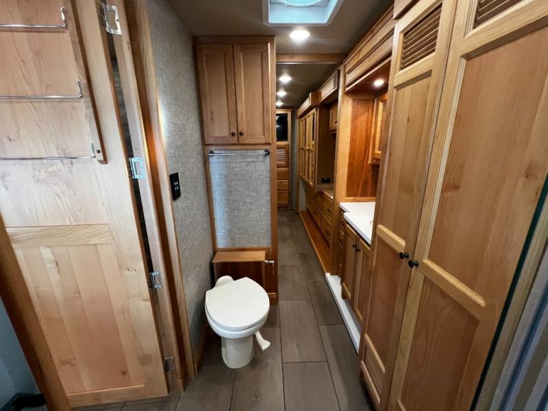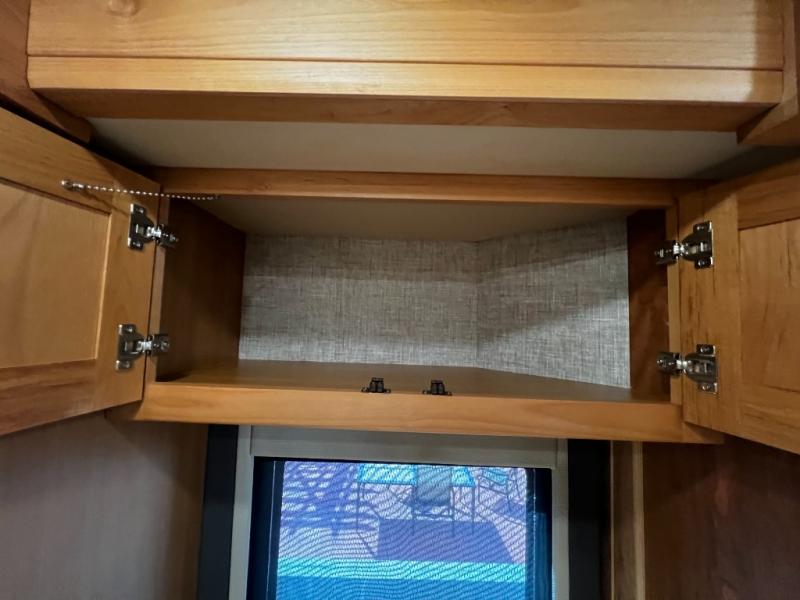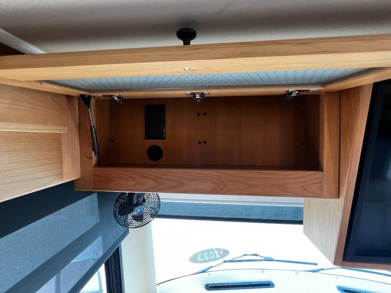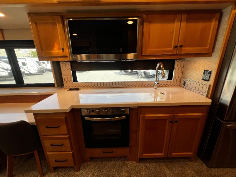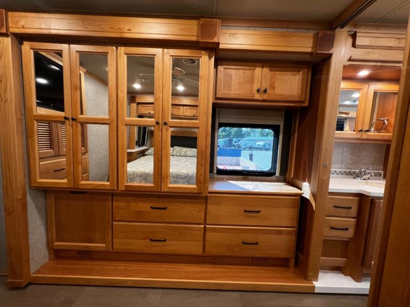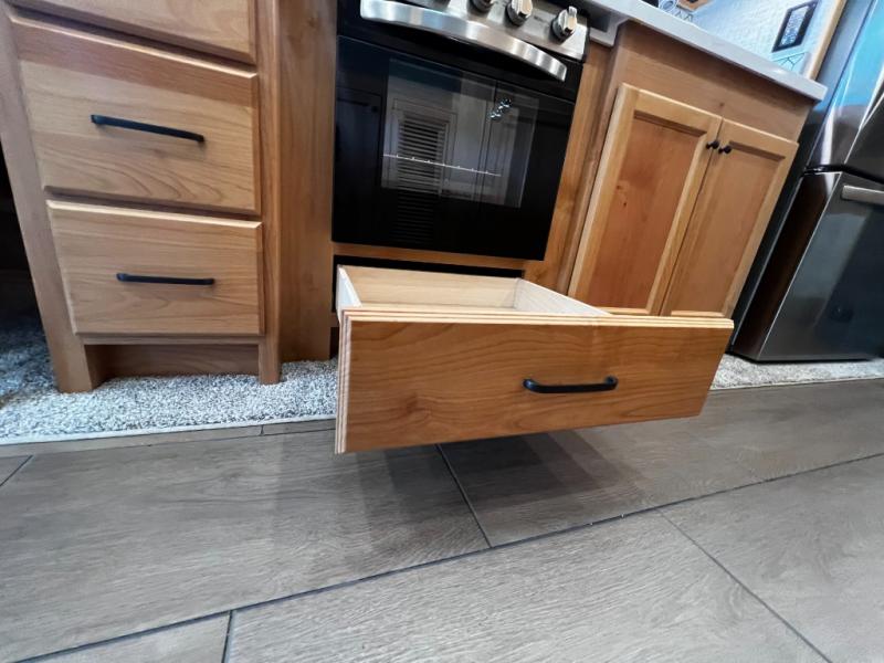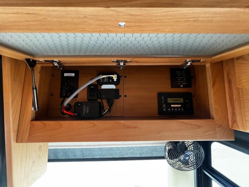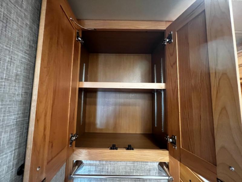 Step inside to a spacious living area with handcrafted cabinetry, UltraLeather furniture, and thoughtful touches like a panoramic kitchen window that invites the outdoors in.