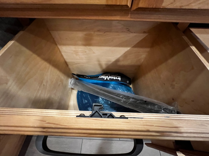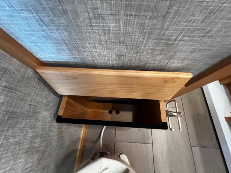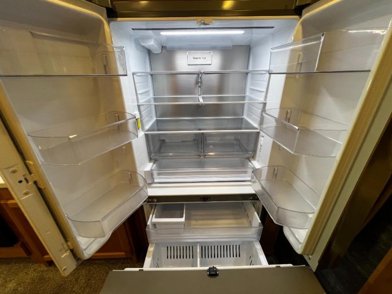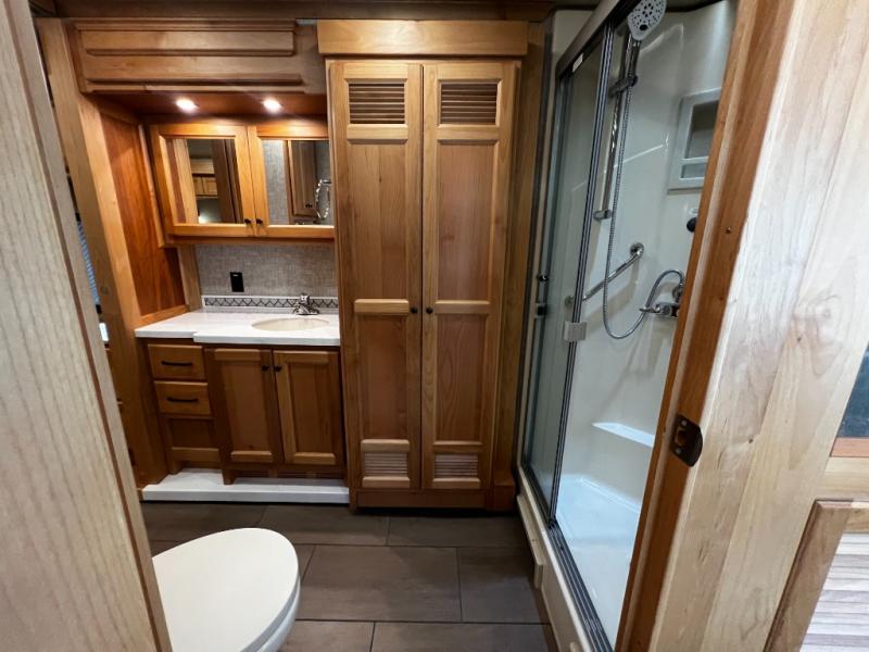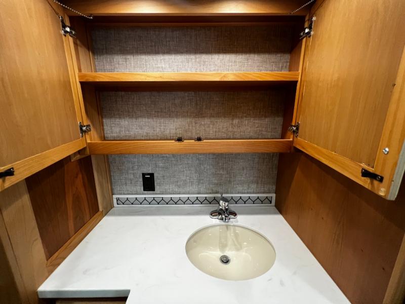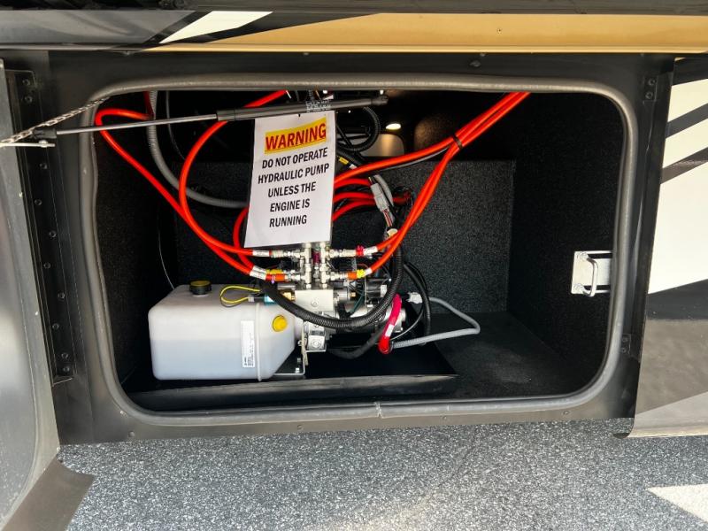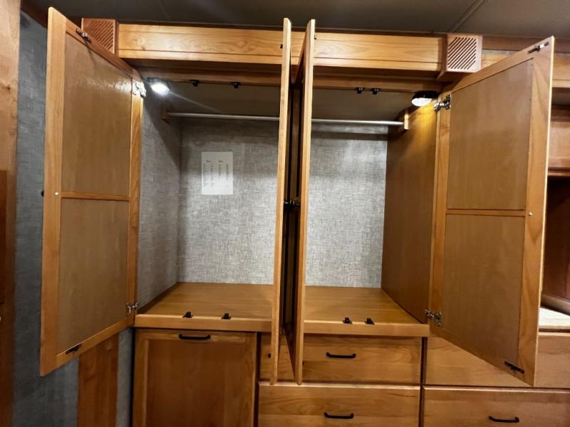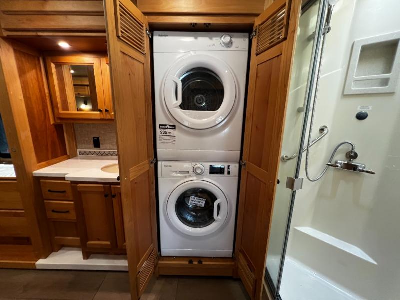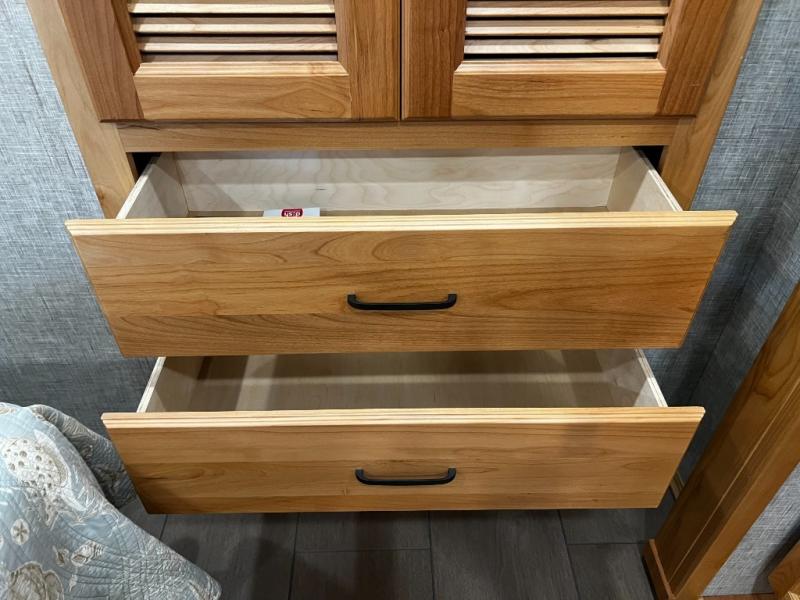 The rear private bedroom is your retreat on the road, complete with a king bed slide, ample drawer and cabinet storage, and a TV entertainment area. There’s direct access to the dual-entry bath, which features a spacious shower and washer/dryer prep, making extended trips effortless and clean.