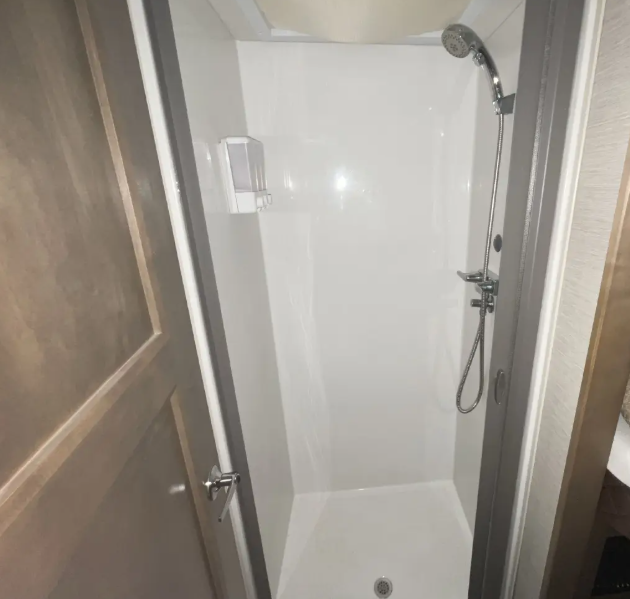 The split bathroom design allows two people to get ready at once, with the shower on one side and a private toilet and sink across from it. Plus, the Aquaview Showermiser water-saving system helps conserve water, especially when boondocking.