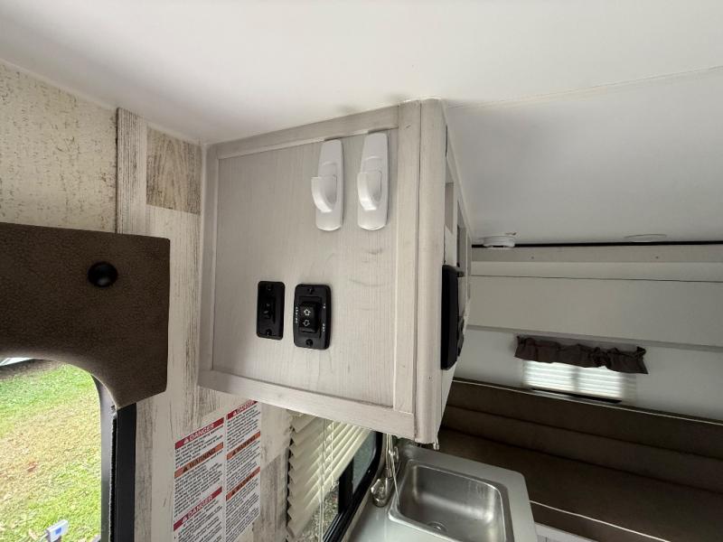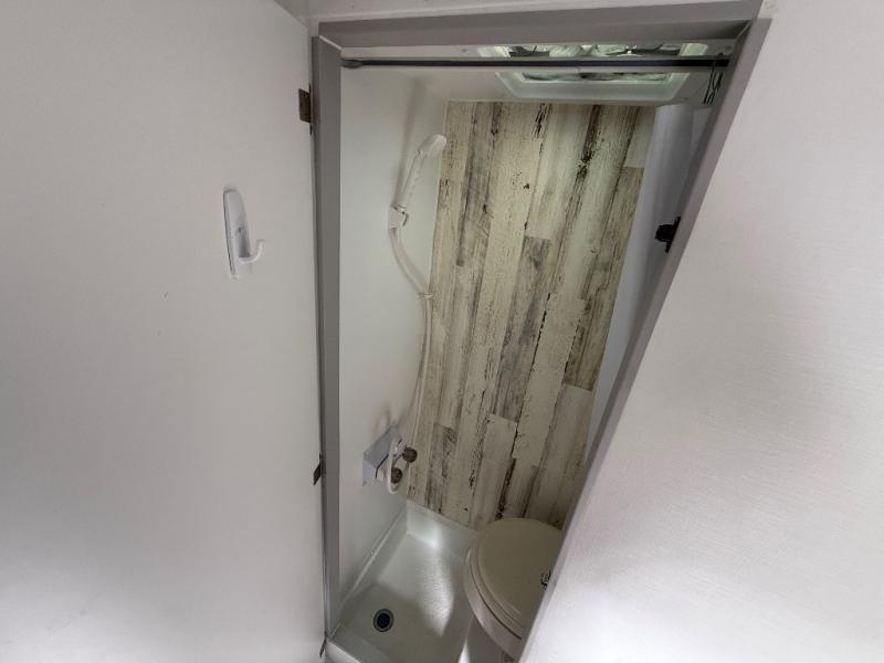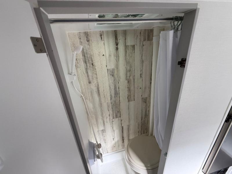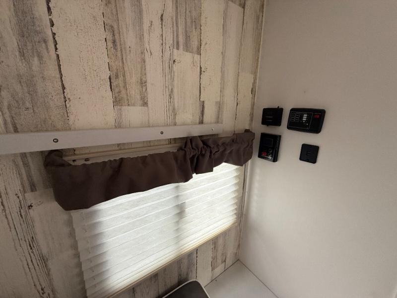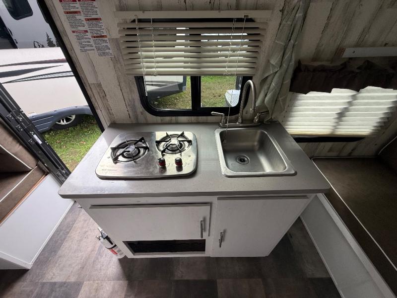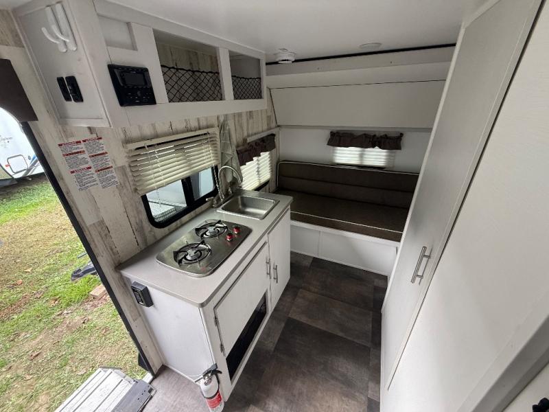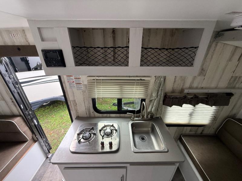This travel trailer is ready for an adventure when ever you are! You can prepare home cooked meals using the two-burner stovetop, the 3.3 cu. ft. 12V refrigerator, and the single bowl stainless steel sink, then enjoy them at the front booth dinette which can transform into a 54" x 74" bed. Grab a snack from the kitchen pantry and relax on the rear sofa with overhead cabinets and a bunk bed above it, plus it can also transform into a 36" x 74" bed for sleeping too. With a wet bath, you can rinse the sand out of your hair after a fun day at the beach and the fantastic vent will eliminate any unwanted steam!