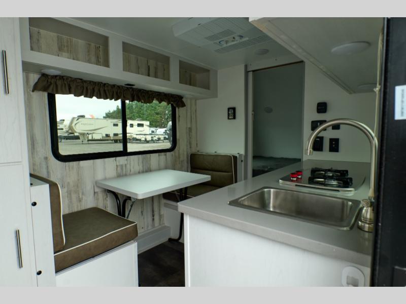 The perfect couples travel trailer for those wanting to upgrade from tent camping and with the optional off-road package you can venture a little off the beaten path if you like with 15" tires and a raised suspension. This unit features a roomy and convenient rear bath. Just inside the entry door, you will find a sliding space saving barn door into a bathroom featuring a 24" x 25" shower with shelf, toilet, and storage cubby for towels and toiletries. The kitchen equipment will allow you to cook inside when you don't want to make dinner over a campfire. Here you will find a sink, a two-burner stovetop and a 3.3 cu. ft. refrigerator beneath counter space and overhead storage for your paper products and non-perishables. A cozy booth dinette allows you dining space, a place to sit and enjoy a game of cards, or your morning cup of coffee. A second sliding barn door in front leads you to the 48" x 75" bed up front that you will appreciate for a great night's rest.