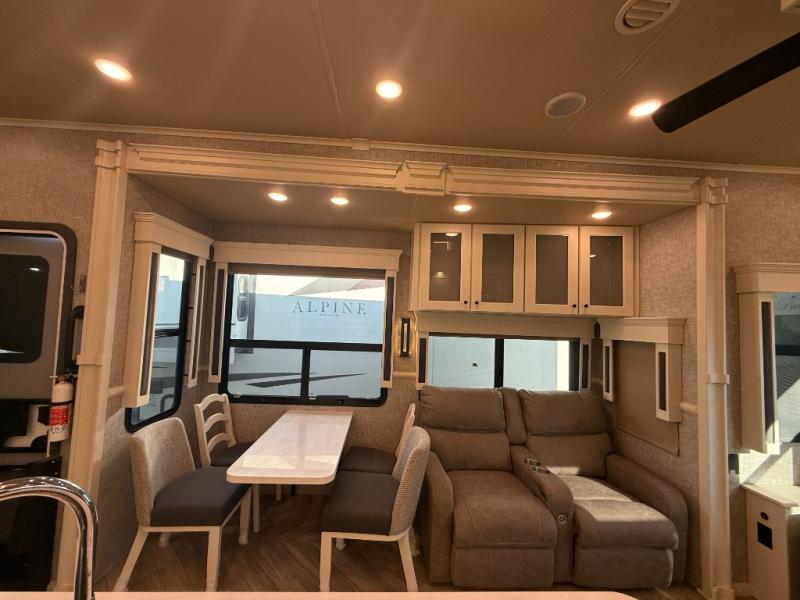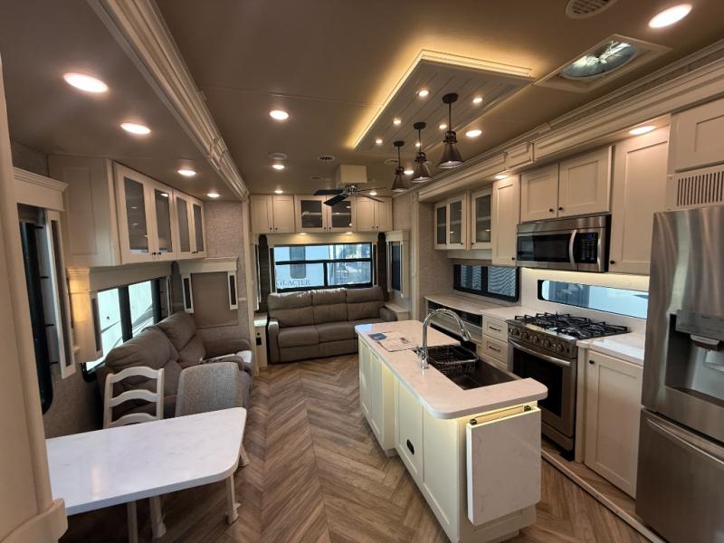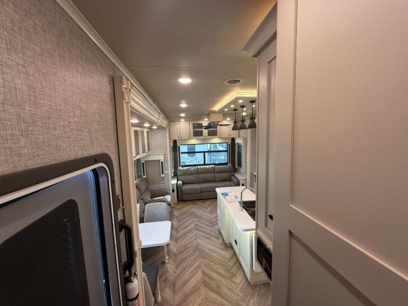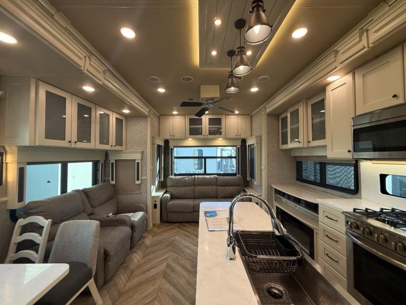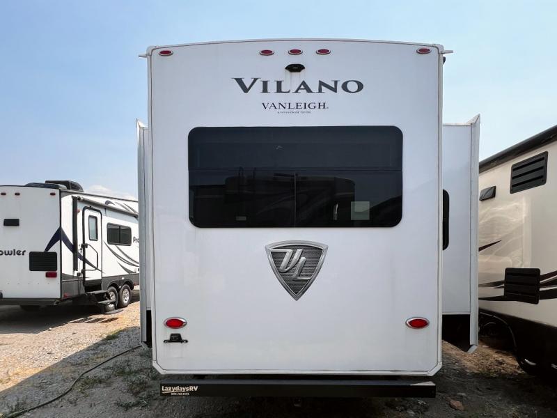 With any Vilano fifth wheel by VanLeigh will you enjoy all the comforts from home with you wherever you go. You can rely on the quality construction materials, such as one-piece sidewalls, laminated slide box end walls, and tubular aluminum upper support walls. Some of the convenient features you are sure to love are the multiplex wiring system with a digital homescreen, the Whisper Quiet A/C system, and the wet bay to manage all things "water" in your fifth wheel. These models include recessed LED ceiling lighting throughout, stainless steel appliances, and solid hardwood cabinetry that will make it feel more like a custom-built home. Each model is prewired for solar panels and back-up camera to make parking easier than ever.