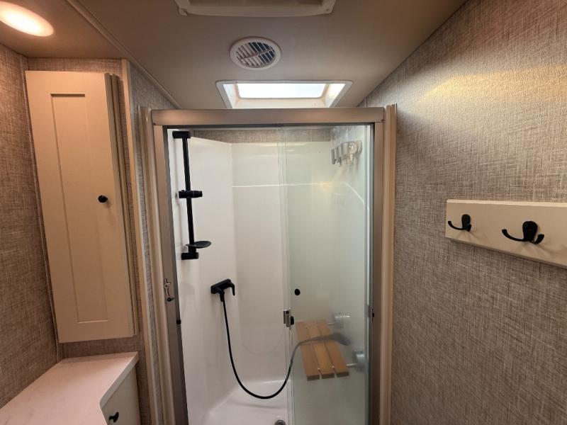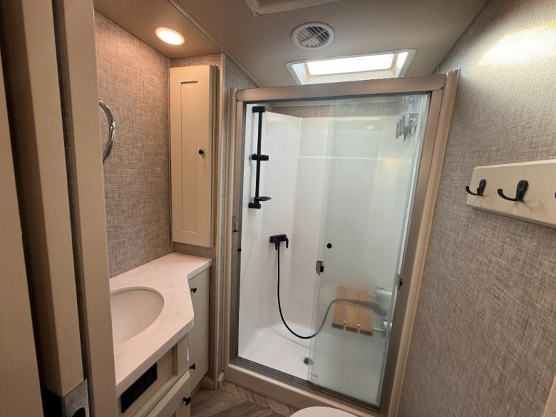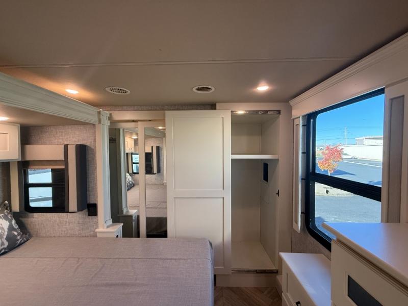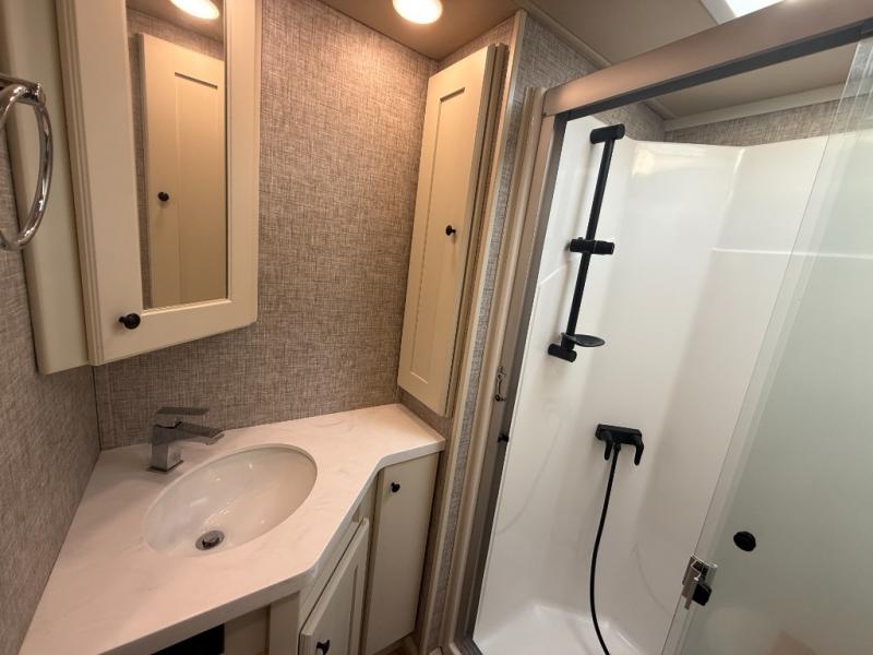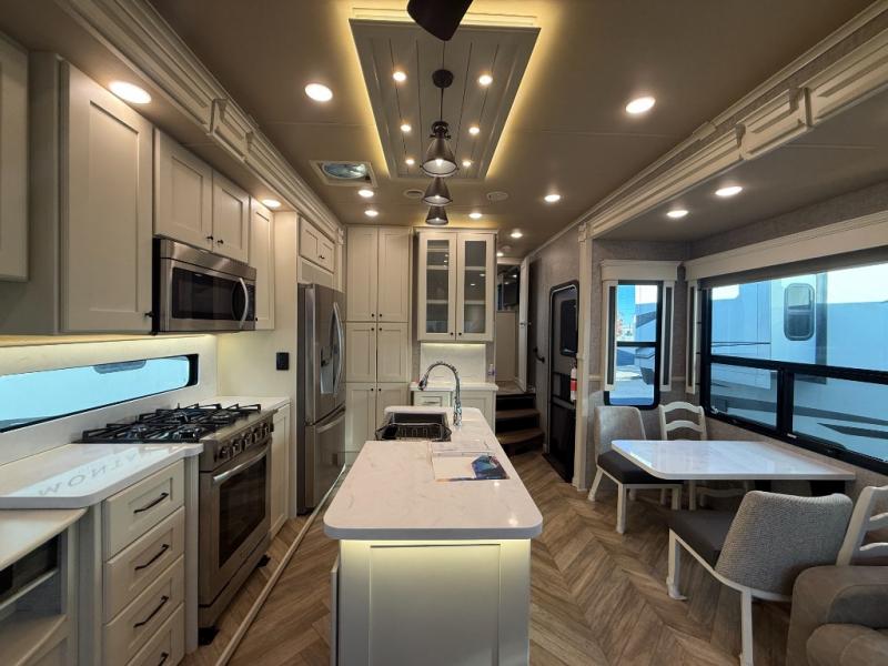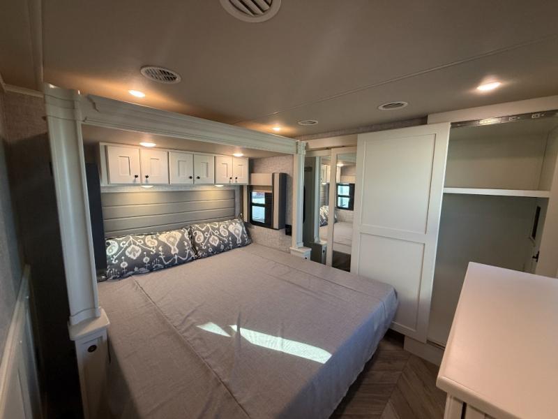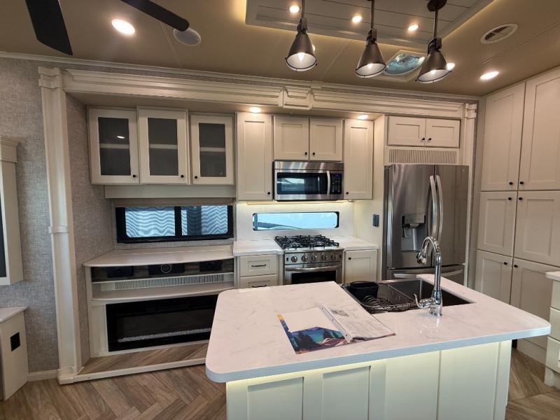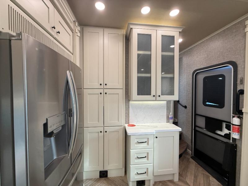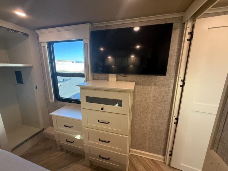 Enjoy luxury at every turn in this Vilano model. The dual opposing slides in the main living area provide space to relax comfortably on the sofa bed or theater sofa seats, and there is a 40" fireplace with an LG Smart TV for a warm, cozy feel. The chef will love cooking in the kitchen with its stainless steel convection microwave and a stainless steel Insignia oven, plus there is a large pantry and a residential refrigerator to store food for weeks. The front private bedroom will feel just like home with its slide out king bed and residential hardwood headboard, hardwood dresser, and a full-sized wardrobe with motion sensing lighting!