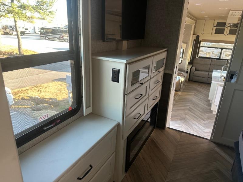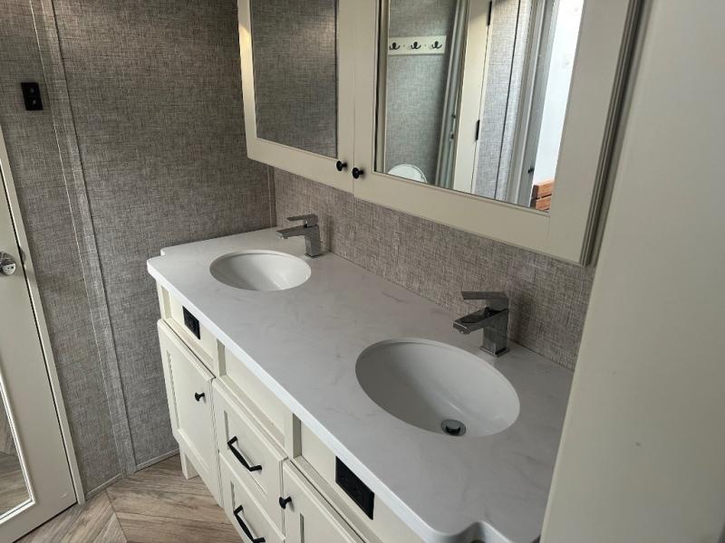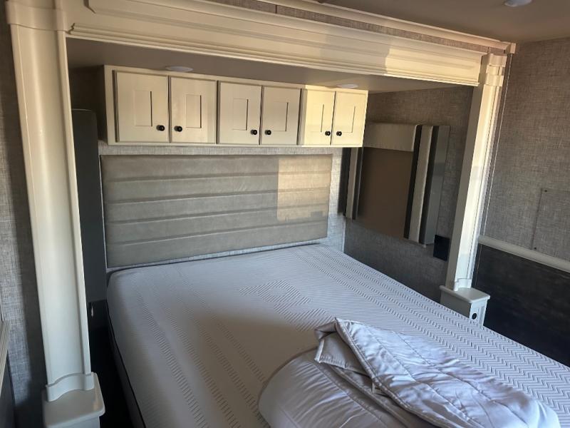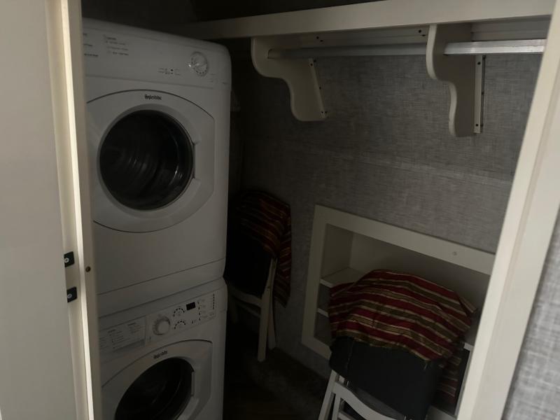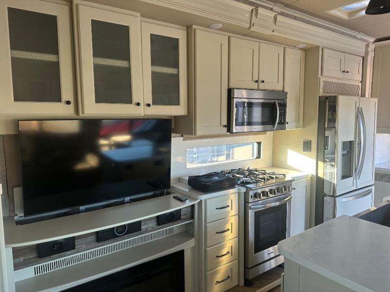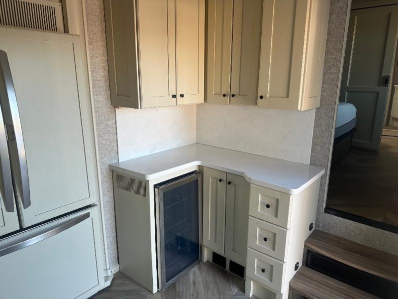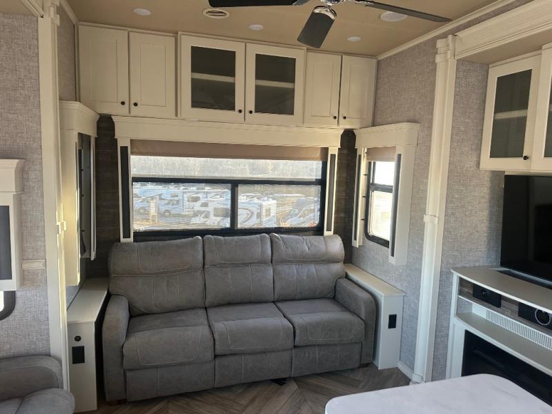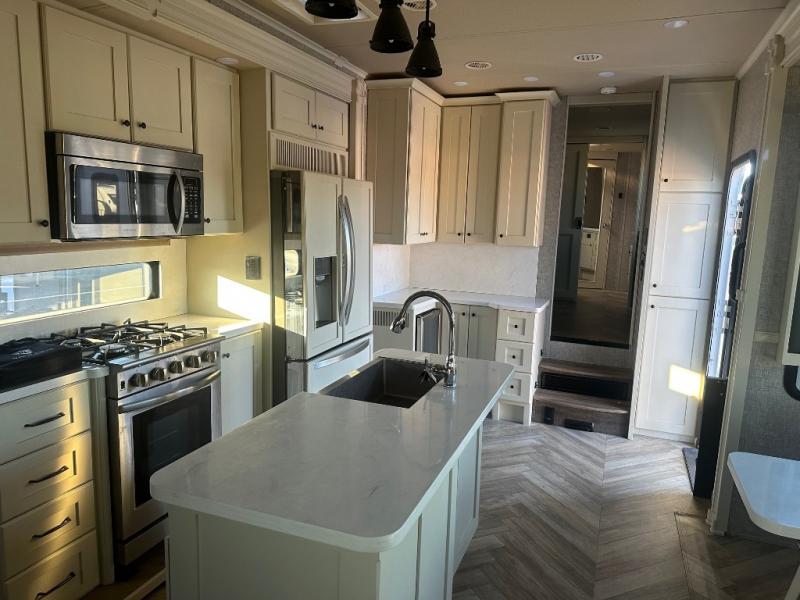 You'll have everything you need and more when you travel with this fifth wheel. The kitchen is packed with convenient features, such as a kitchen island with overhead lighting and an optional dishwasher, plus a hutch with upper and lower cabinets to store glasses and such. Your friends and family can relax on the rear sofa bed, the theater sofa, or the dinette with chairs. The master bedroom includes a king bed with a cool mattress, a hardwood dresser, and USB ports in the nightstands for convenience. You will look forward getting ready each day thanks to the front bath that includes a spacious shower, dual bath sinks, and a front closet to store all your clothes. You might like to add a washer/dryer option as well.