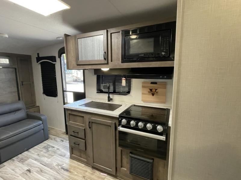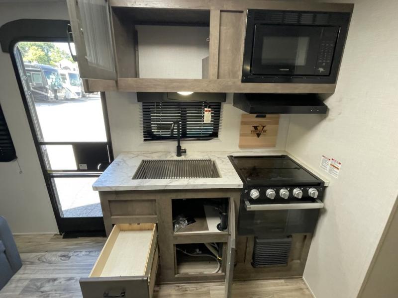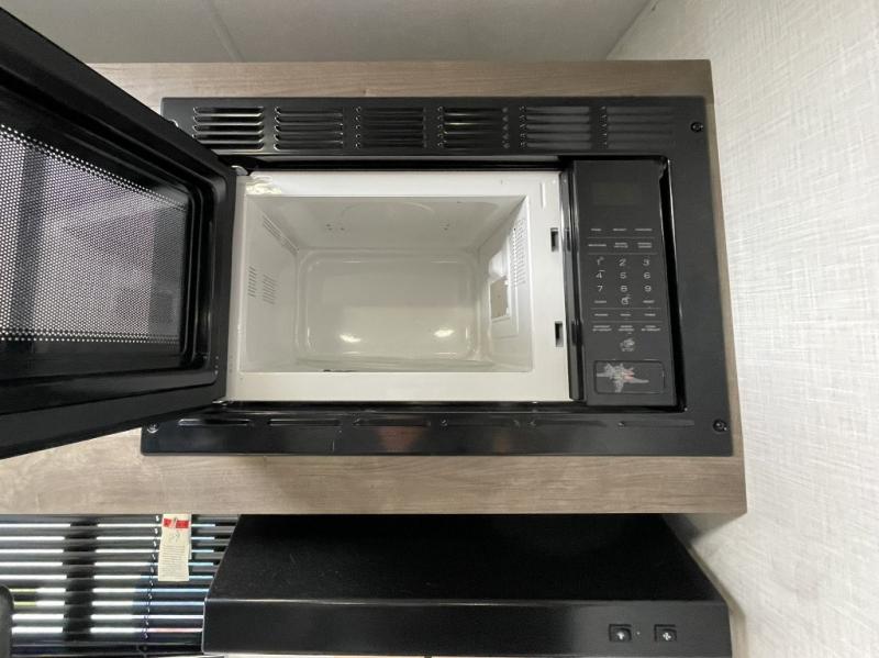 Prepare meals on the go with a two-burner cooktop, microwave, and plenty of storage for pantry essentials. -