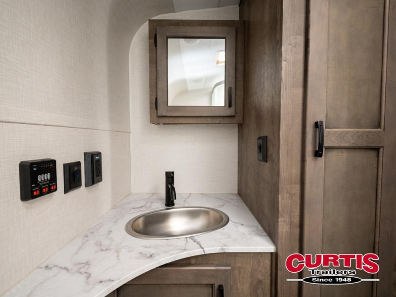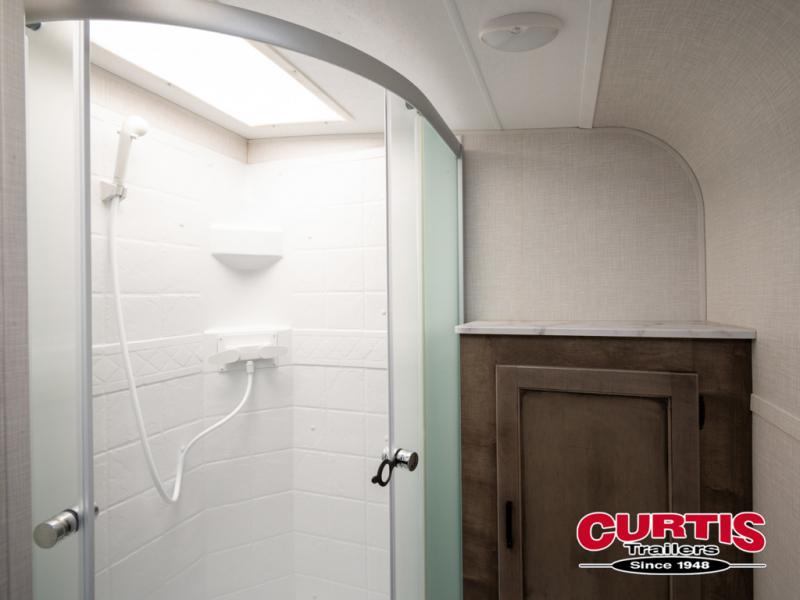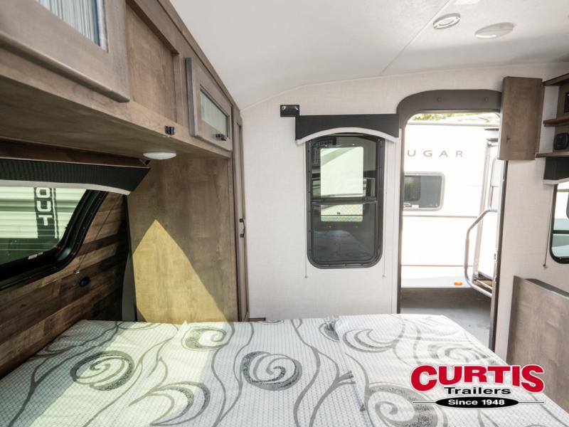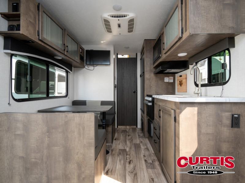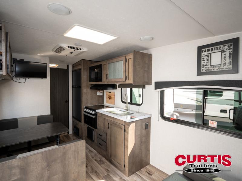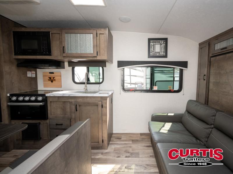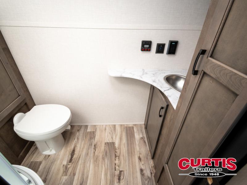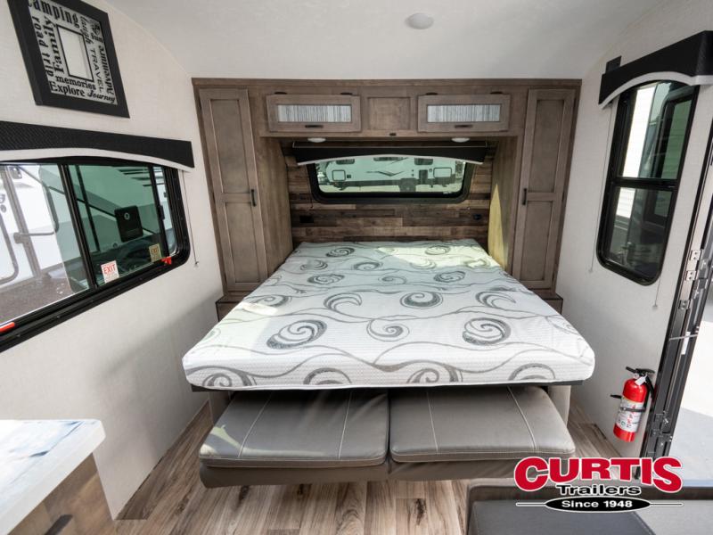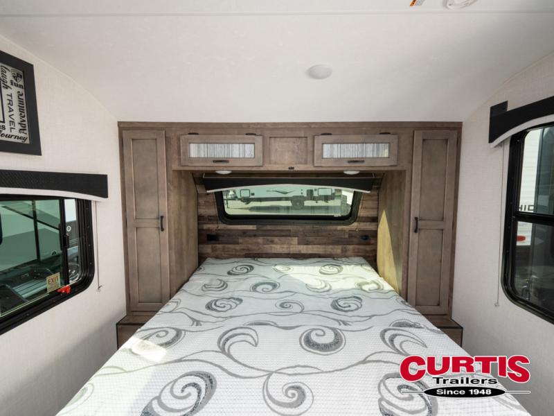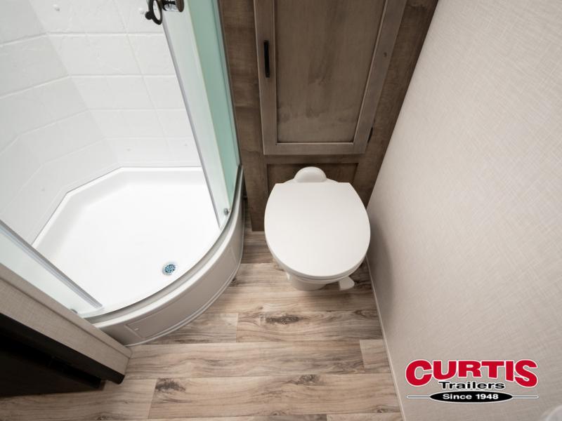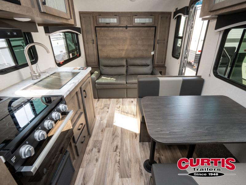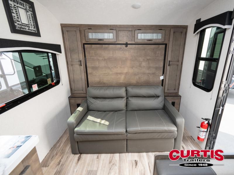 This versatile travel trailer gives you a sofa during the daytime to relax on up front and a Murphy bed to easily setup at night. There are dual wardrobes for your clothing, StorMore bedside nightstands with a 110V outlet and USB charging for your cellphones and such, and a rear full bathroom with linen storage in two places, a 34" radius shower, and medicine cabinet for more items. The galley kitchen offers appliances to make warm meals and store leftovers, and the booth dinette on the opposite side provides dining inside plus a sleeping space at night. Your outdoor gear can be placed in the pass-through compartment along the exterior, and you can always relax under the 13' power awning before and after the day's activities.