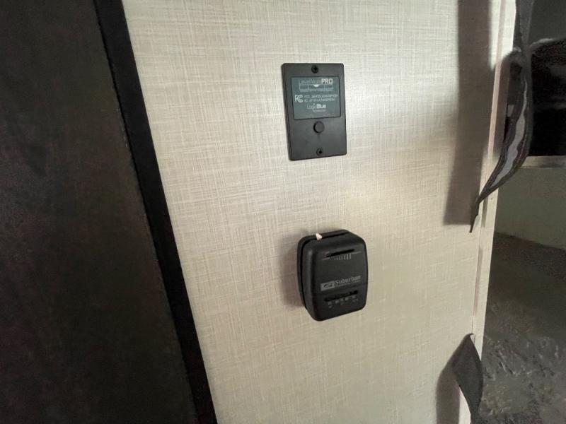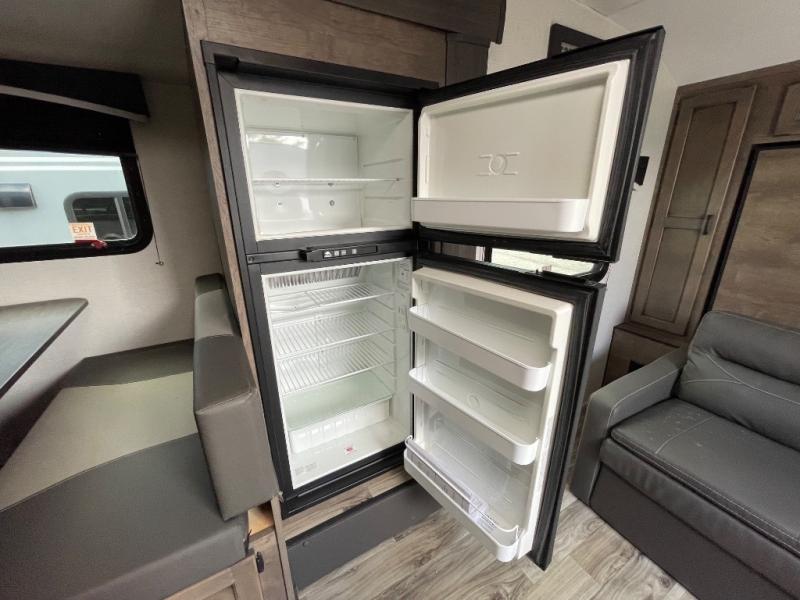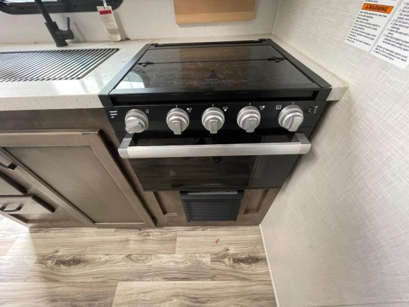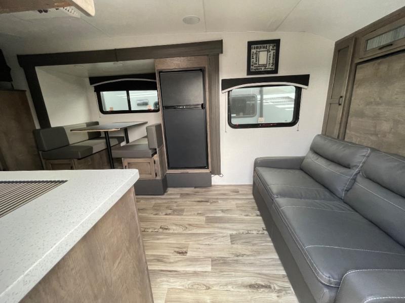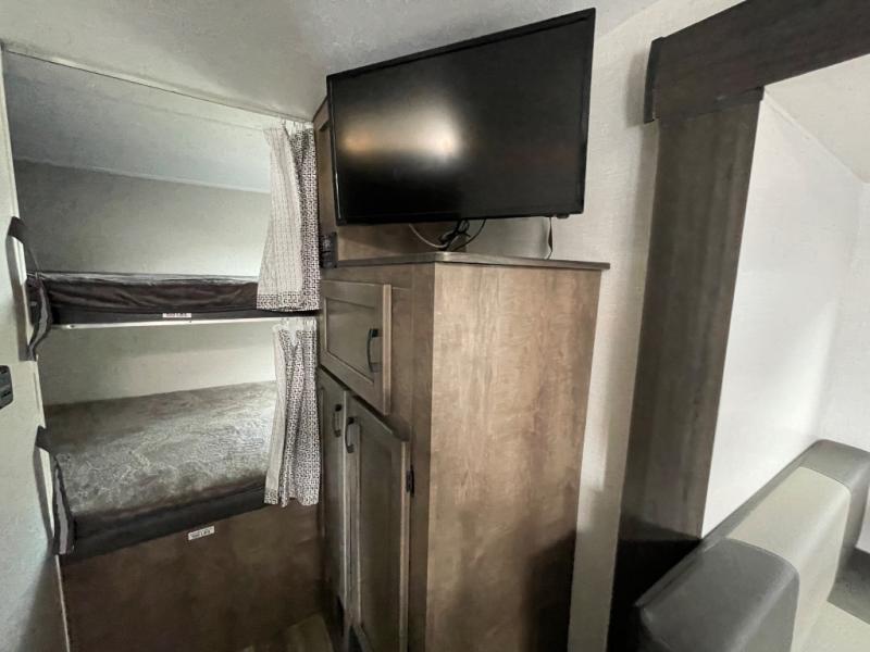 You and your larger group of eight can sleep comfortably in this travel trailer thanks to the Murphy bed up front, the double-size bunks in the rear and the 65" x 48" booth dinette! As the owner you will have the Murphy bed with StorMore bedside nightstands with a 110V outlet and USB charging to keep your phone ready for whatever is next, and the sofa provides a living area up front once the bed is put up into the wall. Your kids or guests will have 48" x 88" bunks and a wardrobe to place their things on the opposite side of the trailer. The cook can make warm meals in the kitchen or outside on the campfire café, and then choose to dine inside at the booth dinette or outside under the 14' power awning after grabbing your camping chairs from the exterior pass-through storage with motion-activated light.