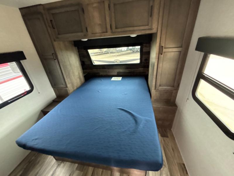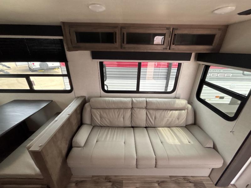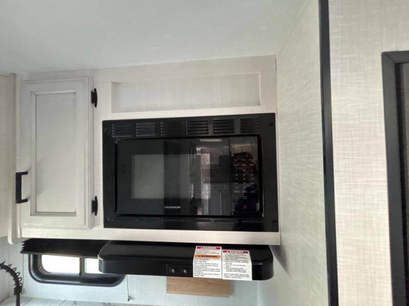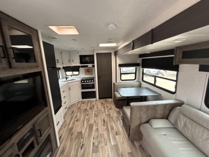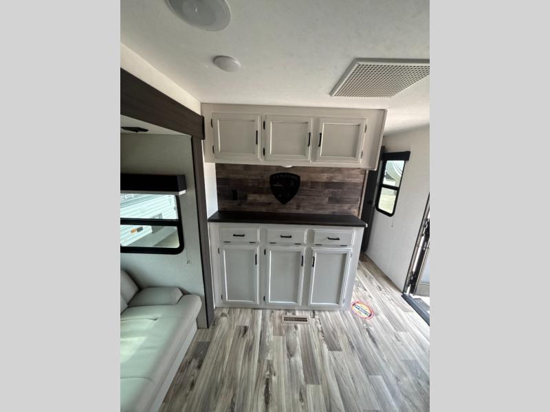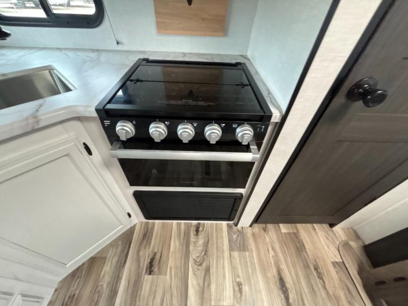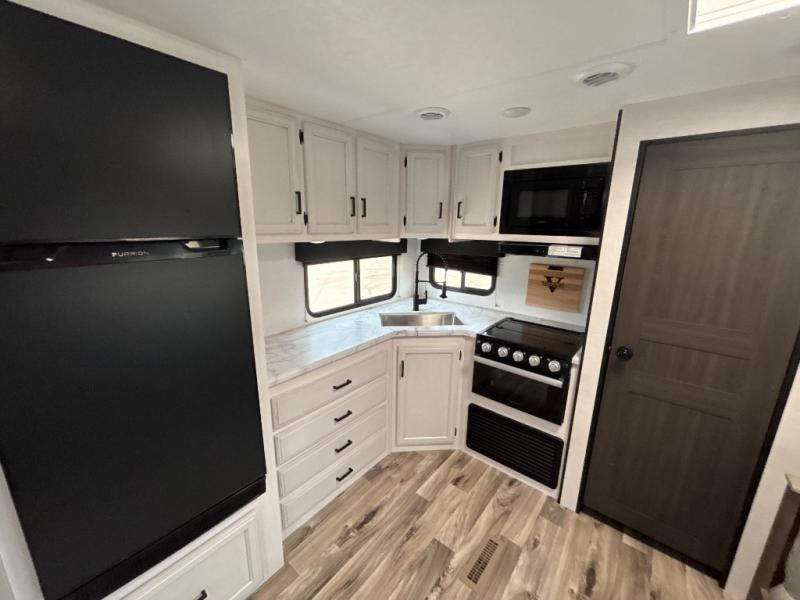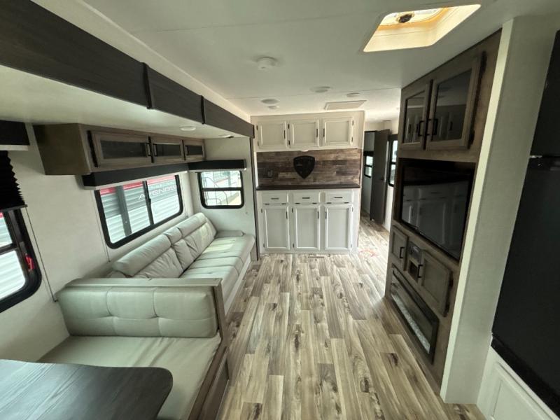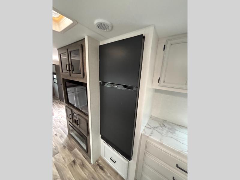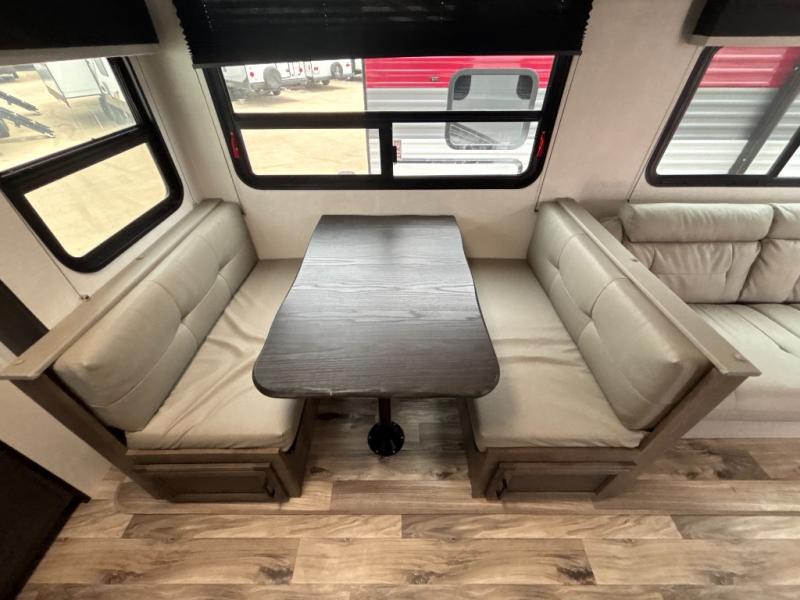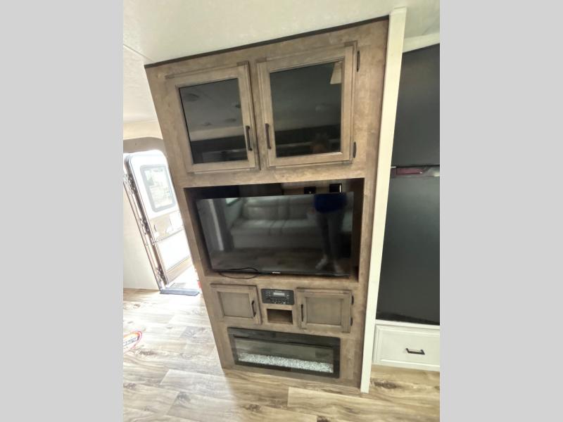 A rear kitchen makes it easy to prepare meals in this travel trailer! The kitchen has a three burner cooktop with a Furrion oven, a 10 cu. ft. double door refrigerator to keep your perishables fresh, overhead cabinets keep cooking essentials nearby, and a walk-in pantry big enough for all of your snacks and canned goods, plus a hutch for your dishes. You could even prepare meals outside with the campfire café which has a sink, a refrigerator, and a griddle. The bench seat gives you a spot to sit while you put on your shoes and the coat hooks above makes it easy to grab and go. Enjoy your meals and card games at the 42" booth dinette and relax on the 70" sofa across from the entertainment center with a 40" TV on a swing arm and a 5,000 BTU frameless fireplace. The front private bedroom has a Sleep Tight queen bed to lay your head on at night and a closet with drawers to keep your clothes looking their best!