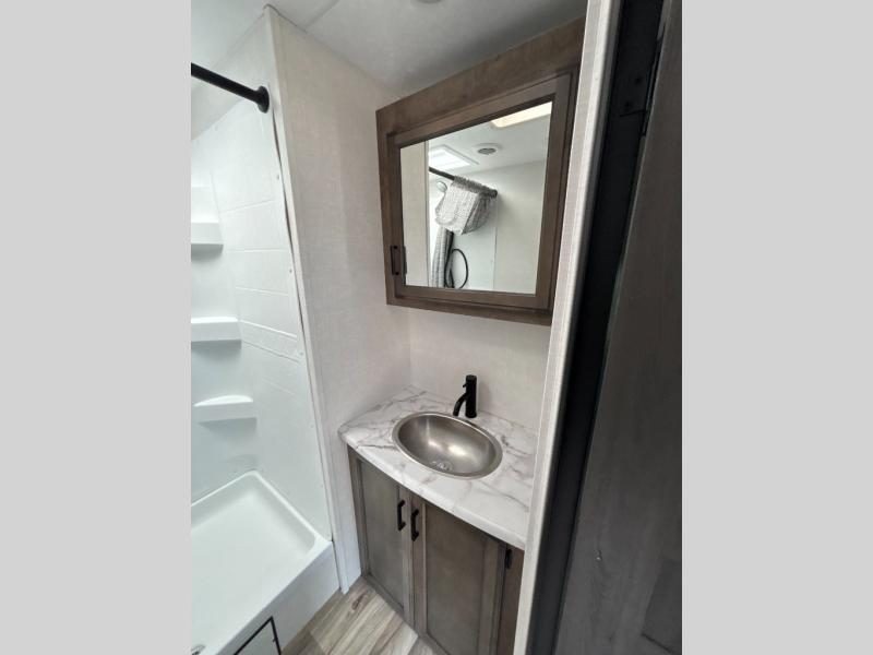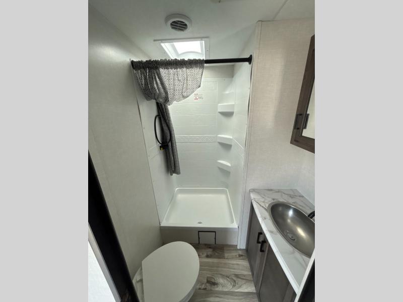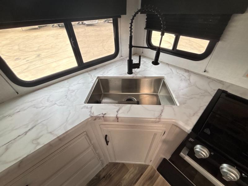 Every Venture RV SportTrek lightweight travel trailer is constructed to offer peace of mind and the comforts of home! Their purposeful residential kitchens are packed with handy features like a recessed gas cooktop with glass cover for more countertop space, a sink cover to drain food and dishes which can be rolled out of the way for sink use, and continuous countertops. You will find plenty of storage throughout with unique areas like the under-seat removable storage tubs below the dinette cushions and the StorMore nightstands on either side of the bed behind the full-length closets. The magnetic slam-latch baggage doors to the spacious pass-through storage area will hold your outdoor gear in place. They even come with a hot and cold exterior shower and SporTrek's Weather Shield which includes a radiant foil barrier, forced heat, enclosed underbelly, enclosed gate valves, and a reflective PVC roof membrane. What more could you want, come find your favorite model today!