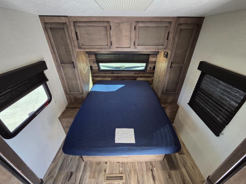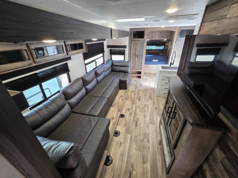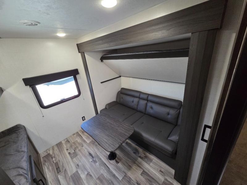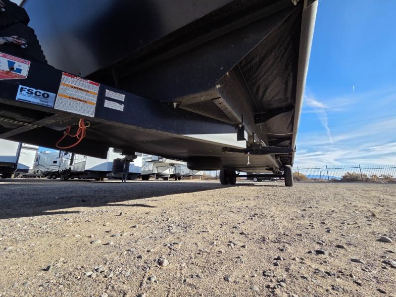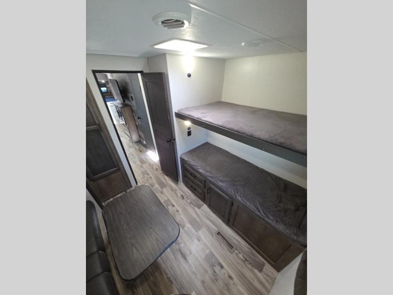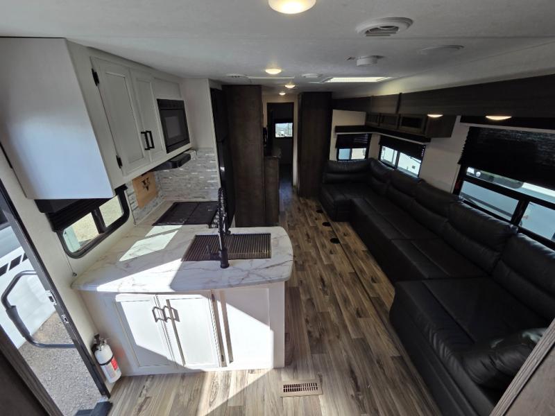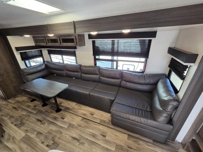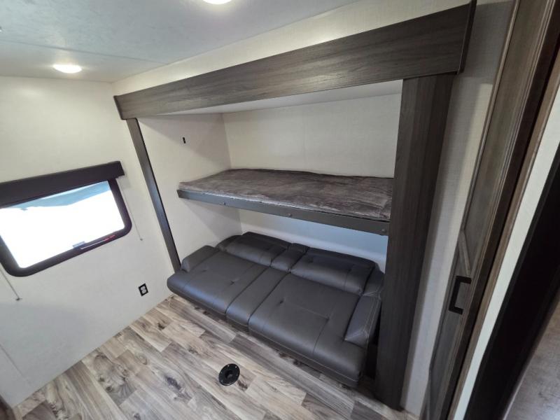 Pack your bags and load up for a great weekend getaway with the whole family in this travel trailer! The rear private bunkhouse is big enough for all of the kids or guests to stay with a set of bunk beds, a 28" x 73" top bunk above a 70" sofa with table slide, and a wardrobe to keep their clothes out of the way. The full bathroom not only has a 30" x 36" shower to freshen up in, but also a dresser, coat hooks, an entrance/exit door, and an area prepped to add an optional washer and dryer. The chef can prepare meals either indoor with the three burner cooktop or at the outside campfire café which even has an exterior 40" TV for you to watch the morning news while cooking pancakes on the griddle!