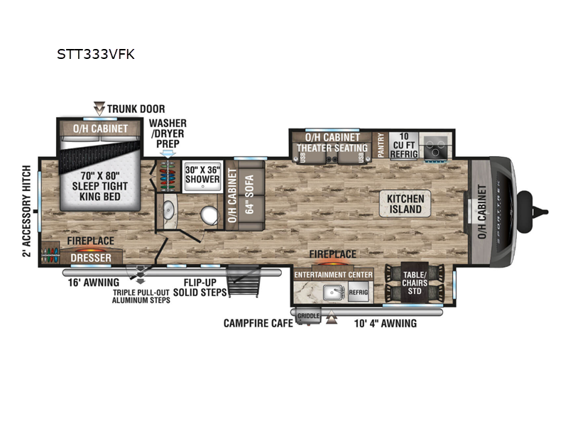 Comfort and convenience is what you will find all throughout this travel trailer! The front kitchen has a large single-bowl under-mount stainless steel sink with lots of countertop space on either side of it, a three burner cooktop, a 10 cu. ft. refrigerator to keep your perishables fresh, a pantry for your snacks, and a kitchen island to make meal prepping even easier. You can enjoy your meals at the table and chairs then relax on either the 64" sofa or theater seating with USB charging ports. You will feel right at home in the rear private bedroom with a 70" x 80" Sleep Tight king bed slide, a dresser with a 30" frameless fireplace, and a wardrobe that is prepped to add an optional washer and dryer, plus you even have an entrance/exit door to the unit with triple pull-out aluminum steps. There is an exterior campfire café with a refrigerator, a sink with countertop space, and a griddle for juicy burgers!