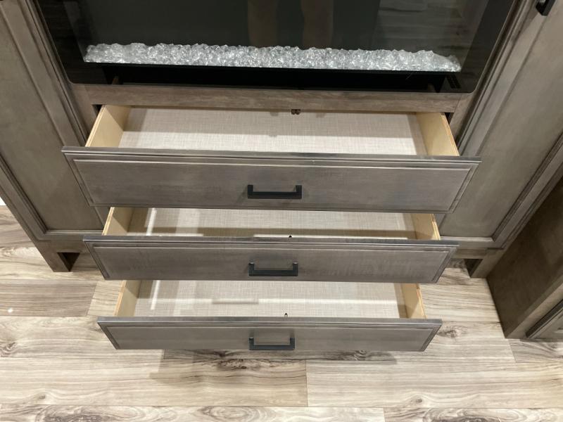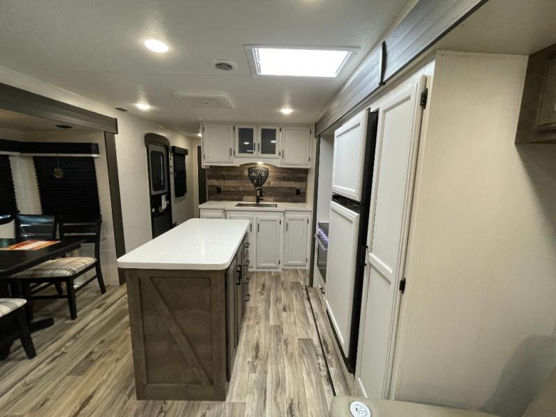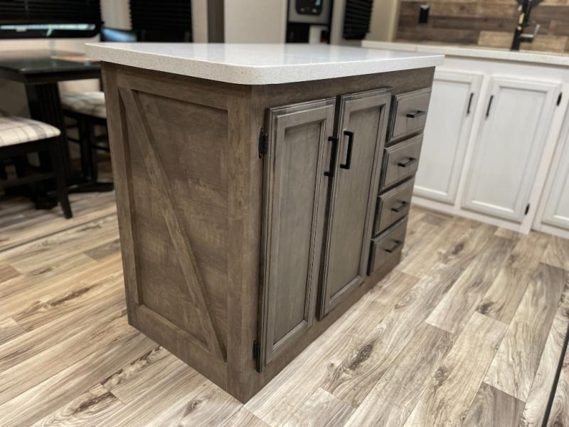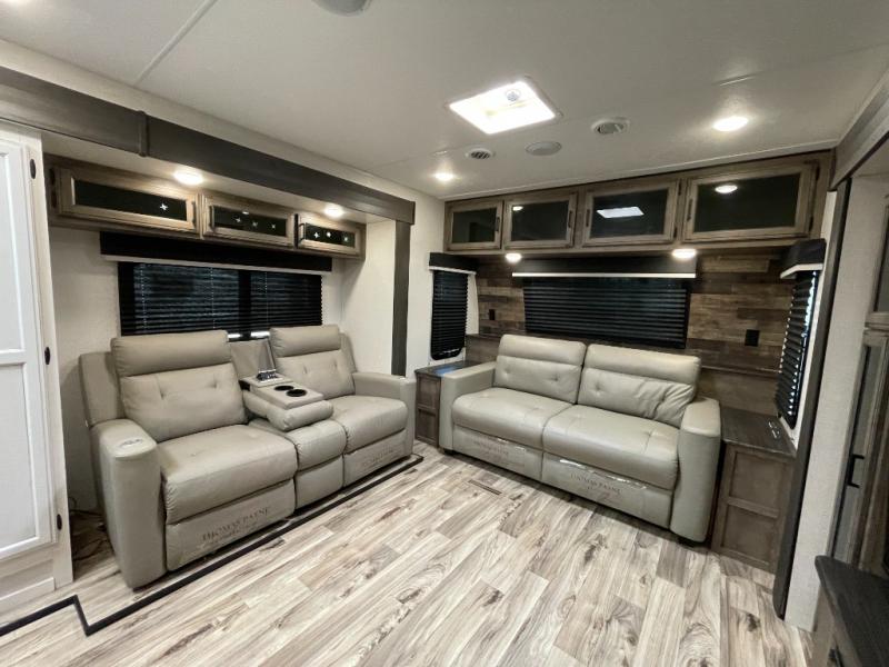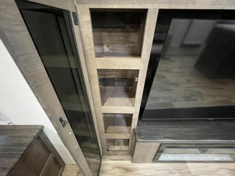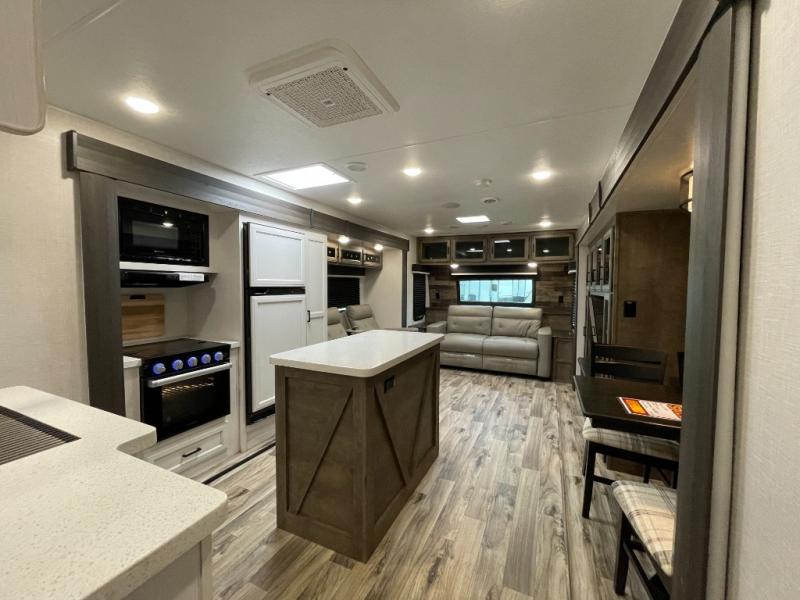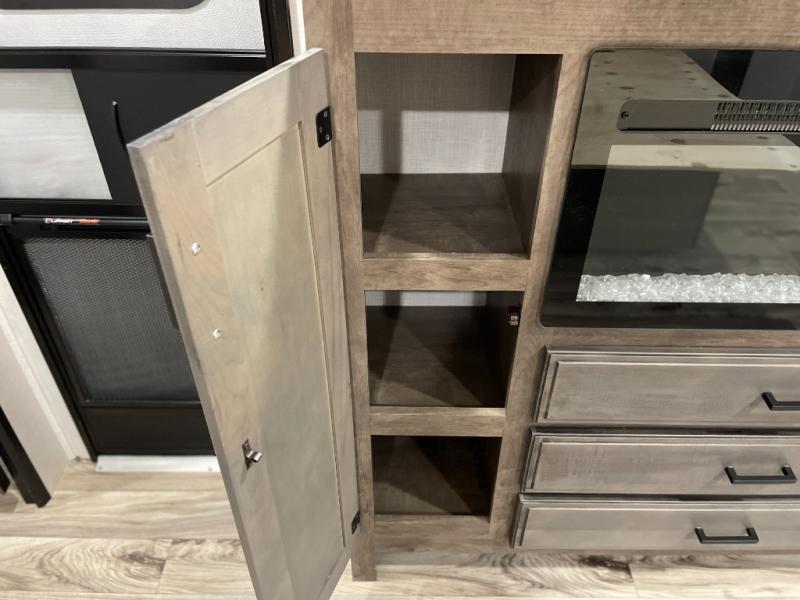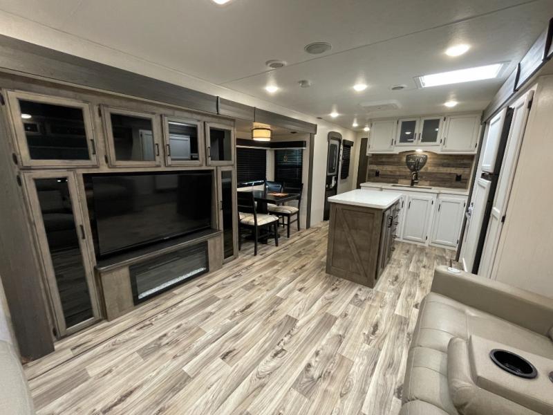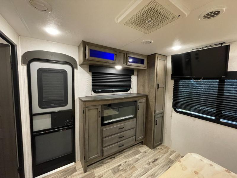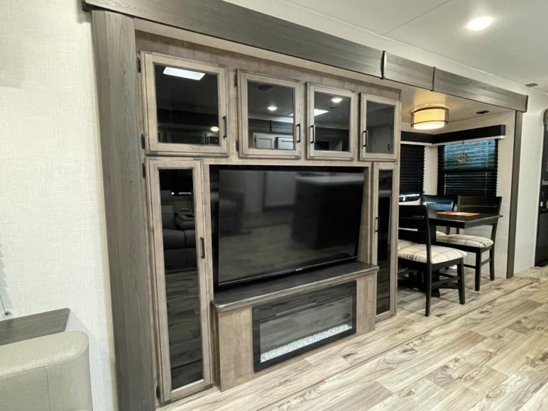 Come see why this travel trailer was awarded the "2022 Top RV Debut" by RV Business! Relax in true comfort in the front living area with a 70" tri-fold sofa with end tables on either side or in the theater seating across from the entertainment center with a TV and 30" frameless fireplace. The kitchen island will make your meal prepping easier and you can enjoy them at the table and chairs then play a card game or two. You could even cook your meals at the exterior campfire café with a refrigerator, a sink with countertop space, and a griddle. The full bathroom has a 30" x 36" shower for you to freshen up in each morning. Enjoy a good night's rest each night on the 70" x 80" sleep tight king bed slide across from a dresser with a 30" frameless fireplace in the rear private bedroom, plus there is a wardrobe with washer and dryer prep and one of the dual entry doors with triple pull-out aluminum steps!